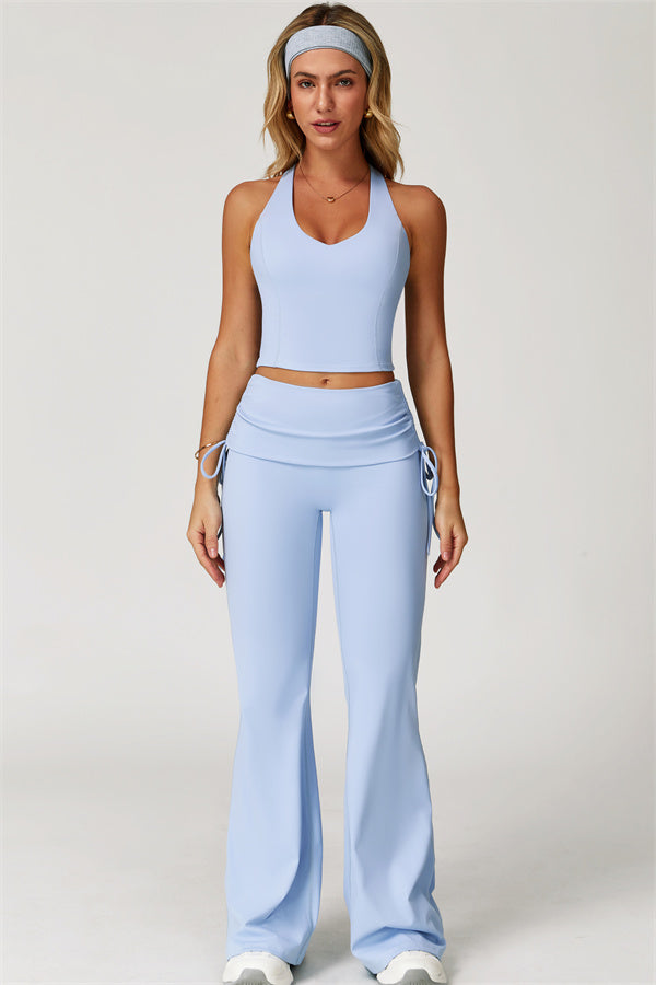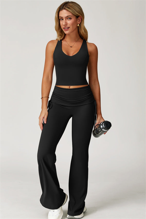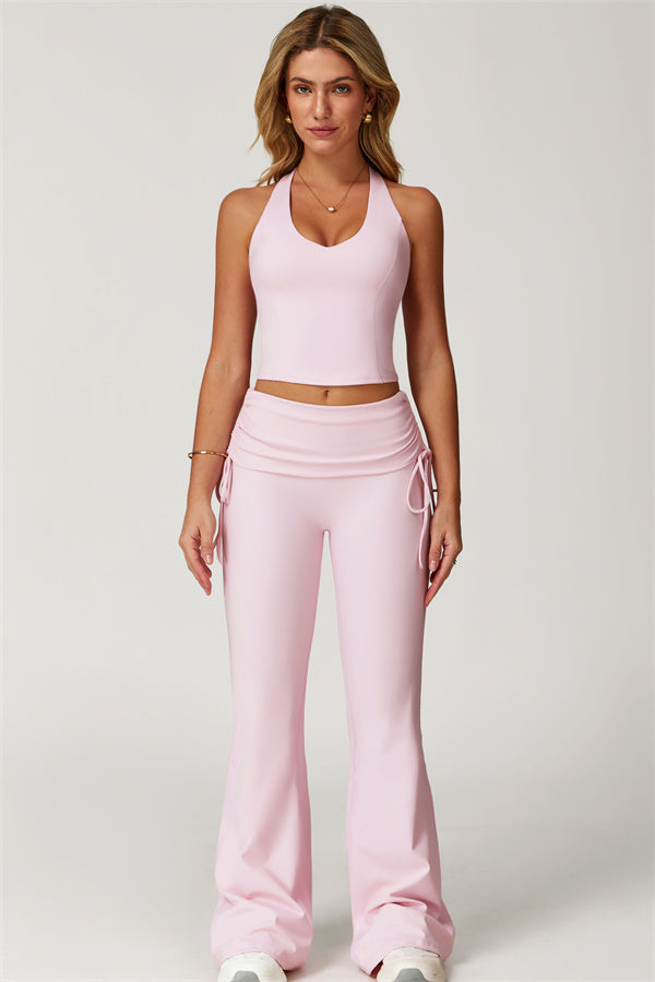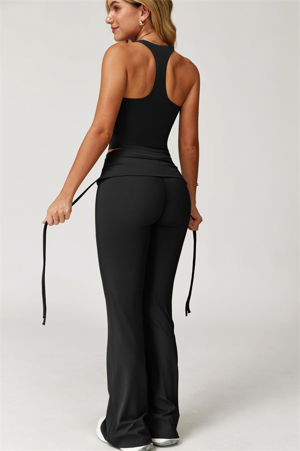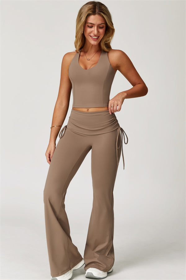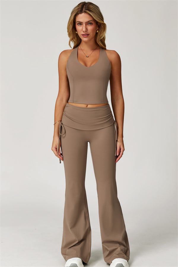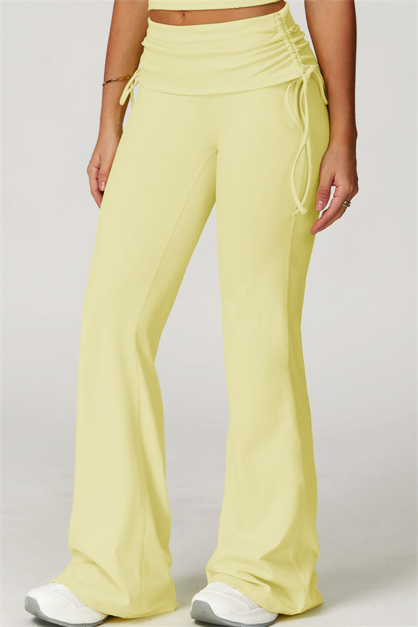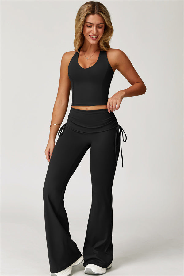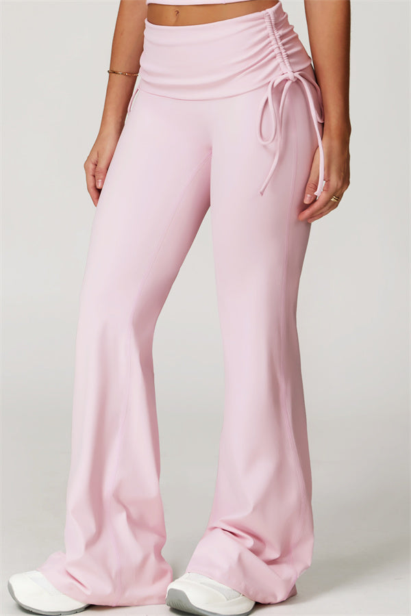 Designed with a fold-over waistband, The Echo Flared Leggings comfortably conceal the tummy while offering adjustable side drawstrings to customize height and fit. The flared leg silhouette elongates your legs for a sleek, stylish look.