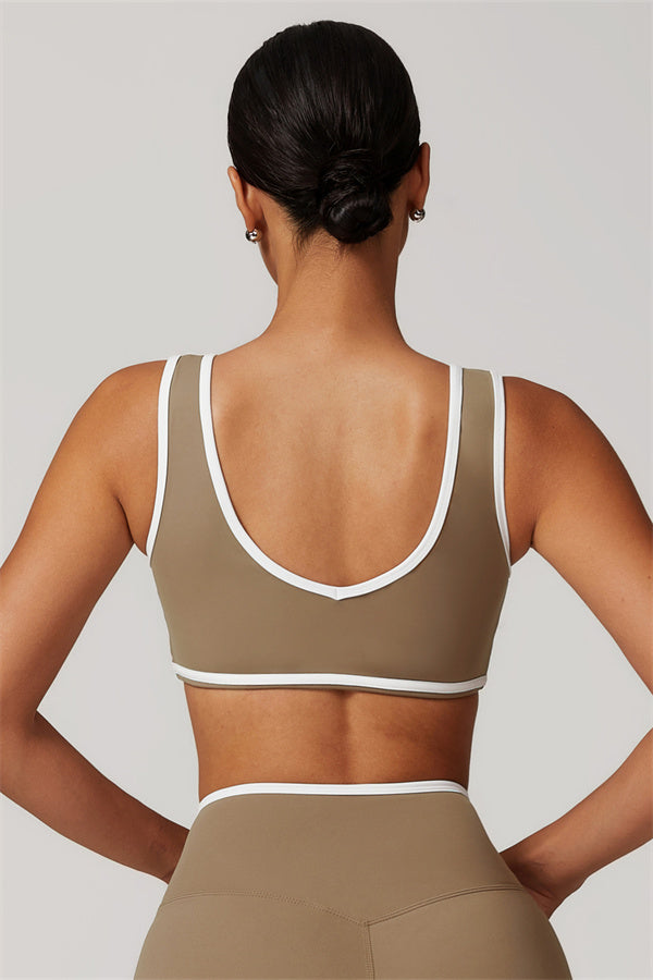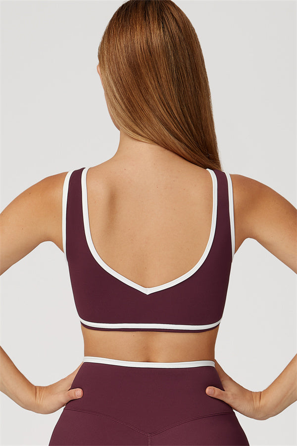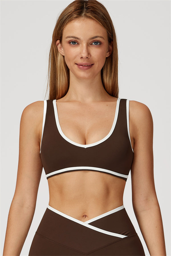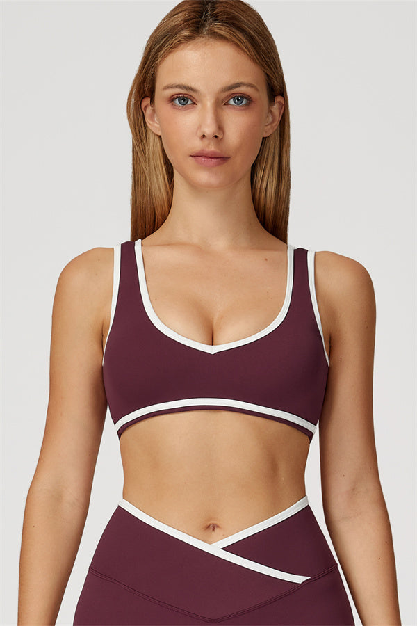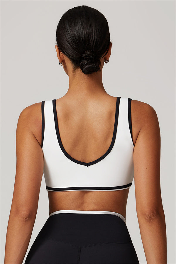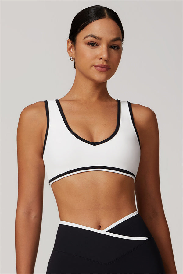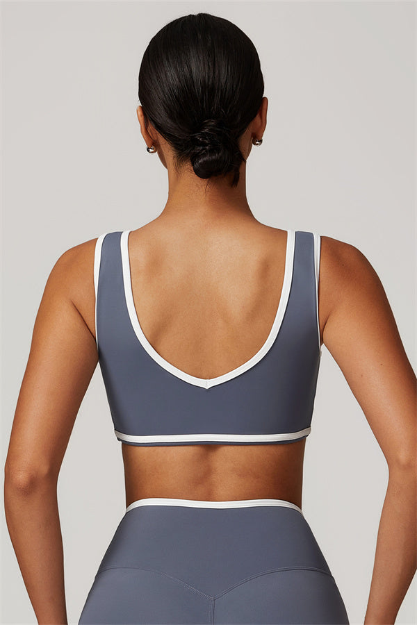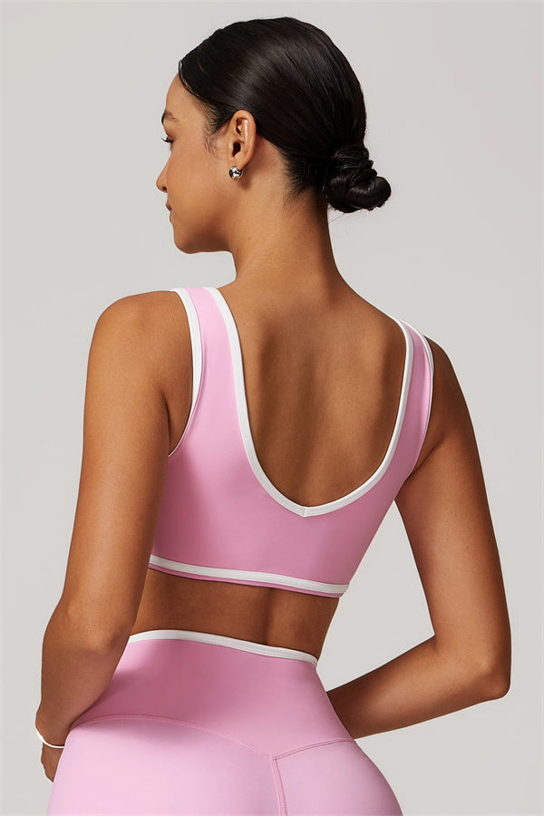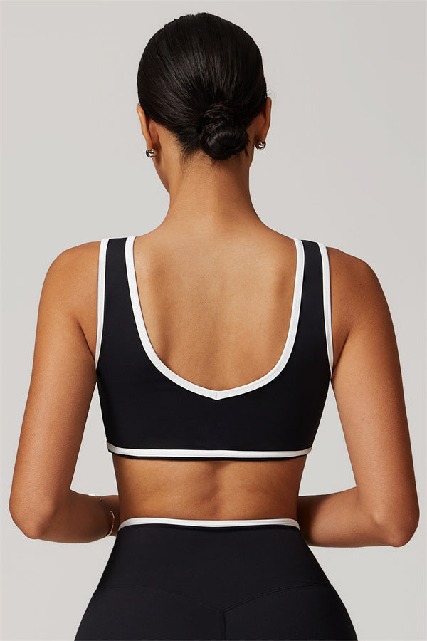 Featuring a vibrant color-blocked design that adds depth and style to your workout wardrobe. The U-shaped neckline beautifully highlights your collarbones, while the hollow back showcases your elegant shoulder blades for a touch of allure.
