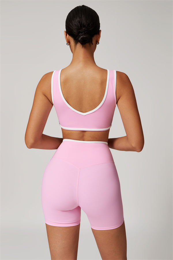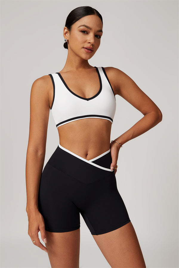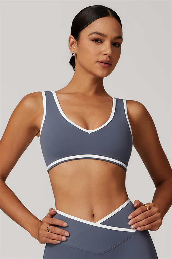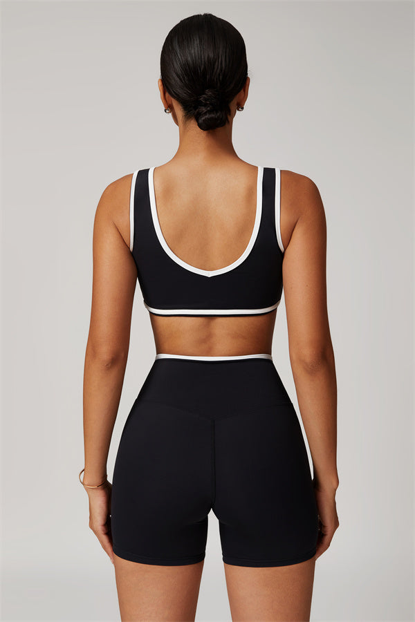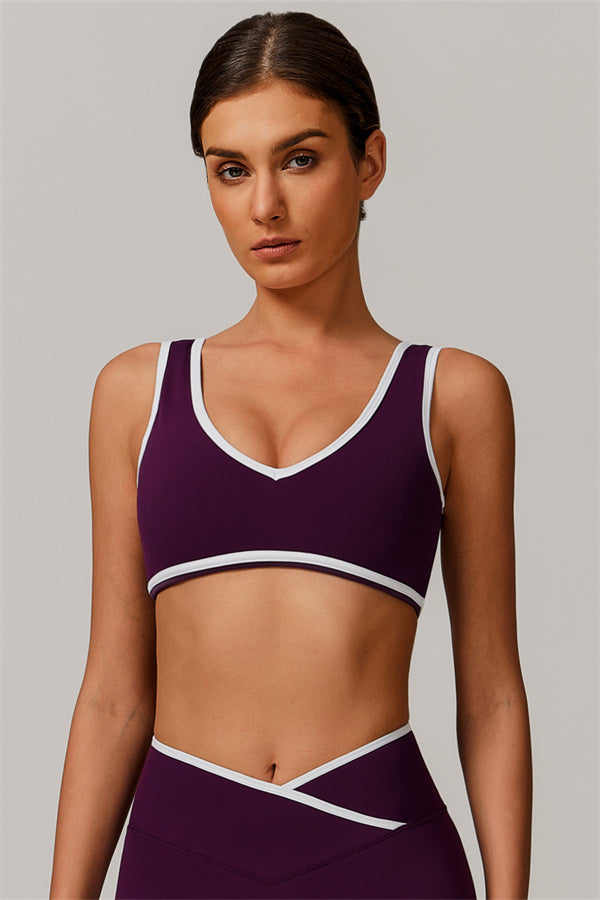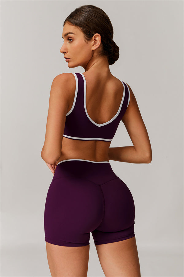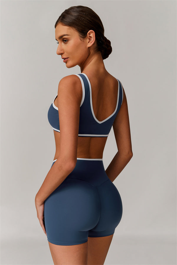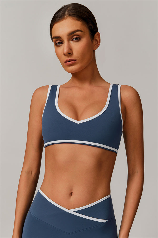 Featuring a vibrant color-blocked design that adds depth and style to your workout wardrobe. The U-shaped neckline beautifully highlights your collarbones, while the hollow back showcases your elegant shoulder blades for a touch of allure.