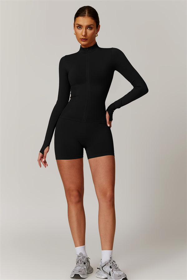 Stay stylish and comfortable with this full-zip matching set, featuring a high-neck jacket and high-waisted shorts designed for an active lifestyle. The jacket's high neck and full-zip closure offer adjustable coverage and wind resistance, giving you a cool, sporty look. A ribbed, cinched waist enhances your curves, creating a slimming effect that flatters your natural silhouette. Thumbhole cuffs provide added stability and keep your sleeves in place while protecting your hands.