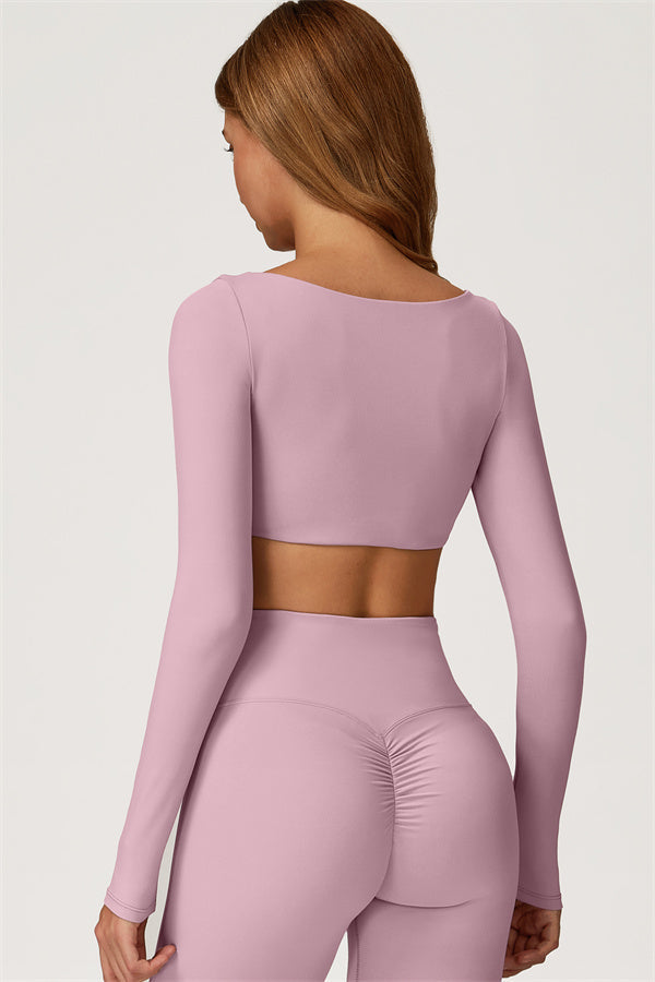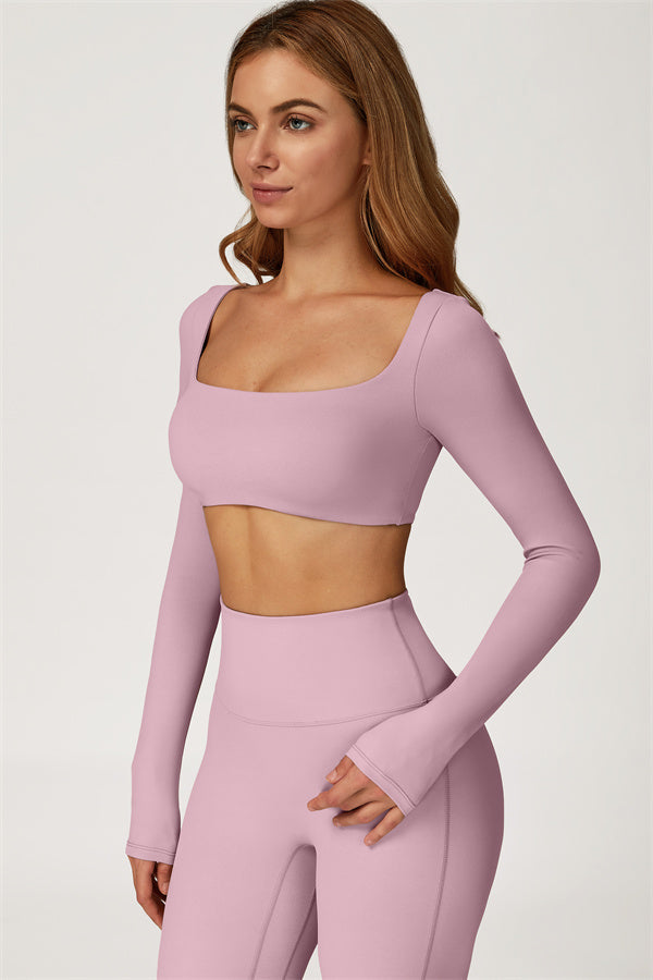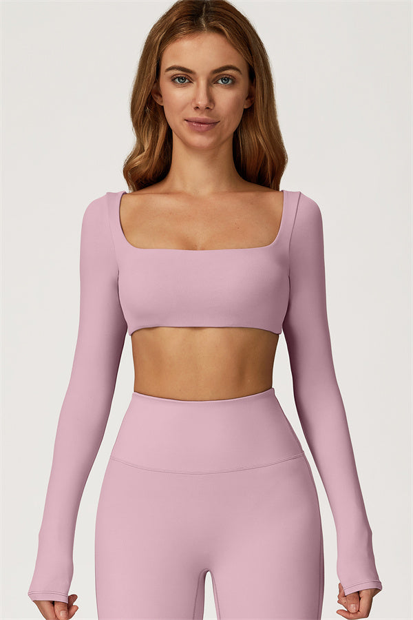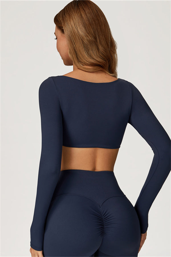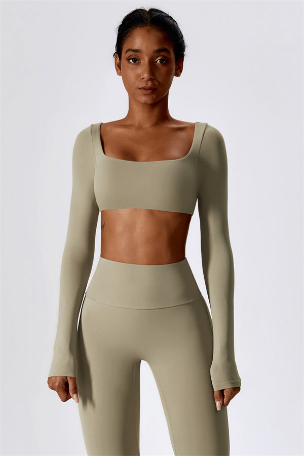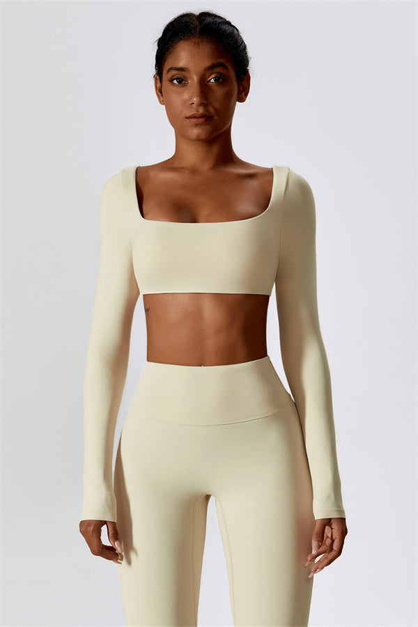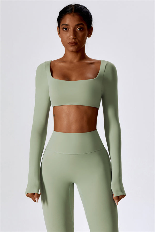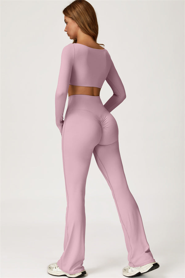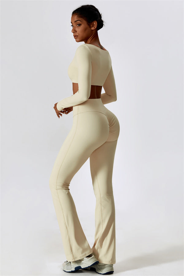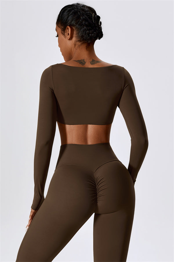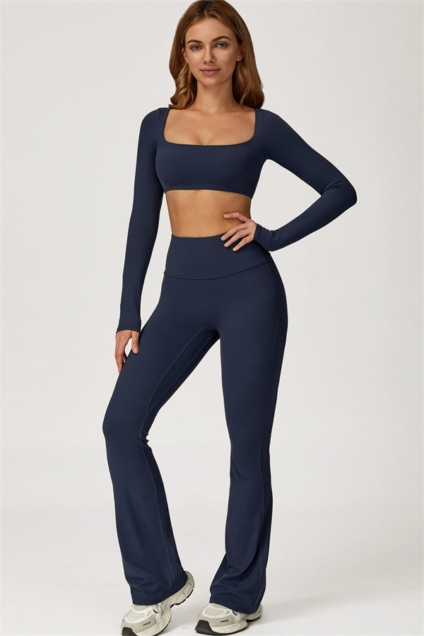 This stylish matching set, featuring a long sleeve top and leggings, is designed to enhance both comfort and performance. The top features a flattering wide neckline that perfectly fits your shoulders, while its mid-length cut subtly highlights your waistline. The sculpted design of the leggings with a gathered waistband accentuates your curves and lifts your booty for a beautifully contoured shape.