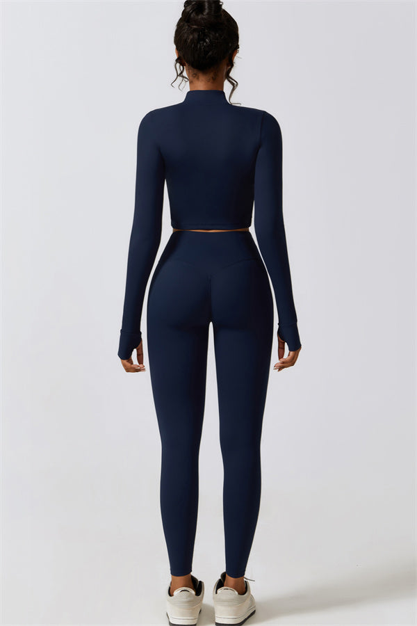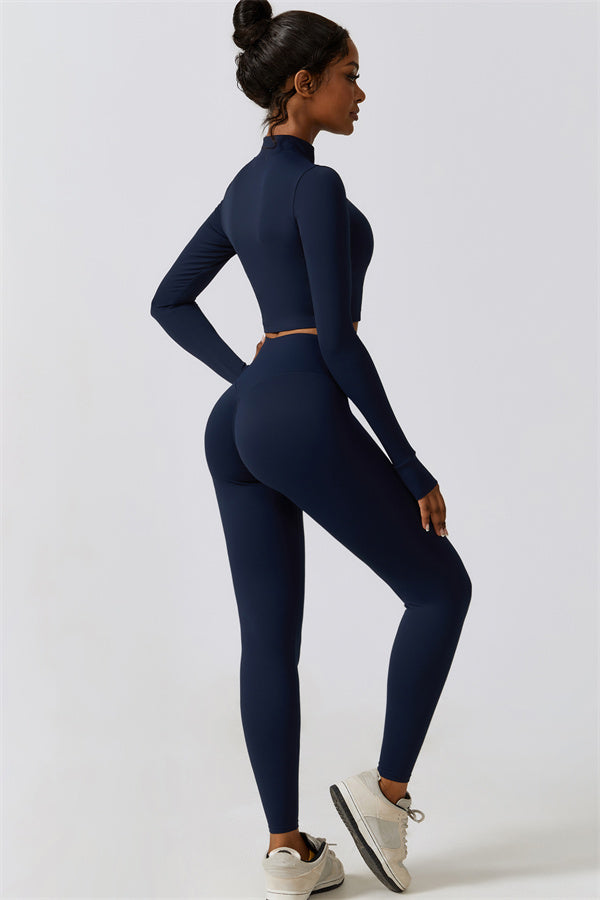 This matching set, including a sports bra, jacket, and leggings, is designed to elevate your performance and style. The sports bra features curved seams along the front, enhancing and supporting your shape with a flattering, natural lift. The leggings are engineered with a back ruching detail that effortlessly contours to create a peachy, sculpted look. Crafted from durable, resilient fabric, this set is built to keep its shape, offering maximum flexibility and resistance to wear.