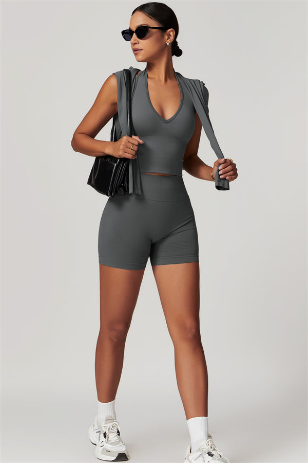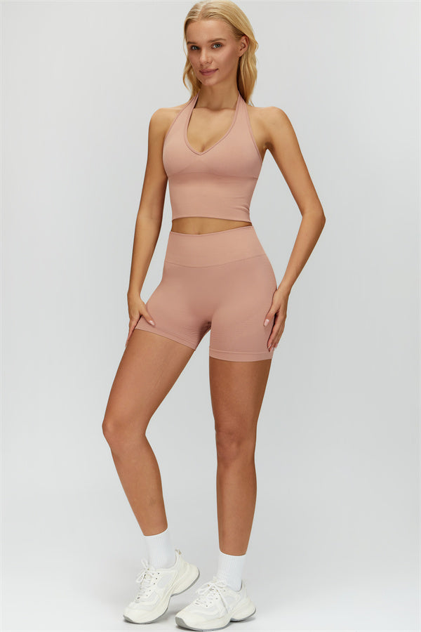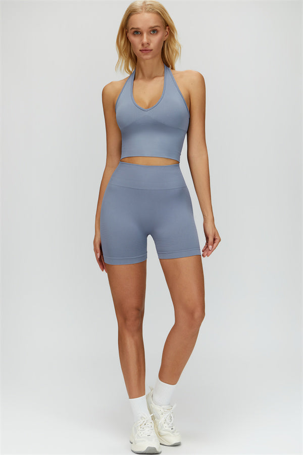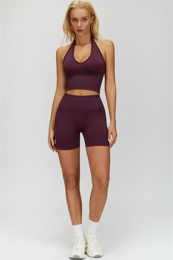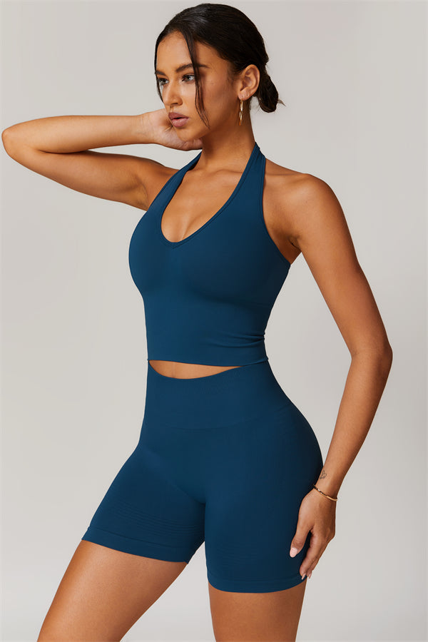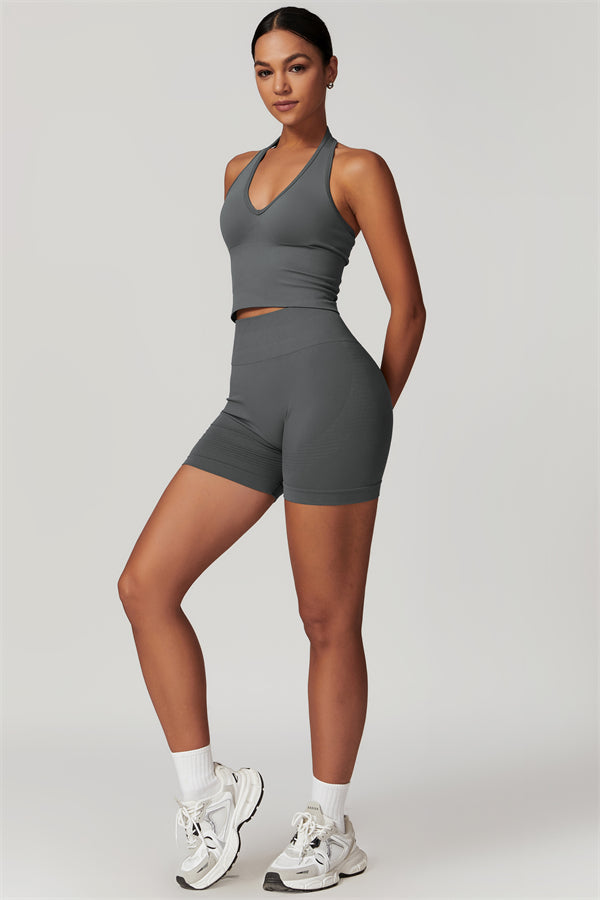 Show off your curves with this elegant and functional matching set, featuring a halter top and shorts crafted for both style and performance. The halter top boasts a deep V-neckline that highlights your collarbones for a touch of sophistication, while the ribbed design adds texture and visual appeal. The high-waisted shorts are designed with a vertical ribbed waistband, providing a secure fit that sculpts your waistline and offers a flattering, streamlined look.