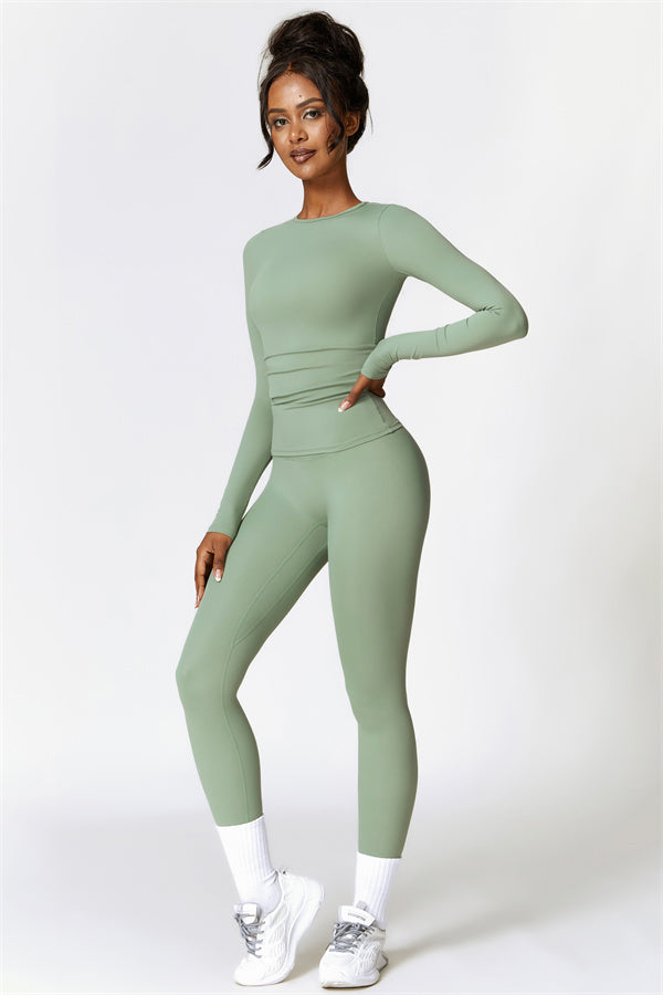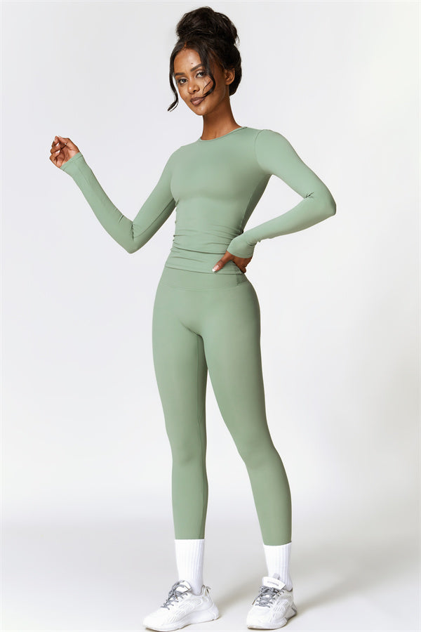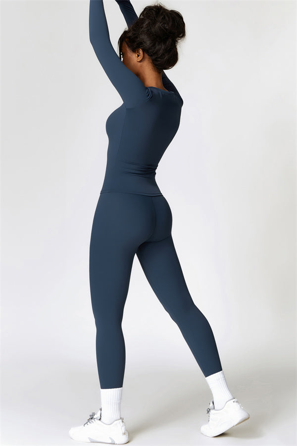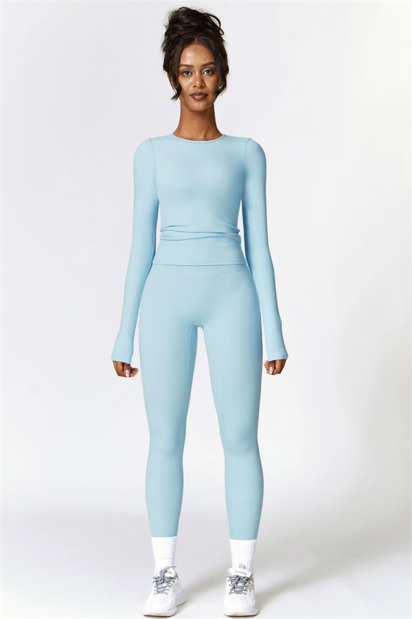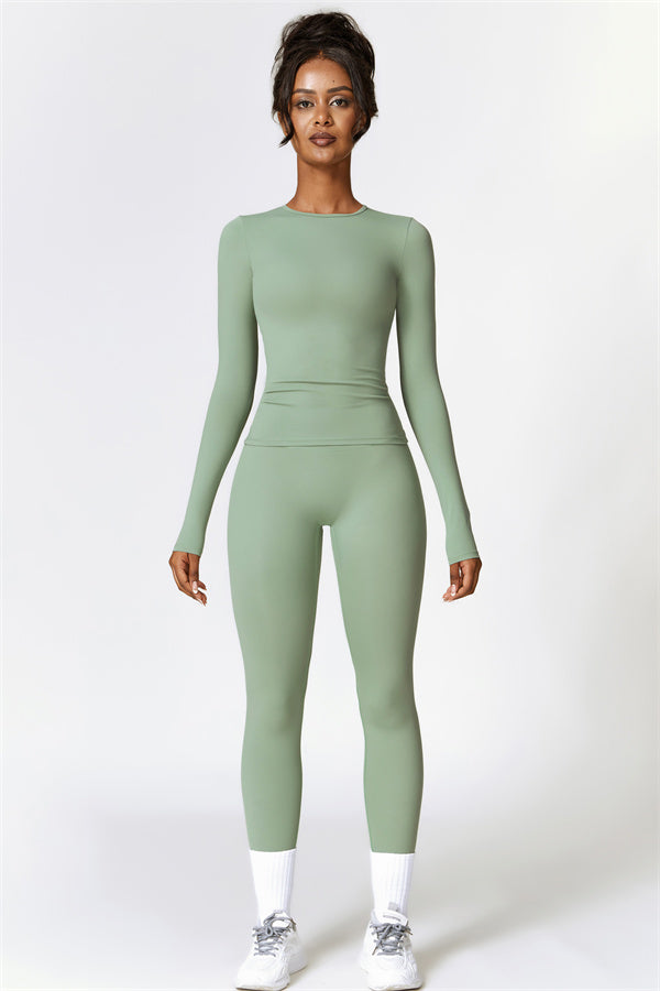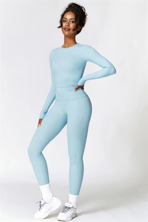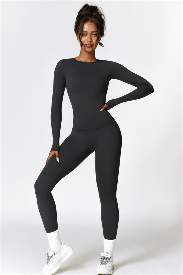 This matching set, featuring a long sleeve top and leggings, combines style and performance to keep you comfortable throughout your workout. The top is designed with a classic round neckline that beautifully frames and enhances the neck area. The leggings feature a flattering design that highlights your curves, helping you achieve a peachy, sculpted look with ease.