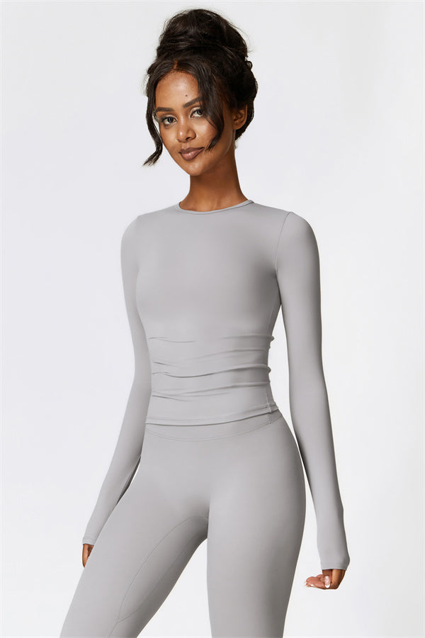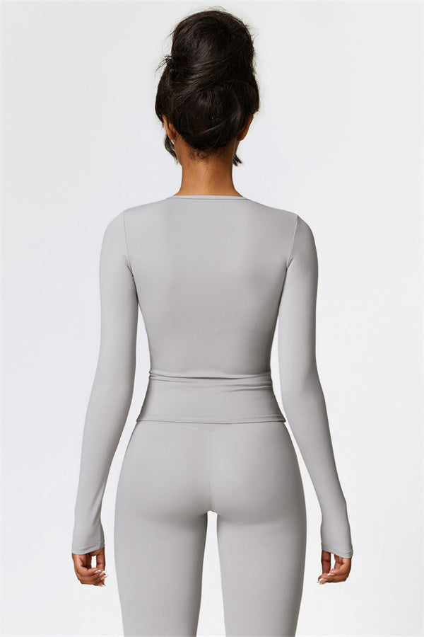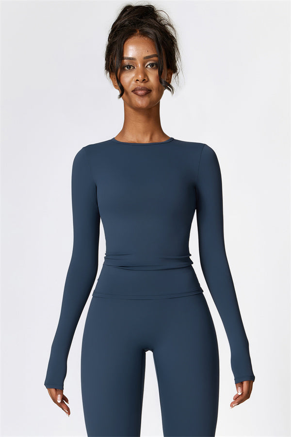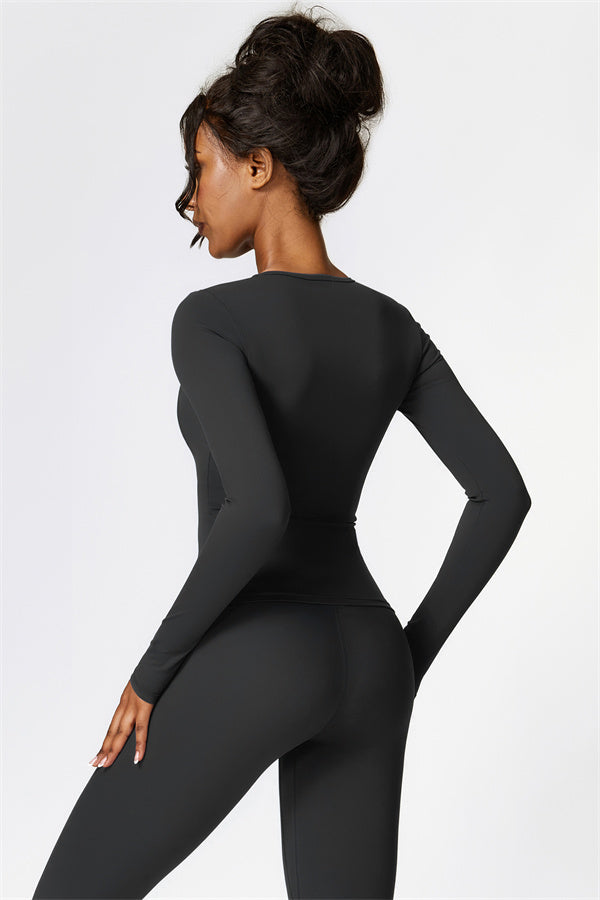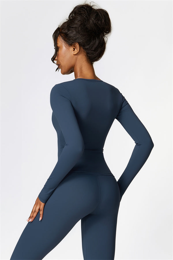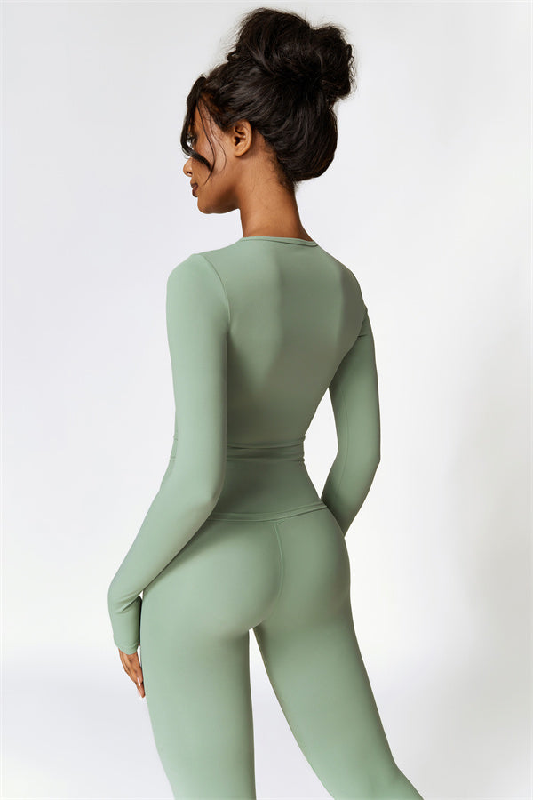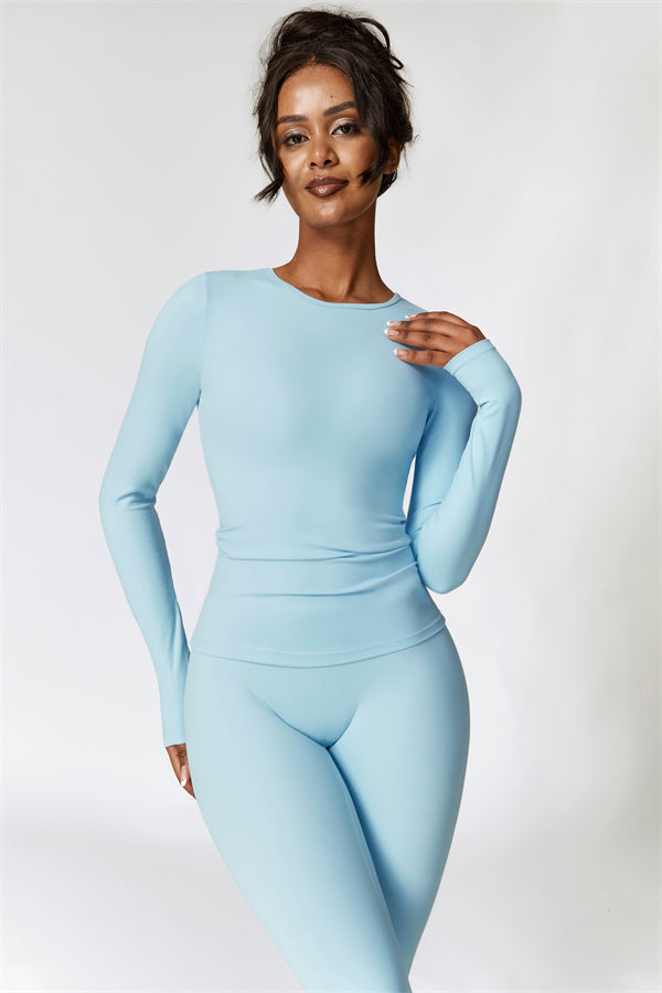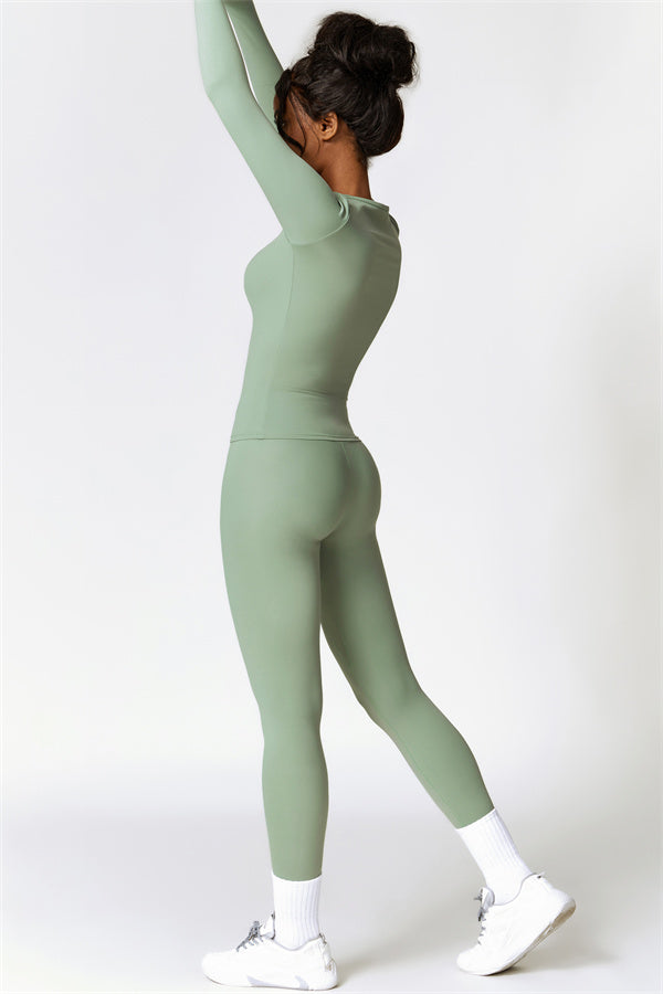 This matching set, featuring a long sleeve top and leggings, combines style and performance to keep you comfortable throughout your workout. The top is designed with a classic round neckline that beautifully frames and enhances the neck area. The leggings feature a flattering design that highlights your curves, helping you achieve a peachy, sculpted look with ease.