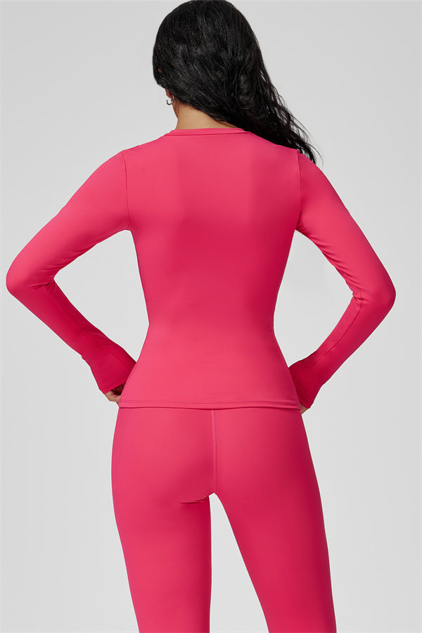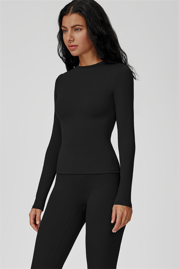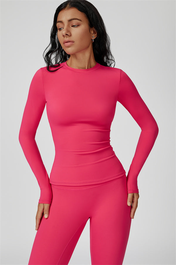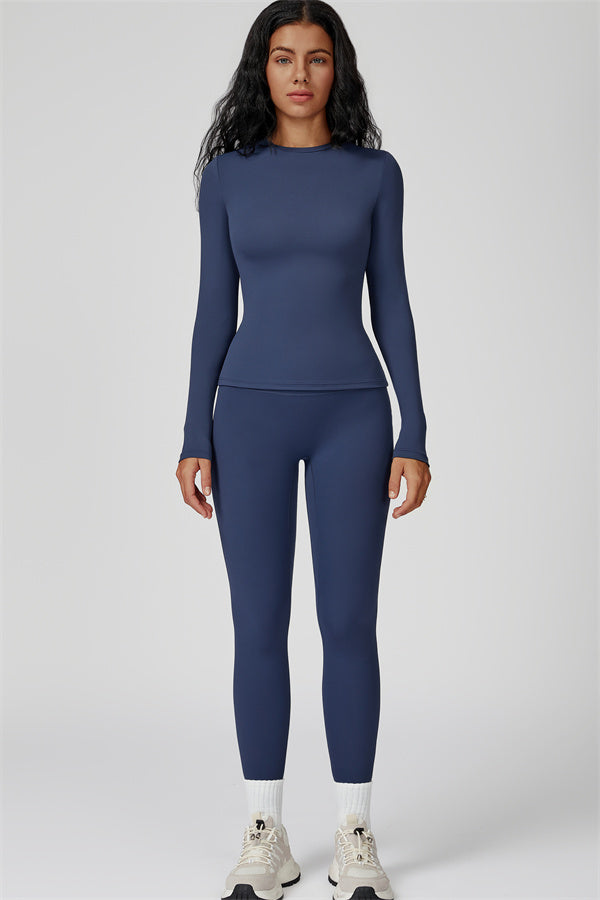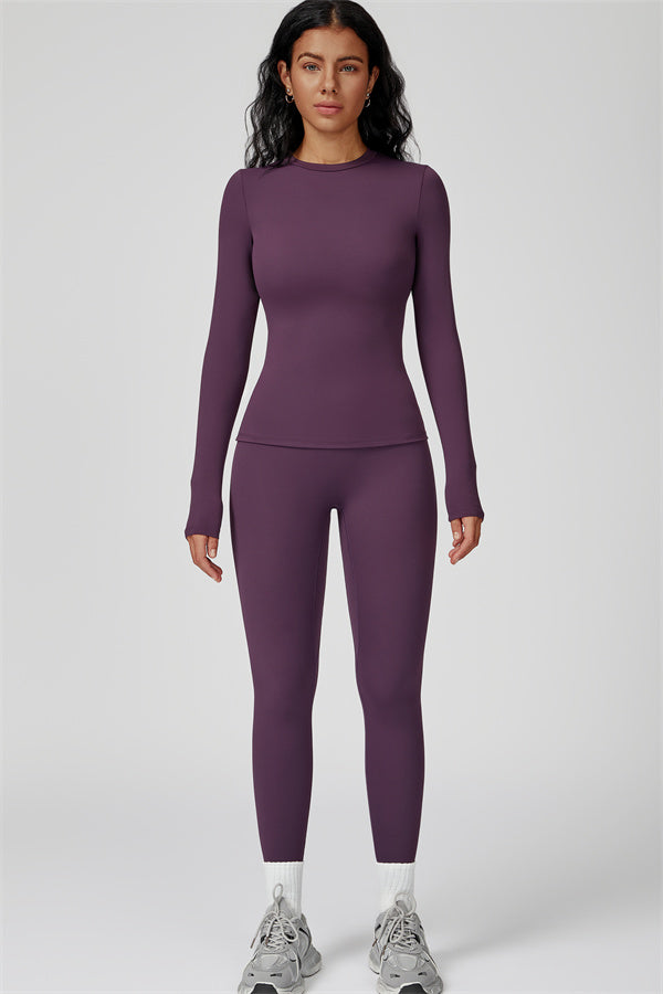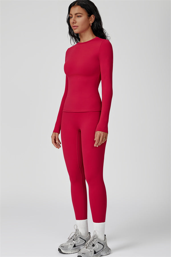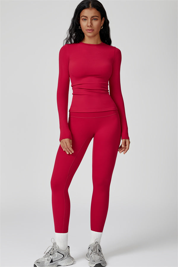 This sculpting set delivers a sleek, supportive silhouette from top to bottom. The Oasis Long Sleeve Set features a body-hugging tee and curve-enhancing leggings, perfect for training days or everyday styling with a sporty edge.