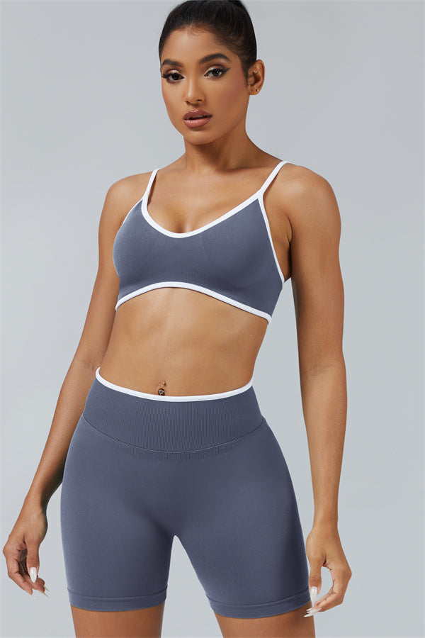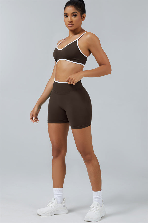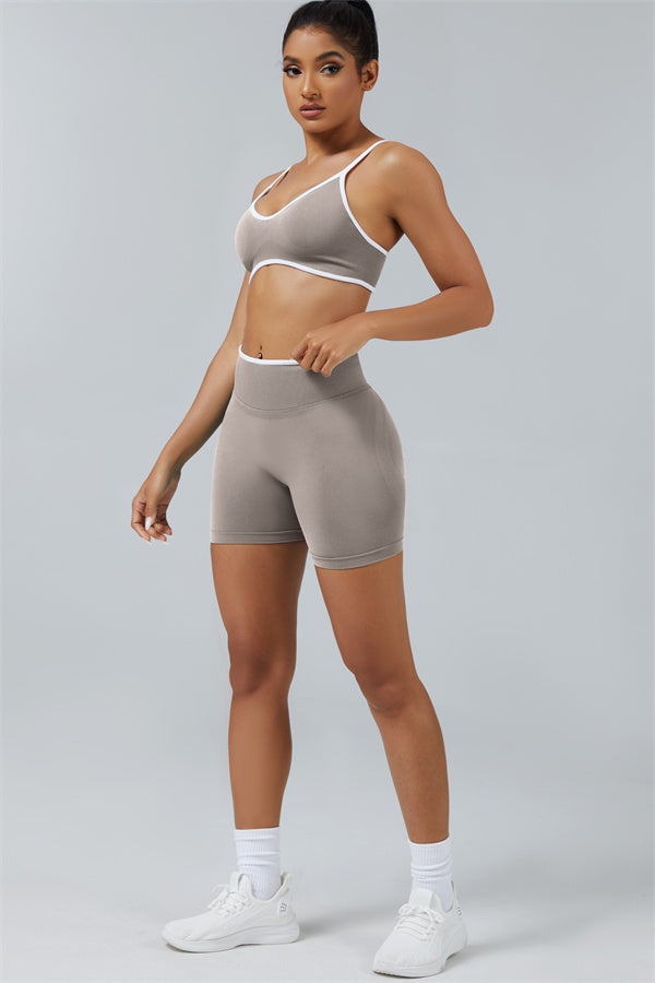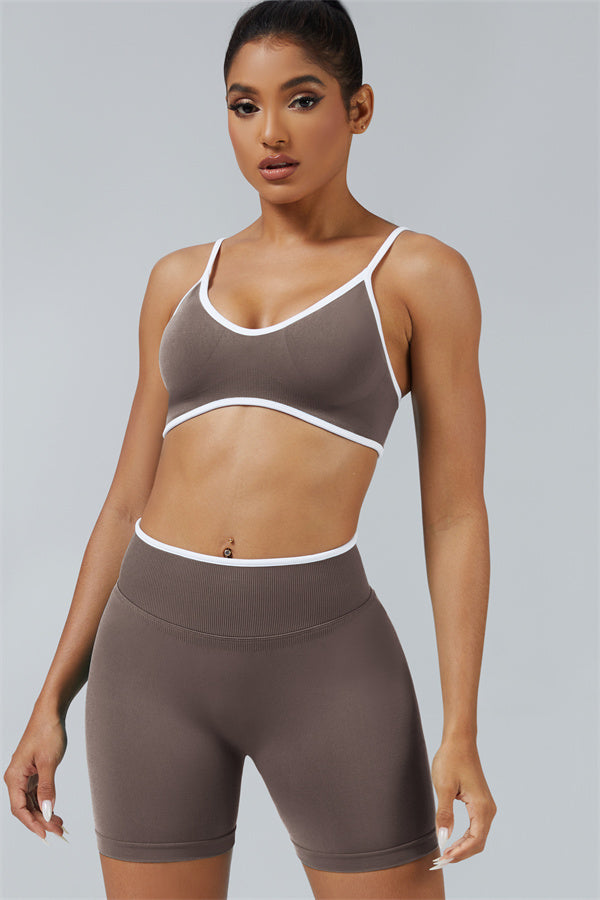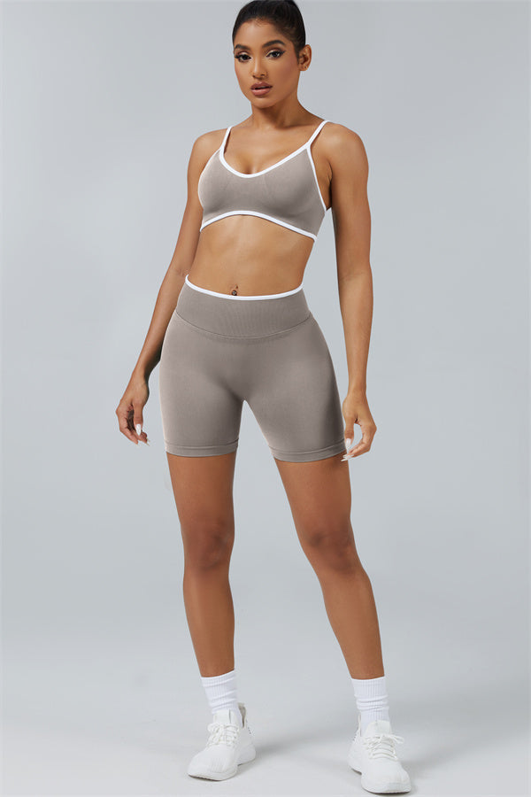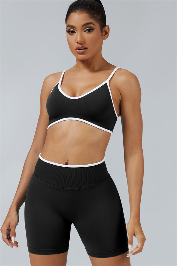 Elevate your workout style with this chic matching set, designed for both performance and fashion. The set includes a breathable sports bra and flattering shorts with sculpting details.