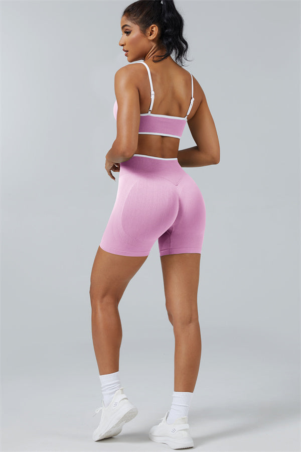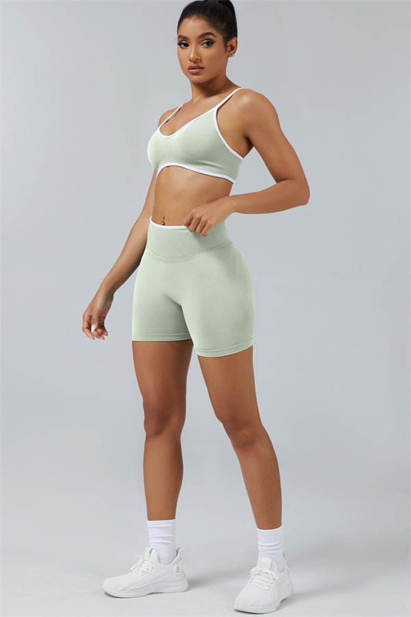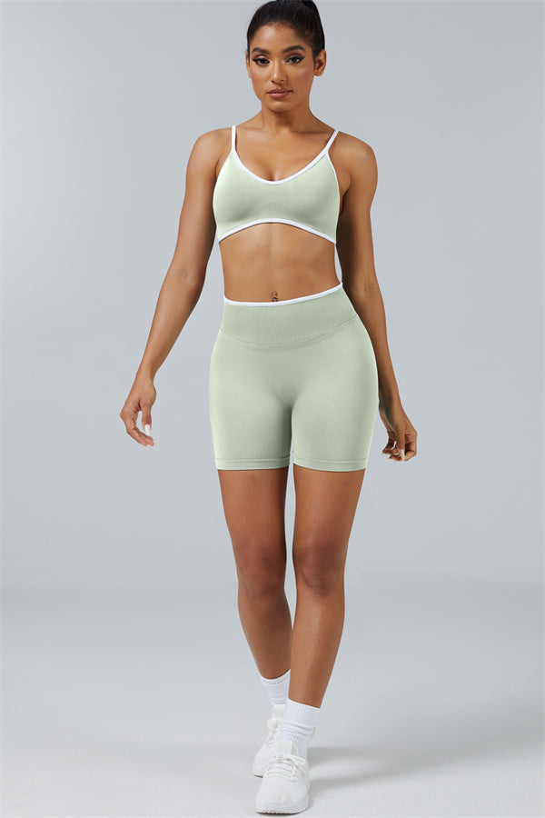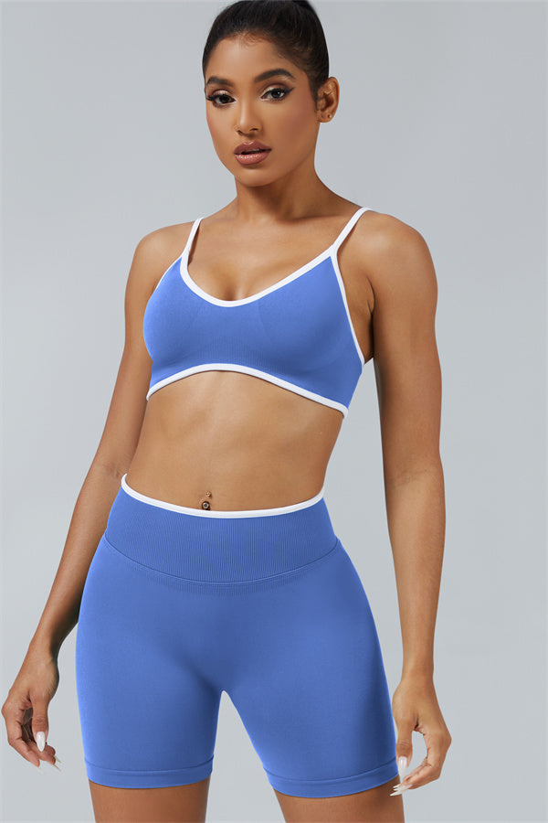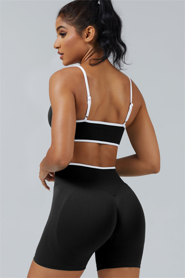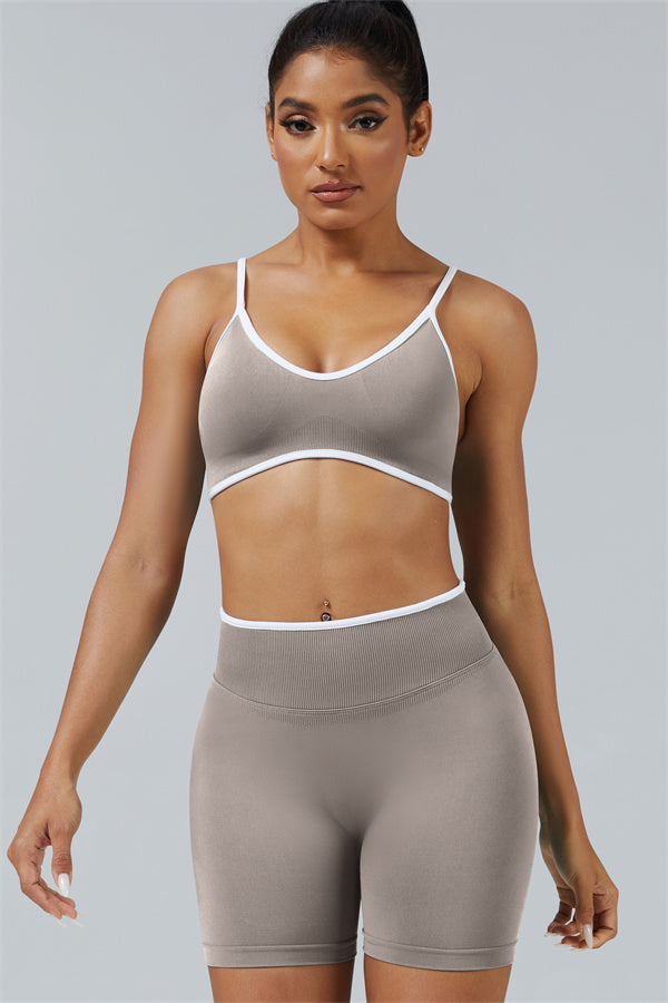 Elevate your workout style with this chic matching set, designed for both performance and fashion. The set includes a breathable sports bra and flattering shorts with sculpting details.