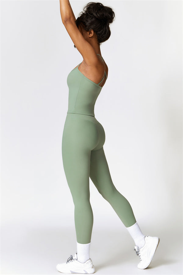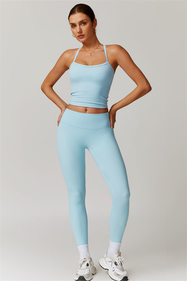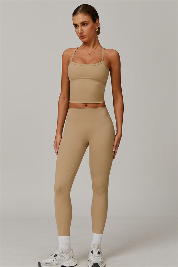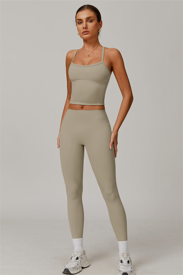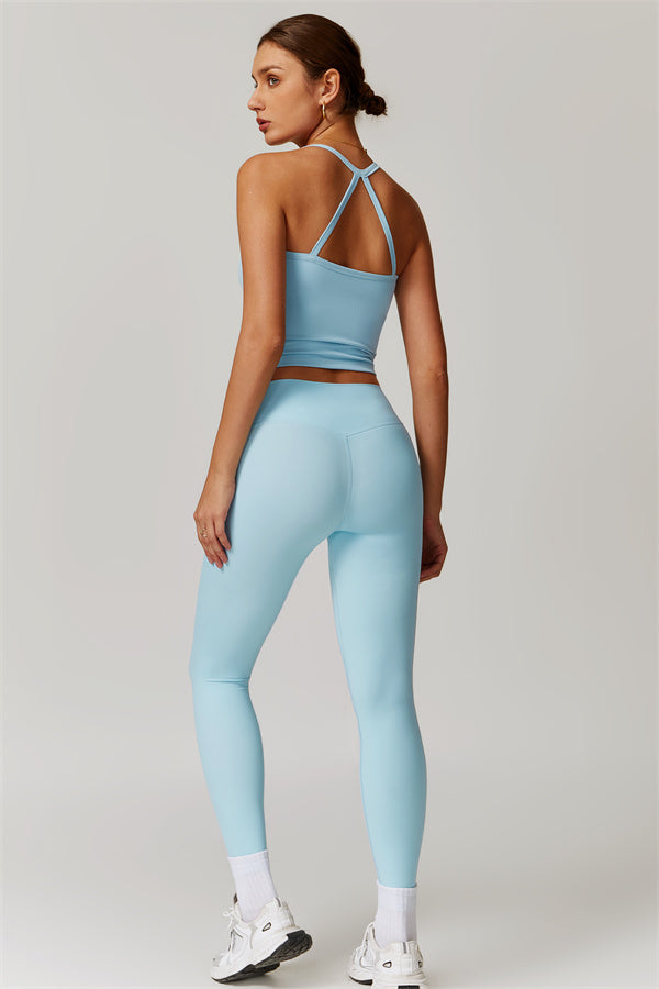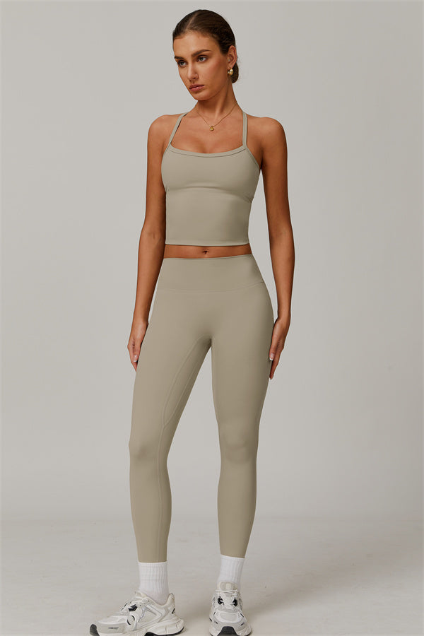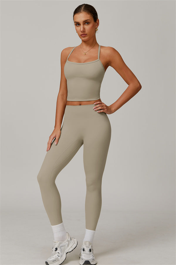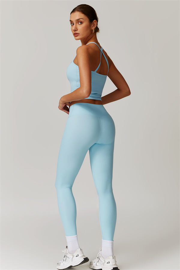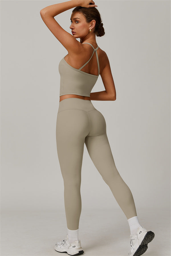 This matching set, featuring a crop top and leggings, is designed to enhance both style and performance. The crop top boasts a delicate cross-back design with thin straps, sculpting and highlighting your back's natural curves. Its breathable, moisture-wicking fabric keeps you cool and dry, while the flattering contour design of the leggings effortlessly creates a peachy, sculpted rear.