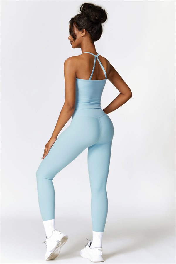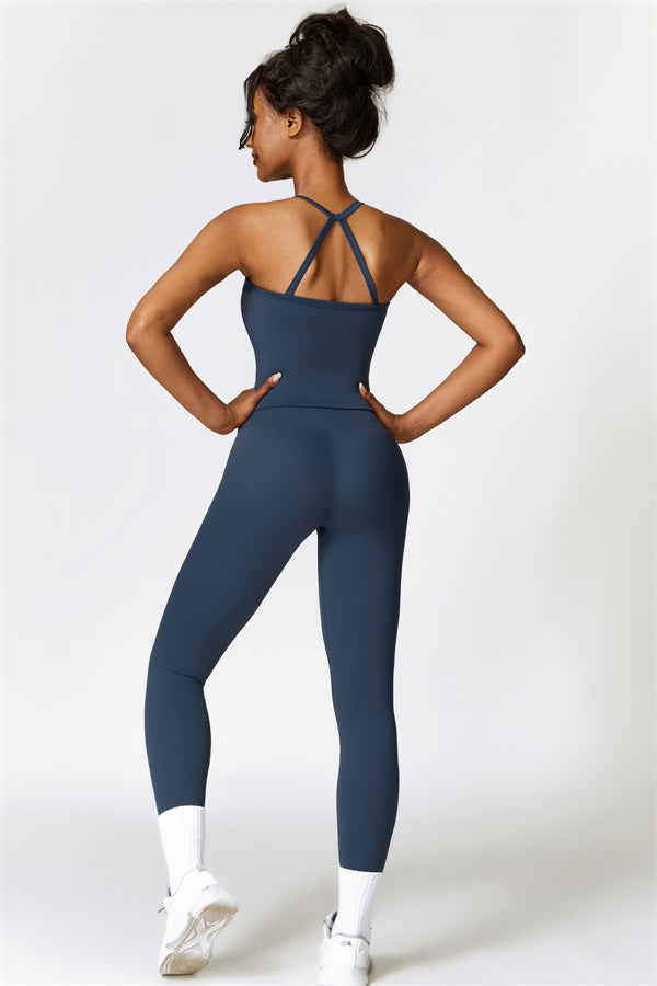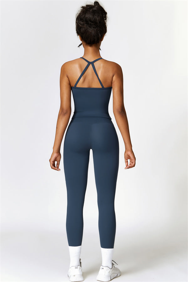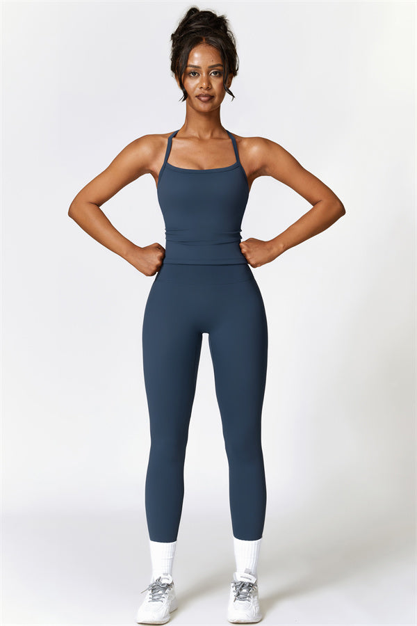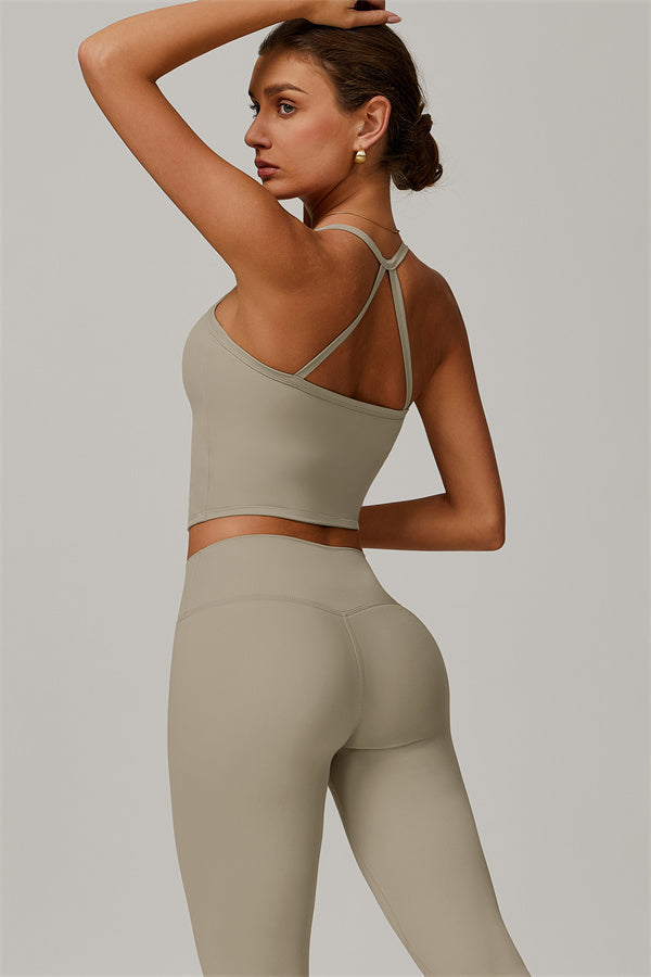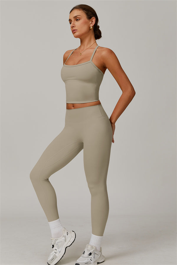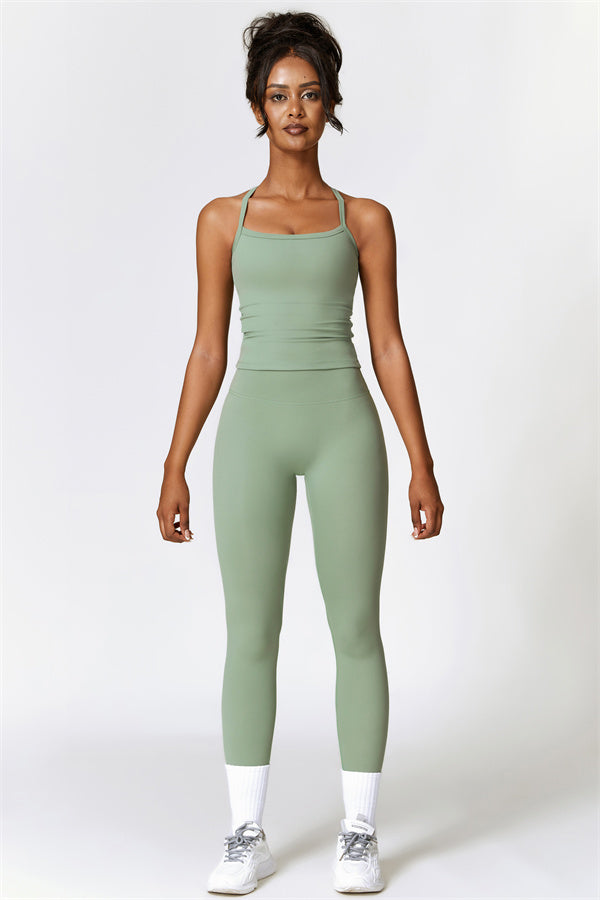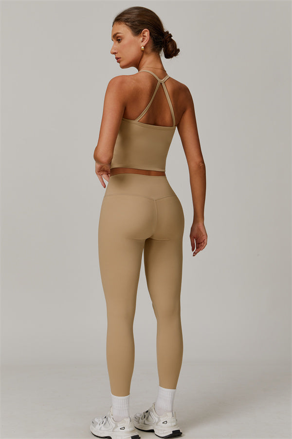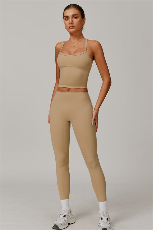 This matching set, featuring a crop top and leggings, is designed to enhance both style and performance. The crop top boasts a delicate cross-back design with thin straps, sculpting and highlighting your back's natural curves. Its breathable, moisture-wicking fabric keeps you cool and dry, while the flattering contour design of the leggings effortlessly creates a peachy, sculpted rear.