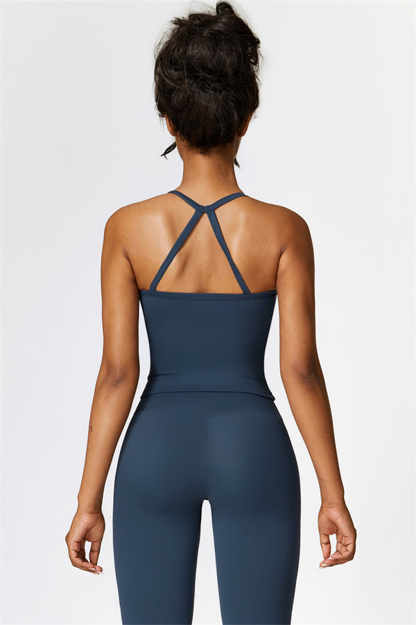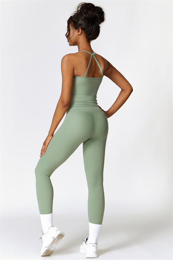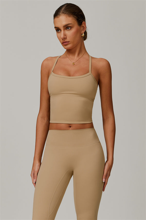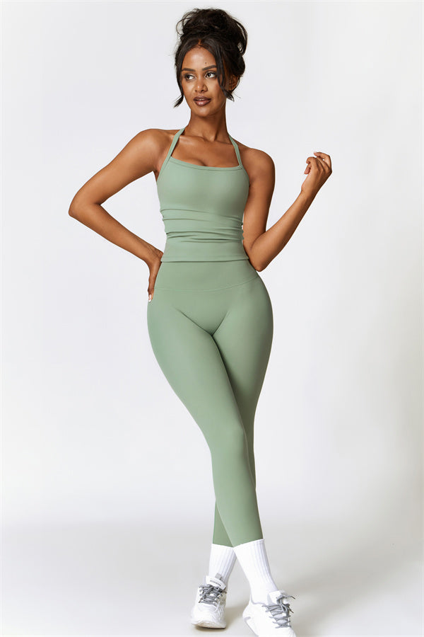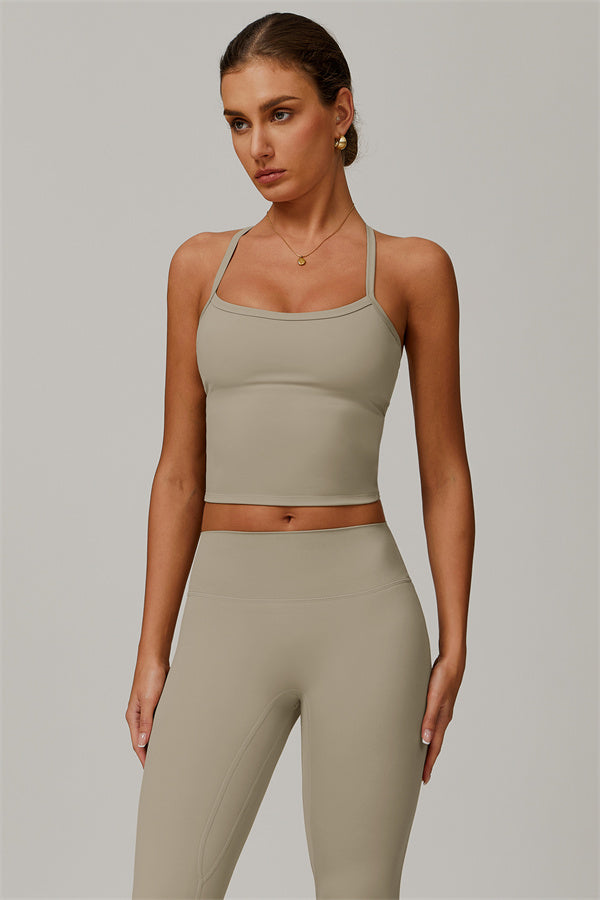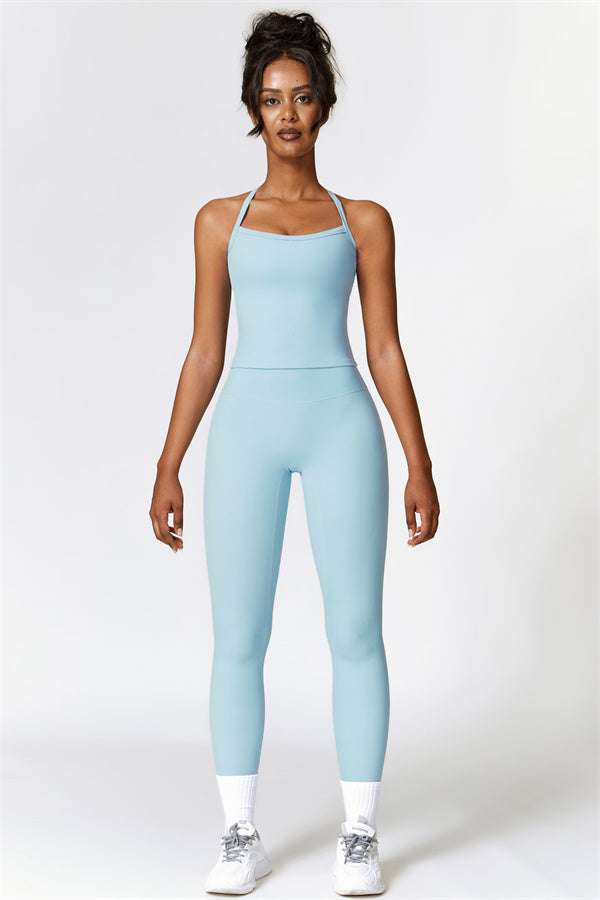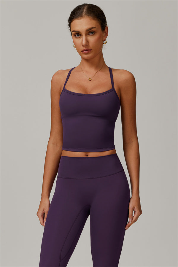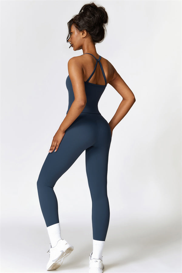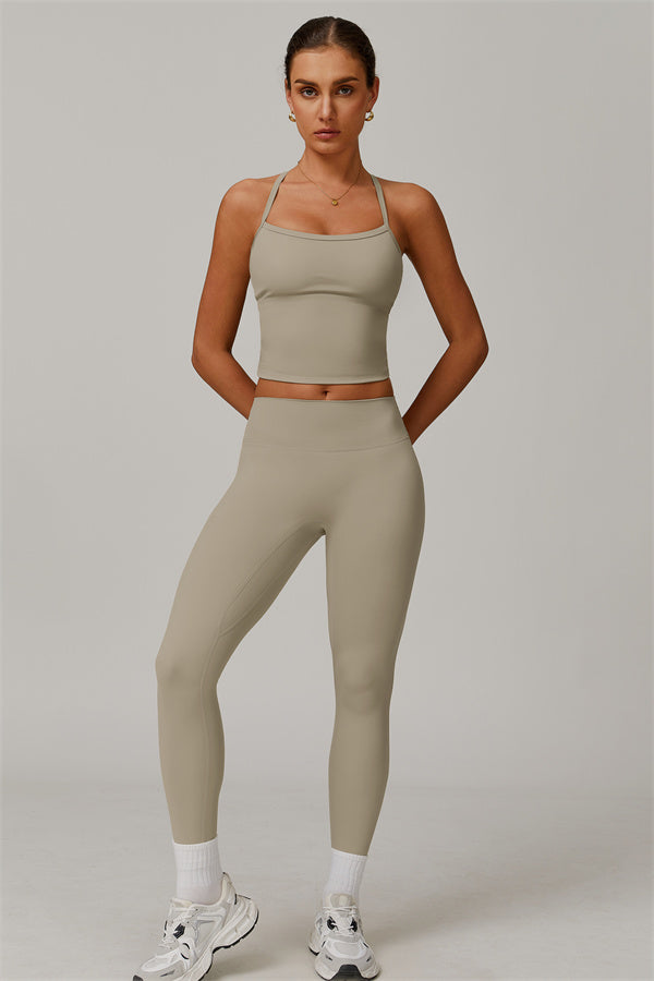 This matching set, featuring a crop top and leggings, is designed to enhance both style and performance. The crop top boasts a delicate cross-back design with thin straps, sculpting and highlighting your back's natural curves. Its breathable, moisture-wicking fabric keeps you cool and dry, while the flattering contour design of the leggings effortlessly creates a peachy, sculpted rear.