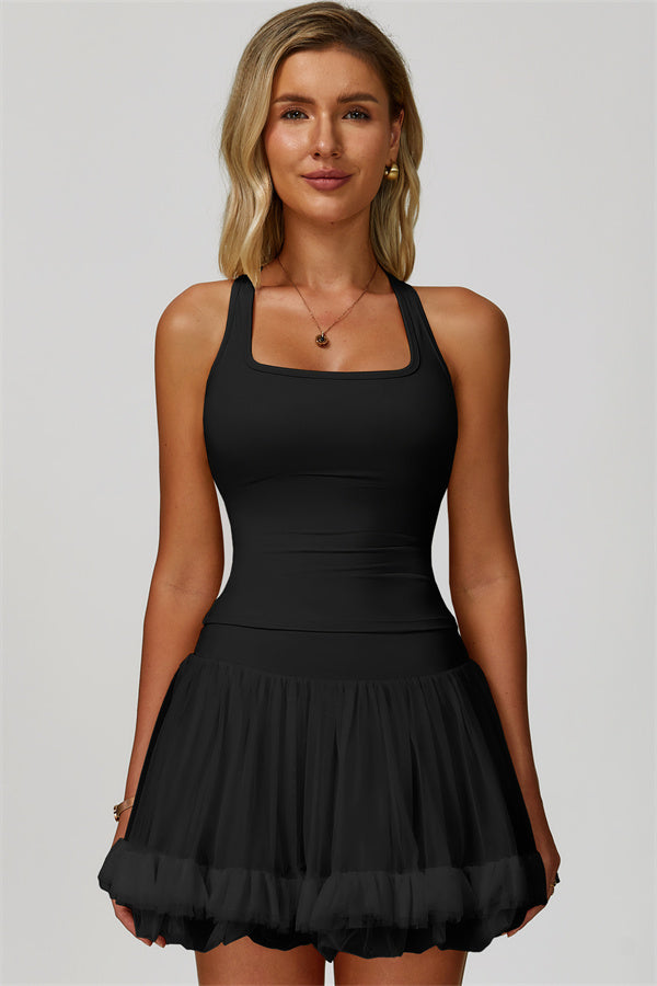 Racerback design enhances mobility and showcases the shoulders