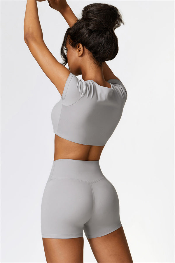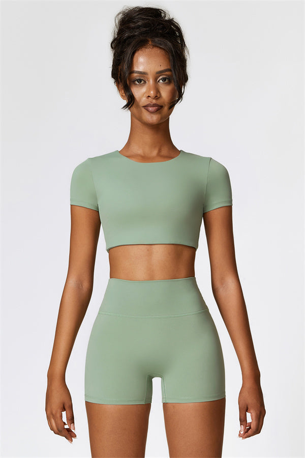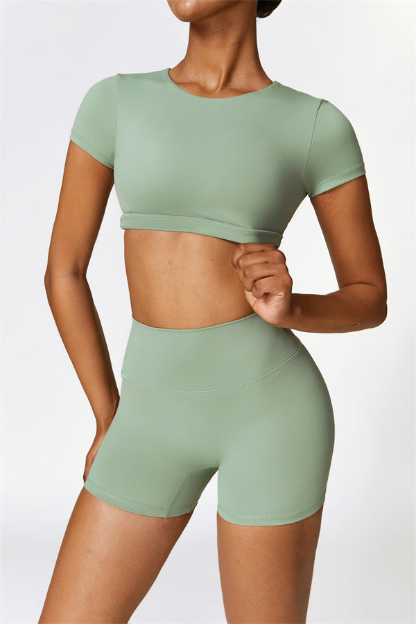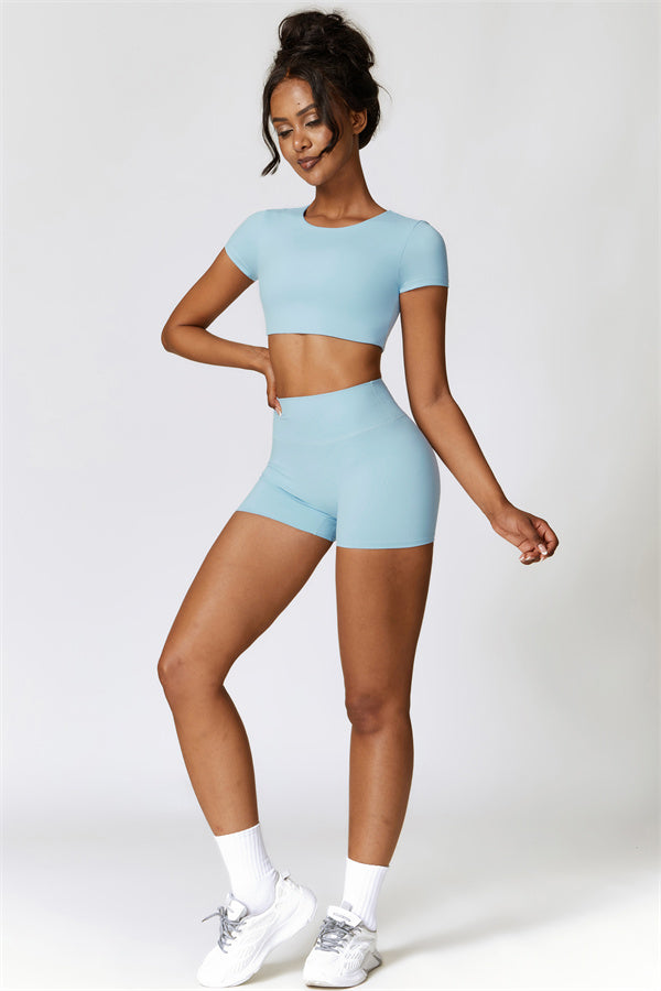This matching set, featuring a T-shirt and shorts, combines comfort, style, and performance for your active lifestyle. The T-shirt is designed with a hidden elastic waistband at the hem that effectively reduces vibrations during movement, while the soft fabric ensures a flattering and secure fit. The shorts feature a lifting design that accentuates and enhances your natural curves, offering a sculpted, full look.