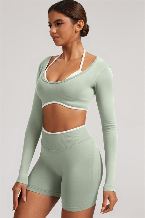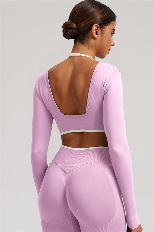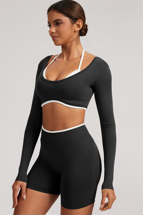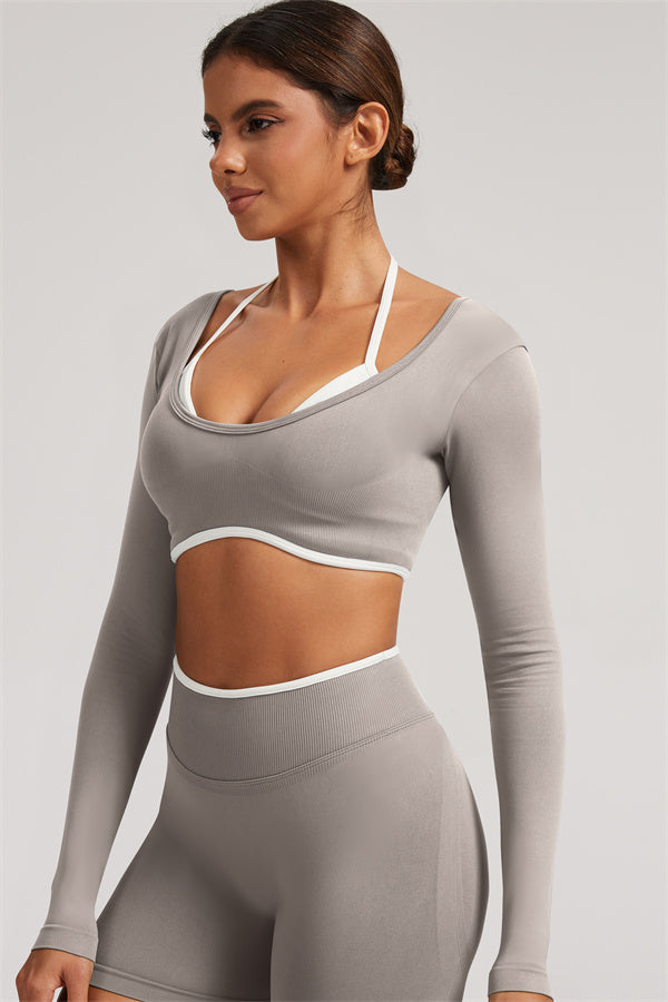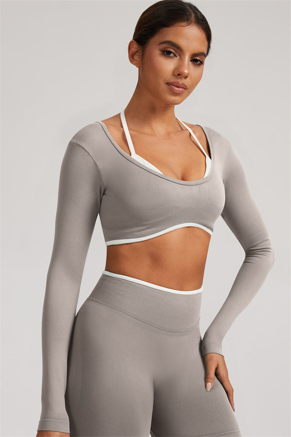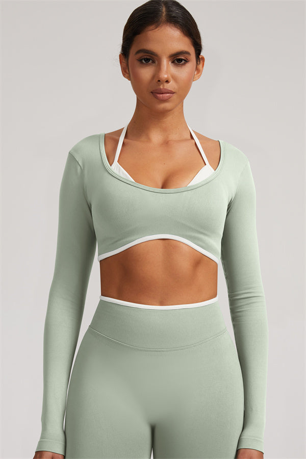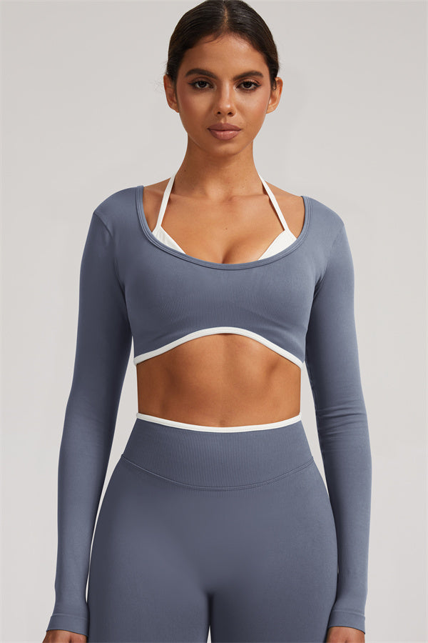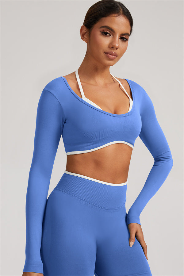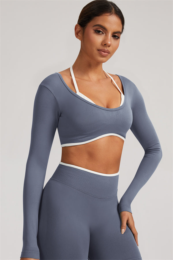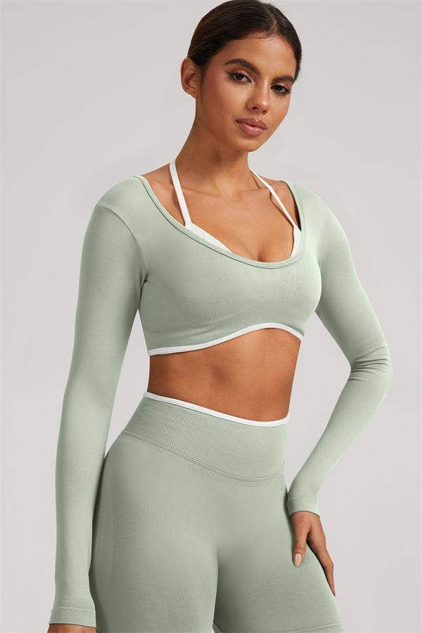Stylish and functional, this long sleeve crop top features a layered look with contrast binding and shoulder straps, while the U-shaped back enhances your posture and highlights your back lines.