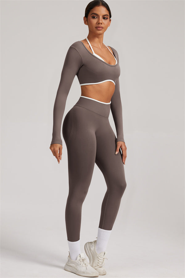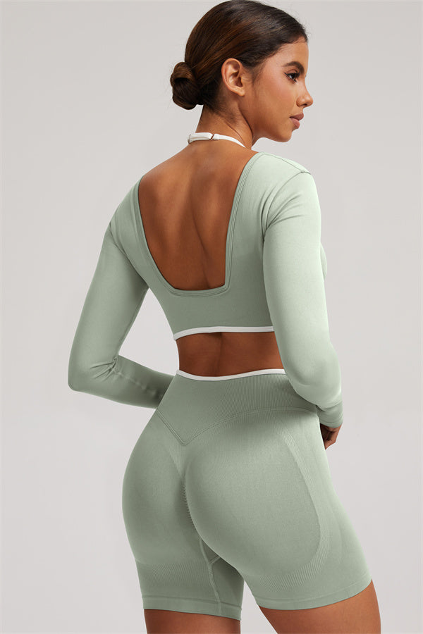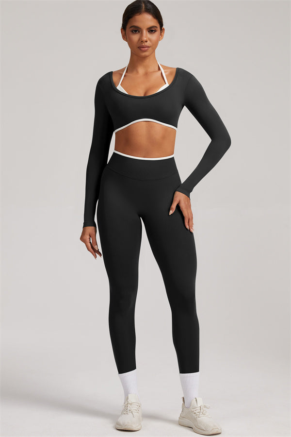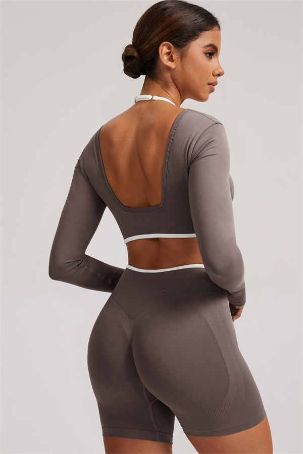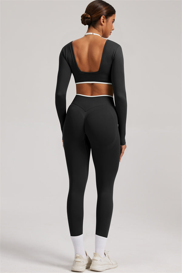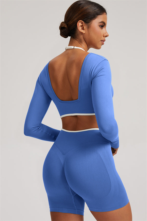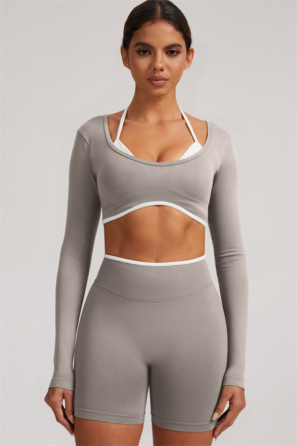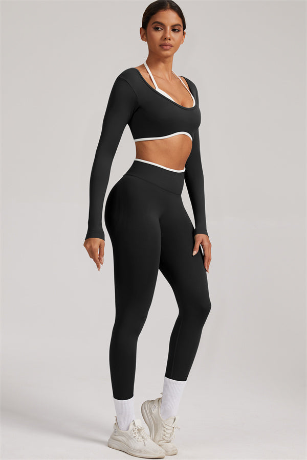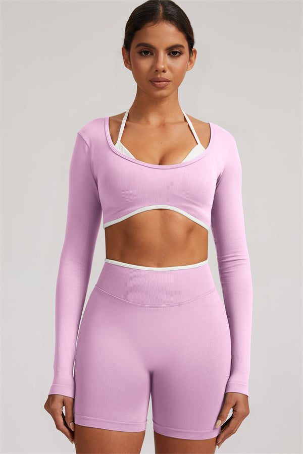 Stylish and functional, this long sleeve crop top features a layered look with contrast binding and shoulder straps, while the U-shaped back enhances your posture and highlights your back lines.