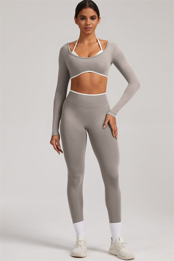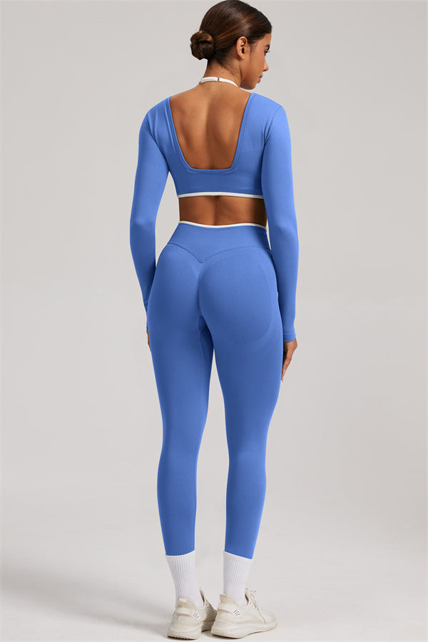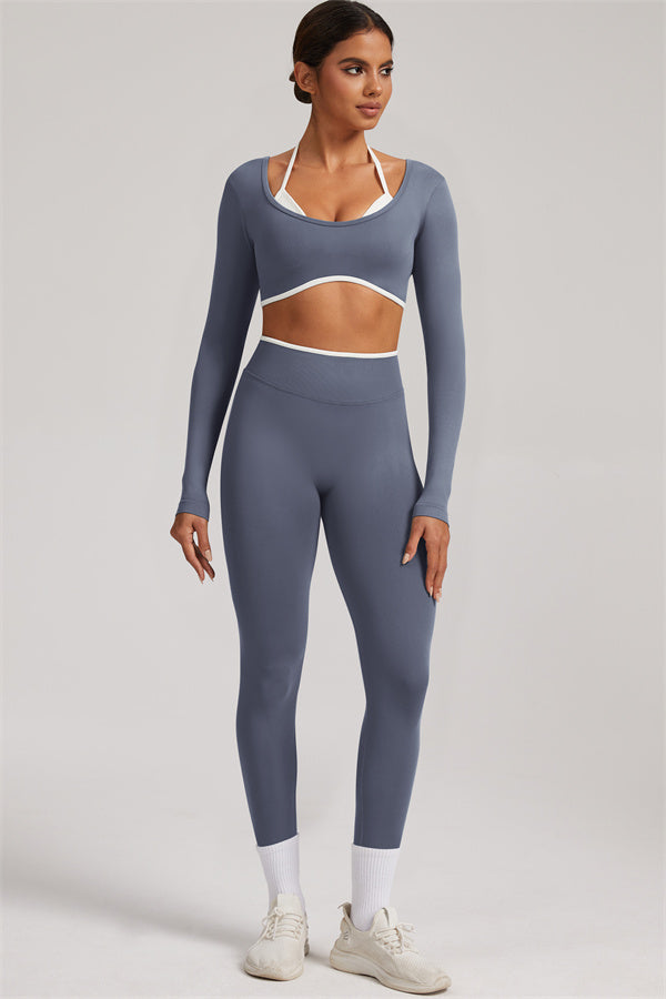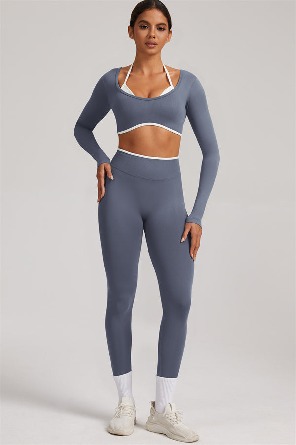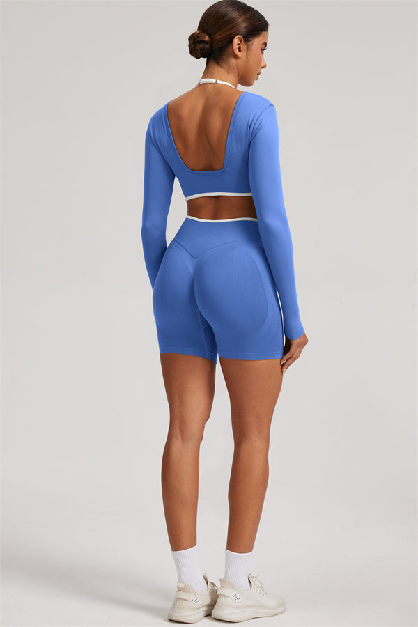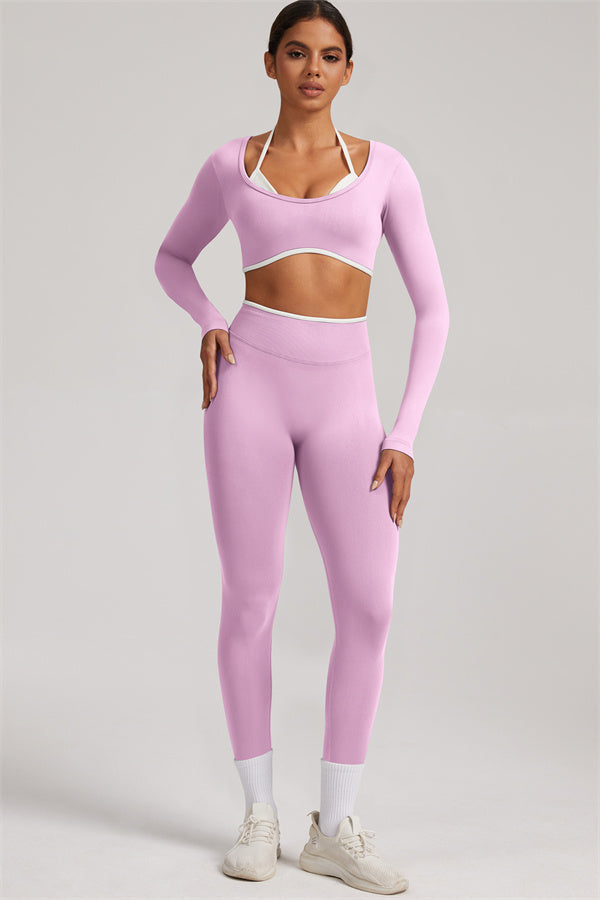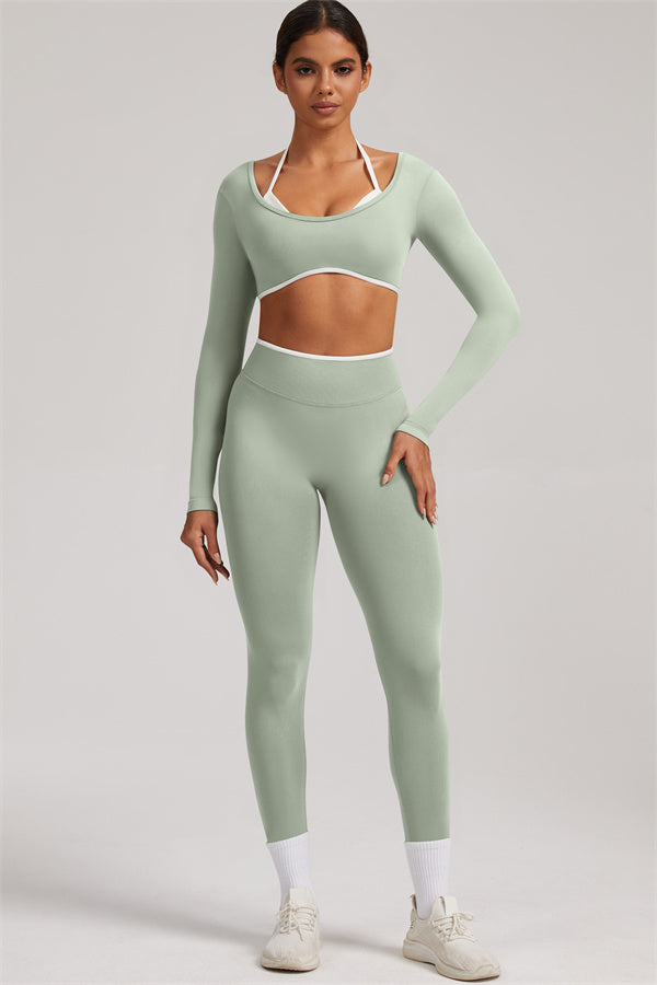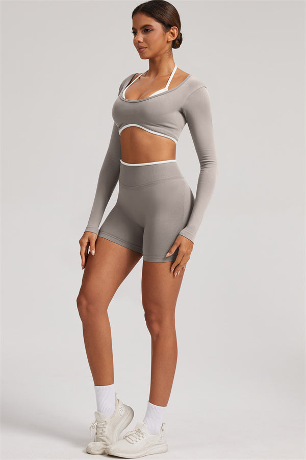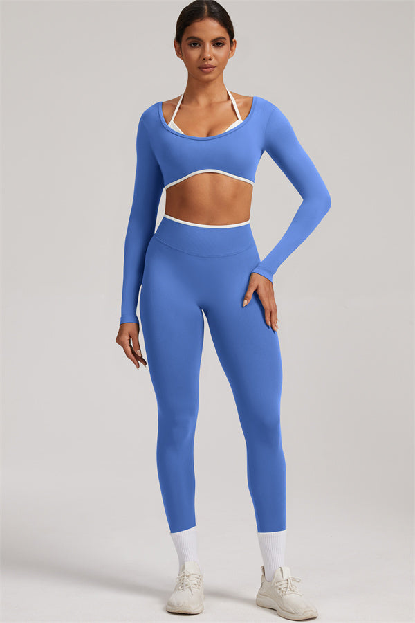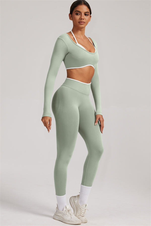 Stylish and functional, this long sleeve crop top features a layered look with contrast binding and shoulder straps, while the U-shaped back enhances your posture and highlights your back lines.