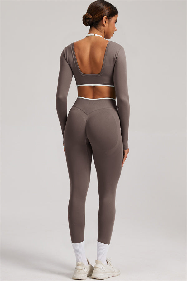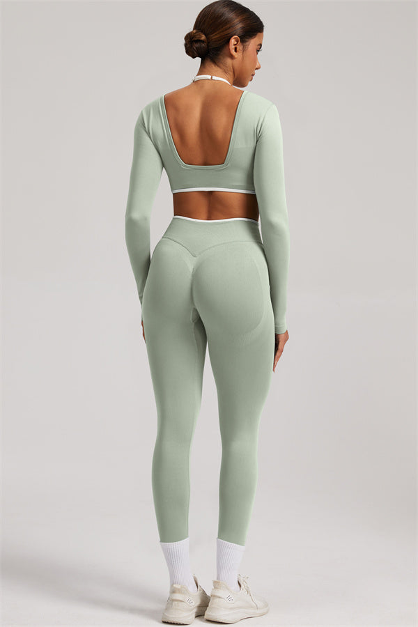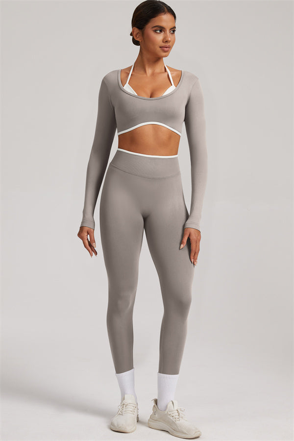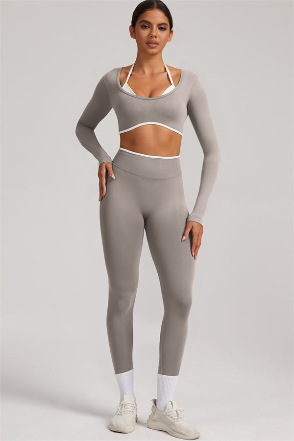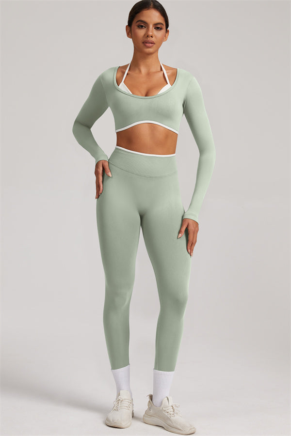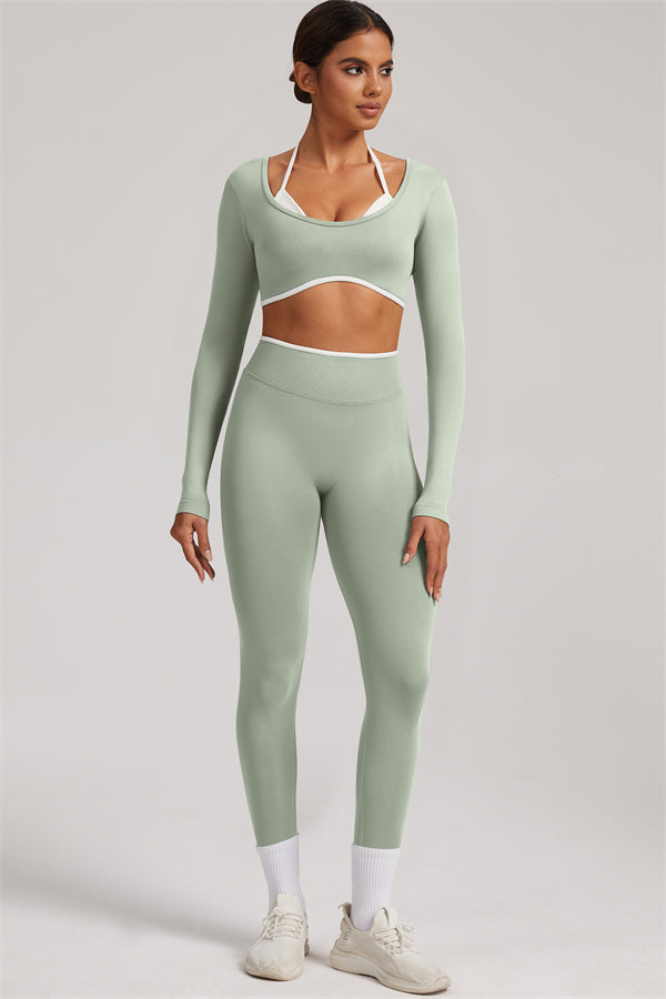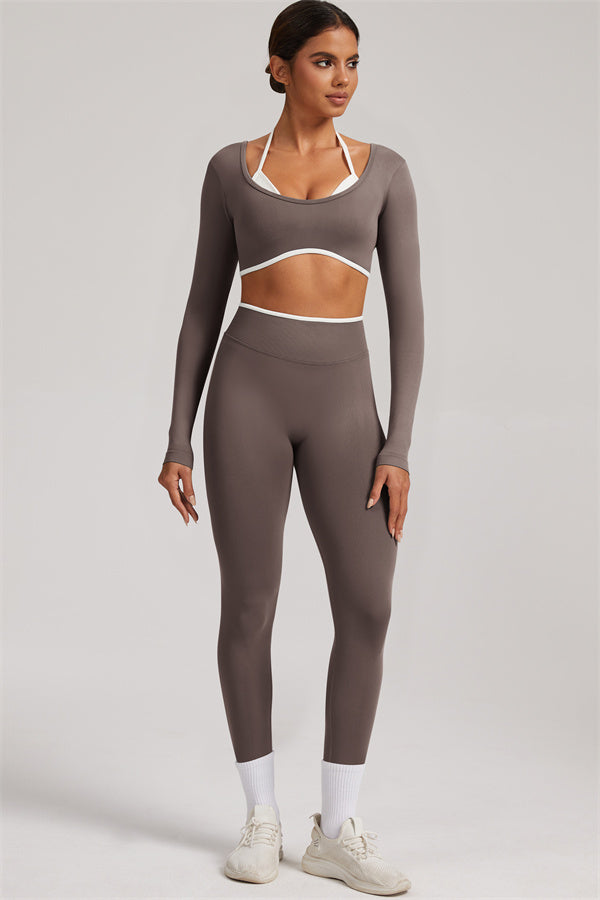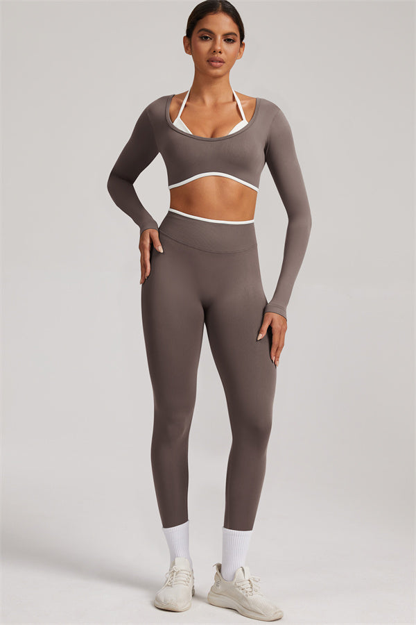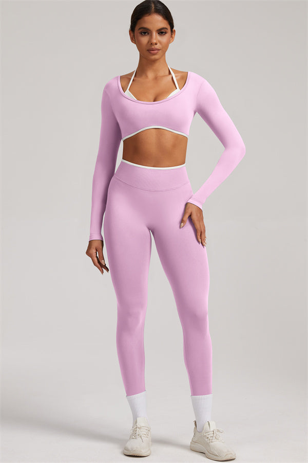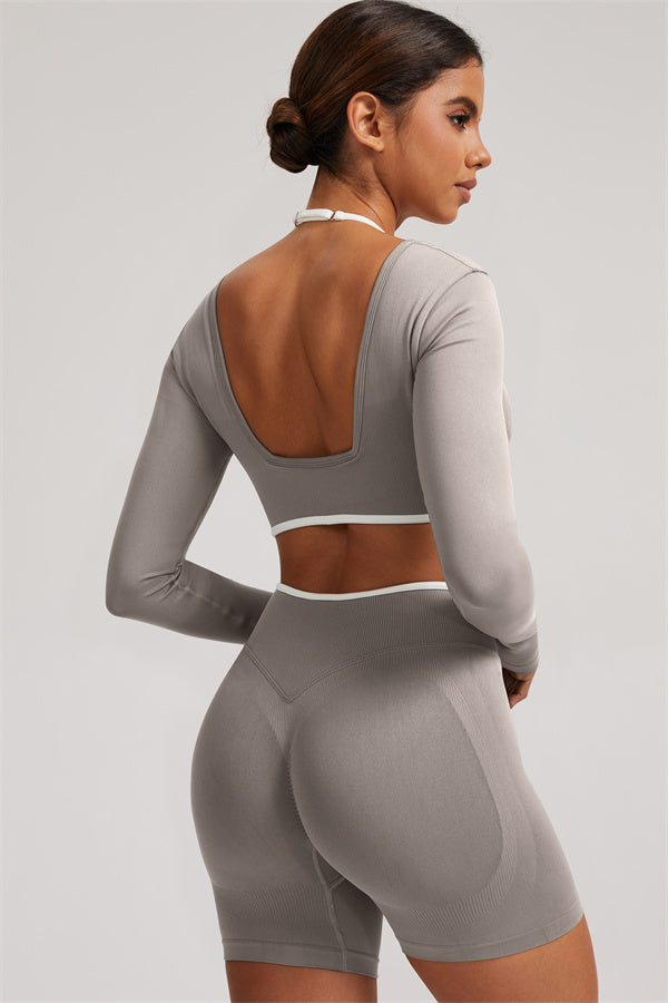 Stylish and functional, this long sleeve crop top features a layered look with contrast binding and shoulder straps, while the U-shaped back enhances your posture and highlights your back lines.