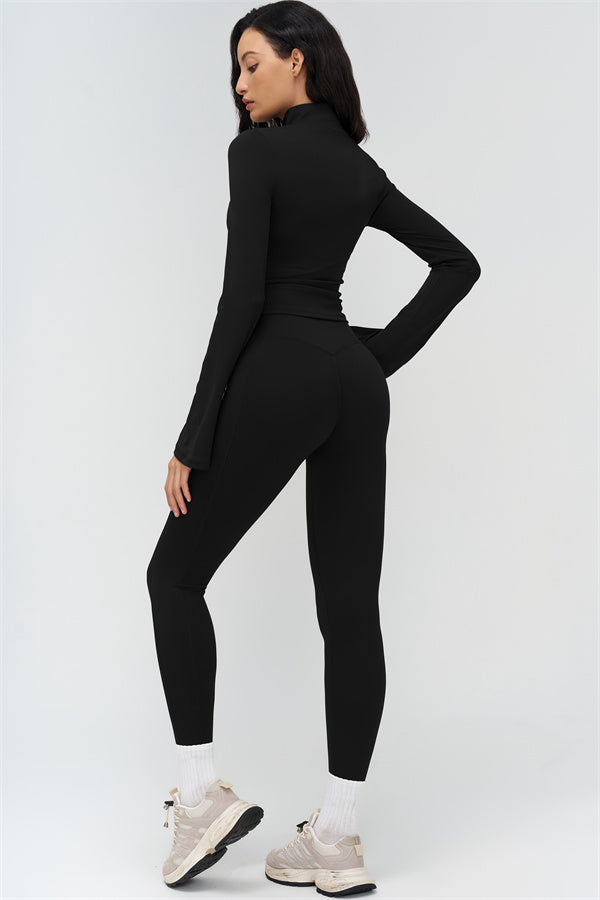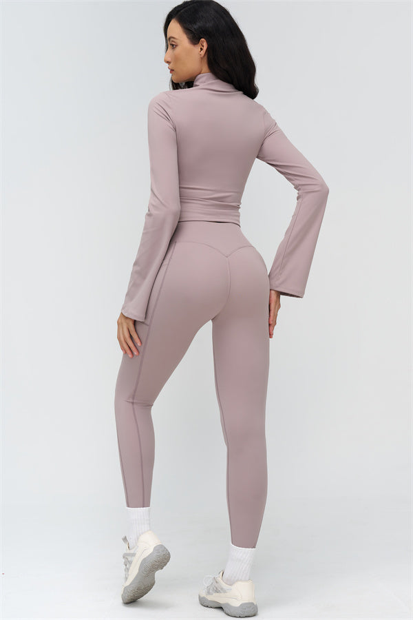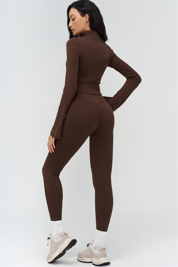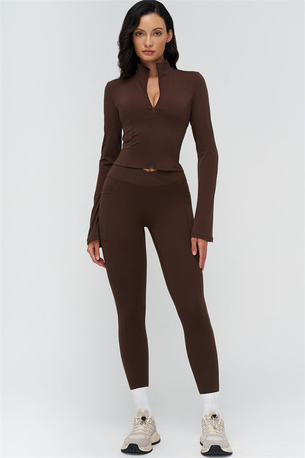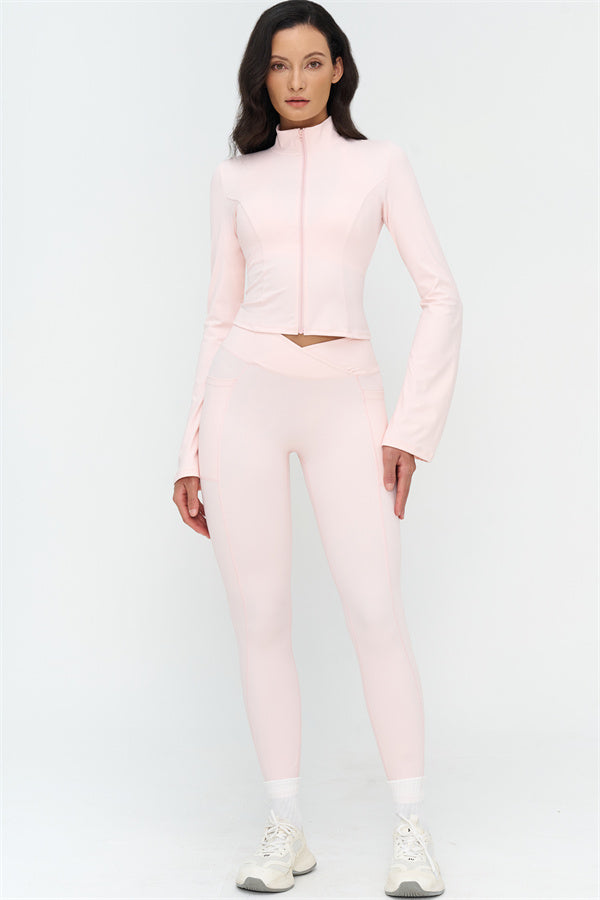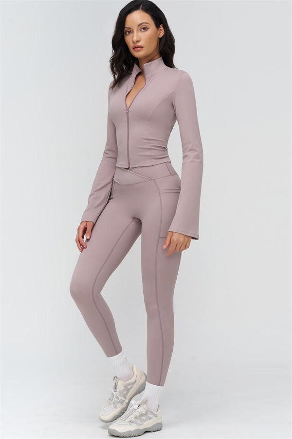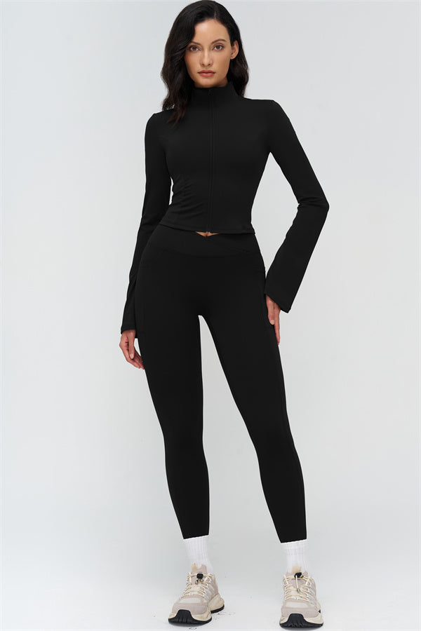 Elevate your workout and casual style with The BoldFit Jacket Leggings Set, designed for a flattering silhouette and functional performance. The fitted jacket features a full-zip high collar, long flared cuffs for an elegant flow, and a waist-sculpting design that hugs your curves. The matching leggings offer a cross-waist waistband to prevent rolling, side pockets for easy storage, and sculpting seams that lift and enhance your glutes.