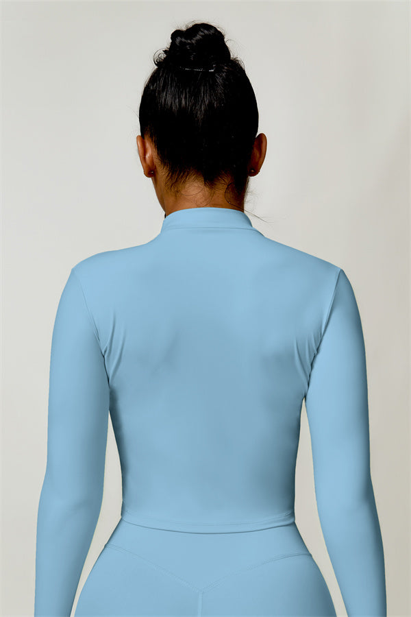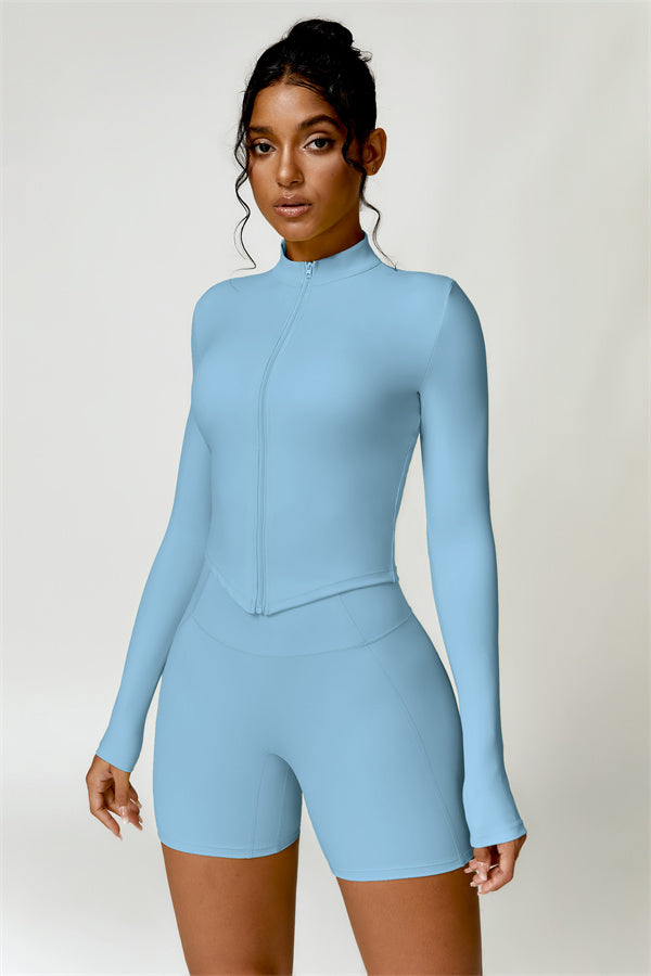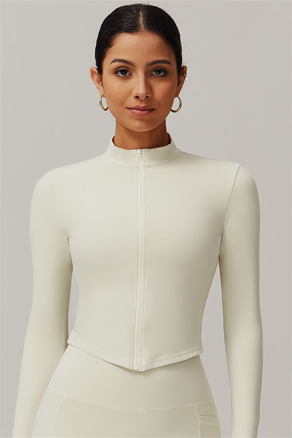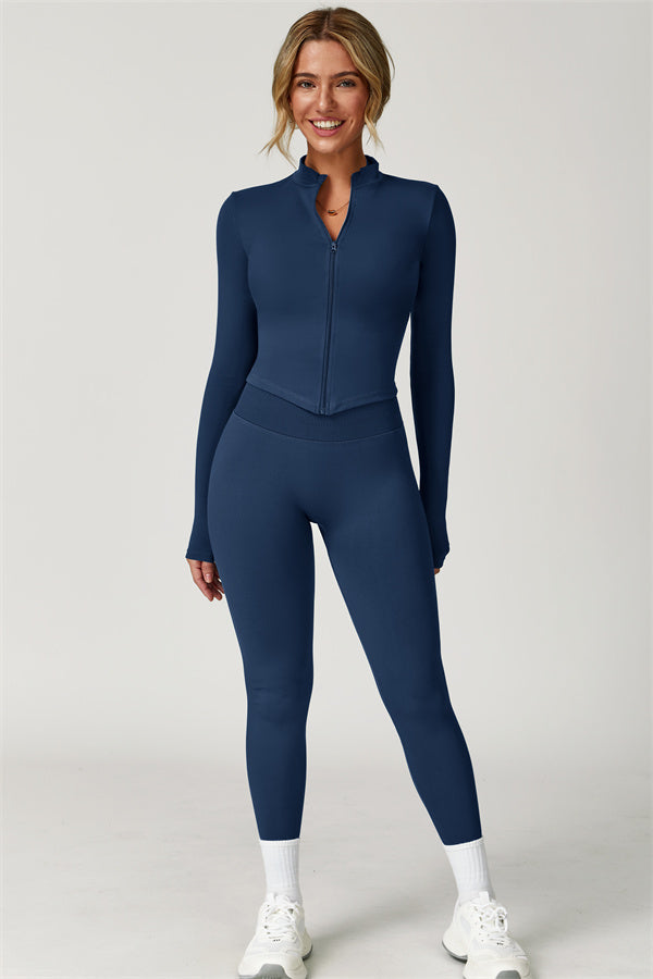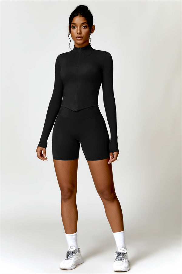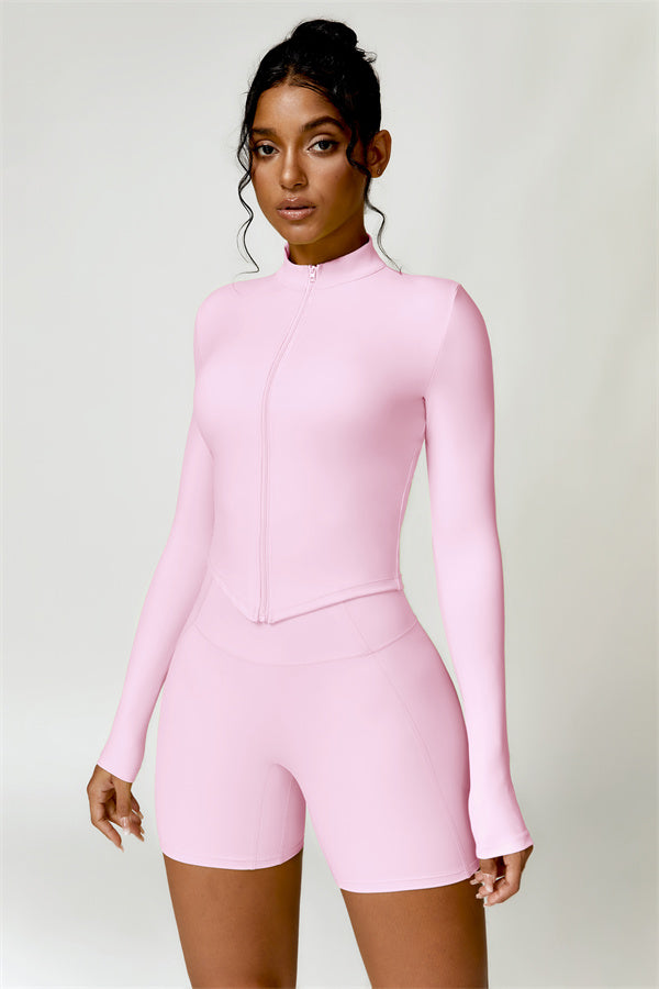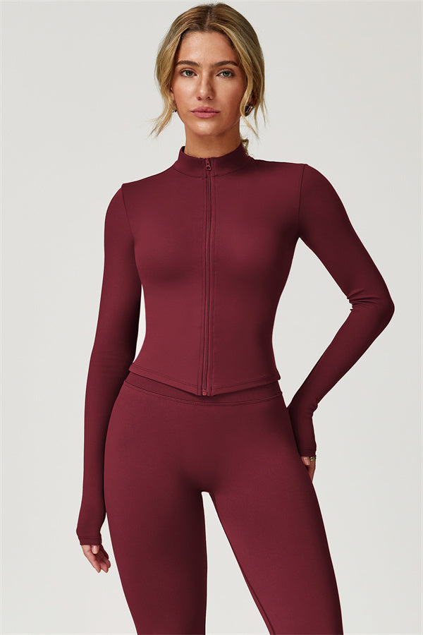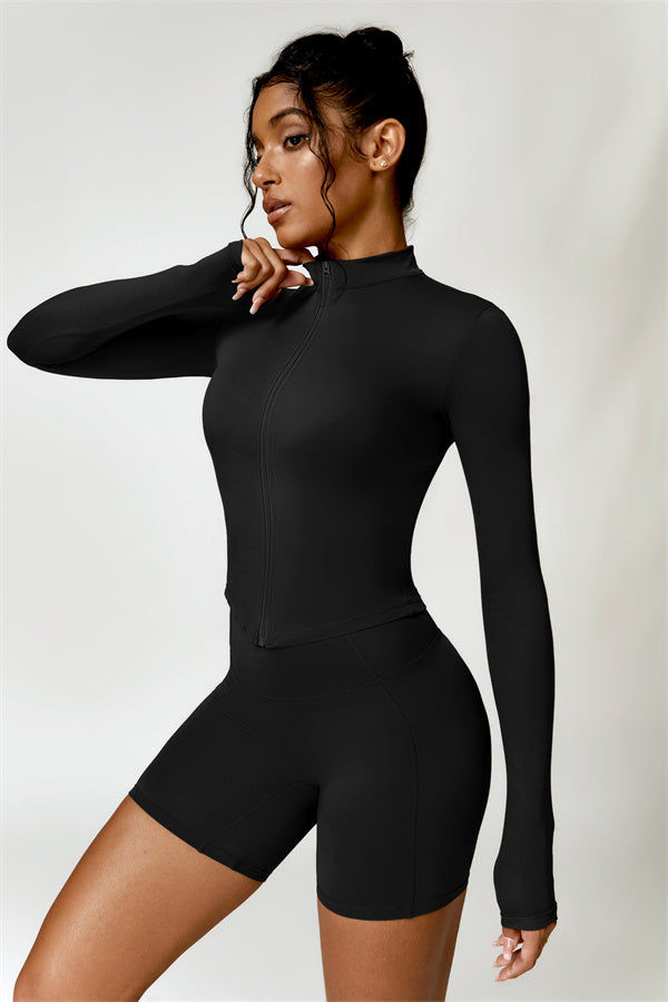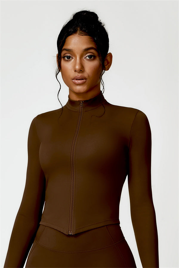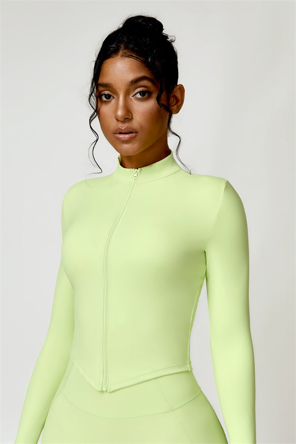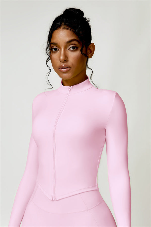 Elevate your activewear collection with this stylish zip jacket, featuring a stand-up collar and a full-length zipper for customizable coverage and a touch of sporty sophistication. The V-shaped hemline enhances your silhouette, creating a flattering, cinched waist effect that pairs perfectly with leggings or joggers.