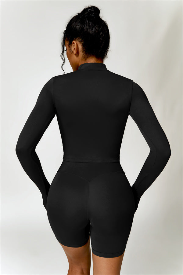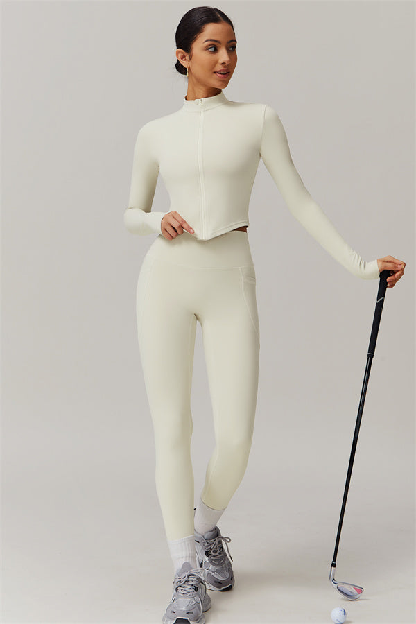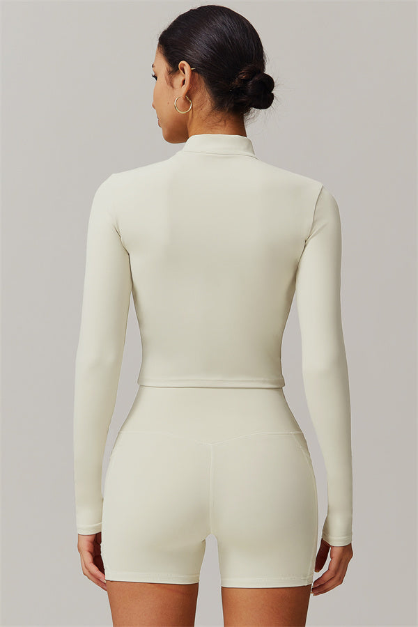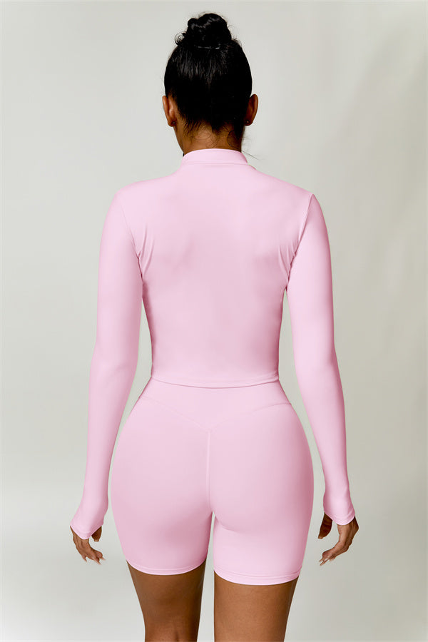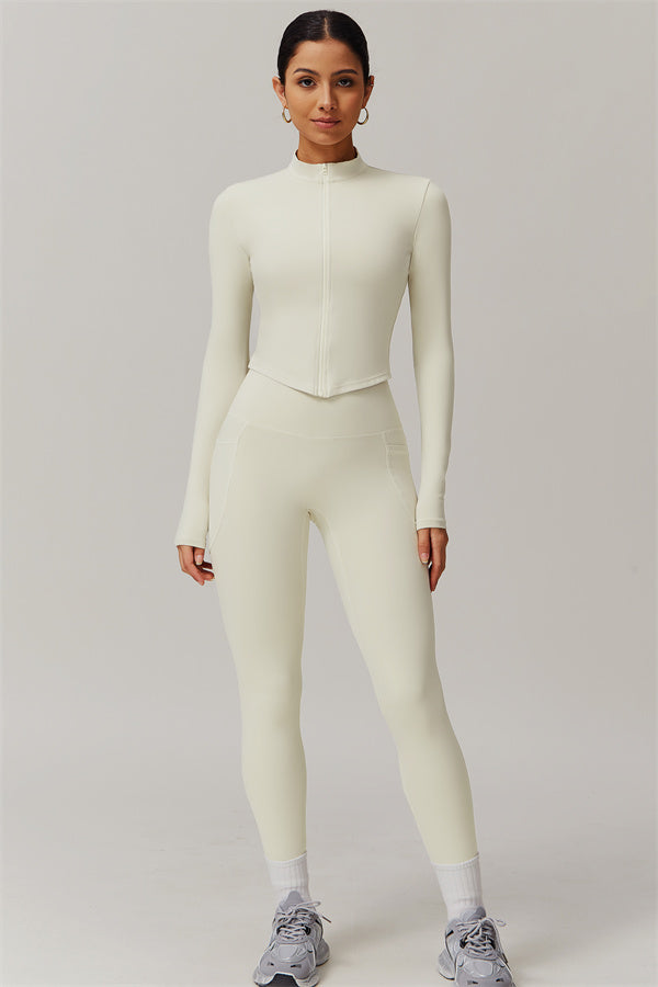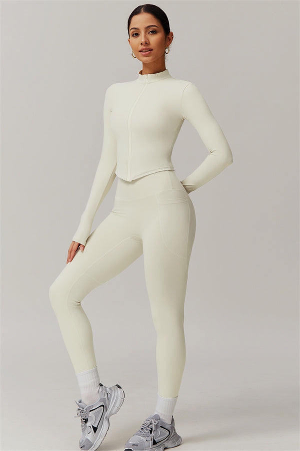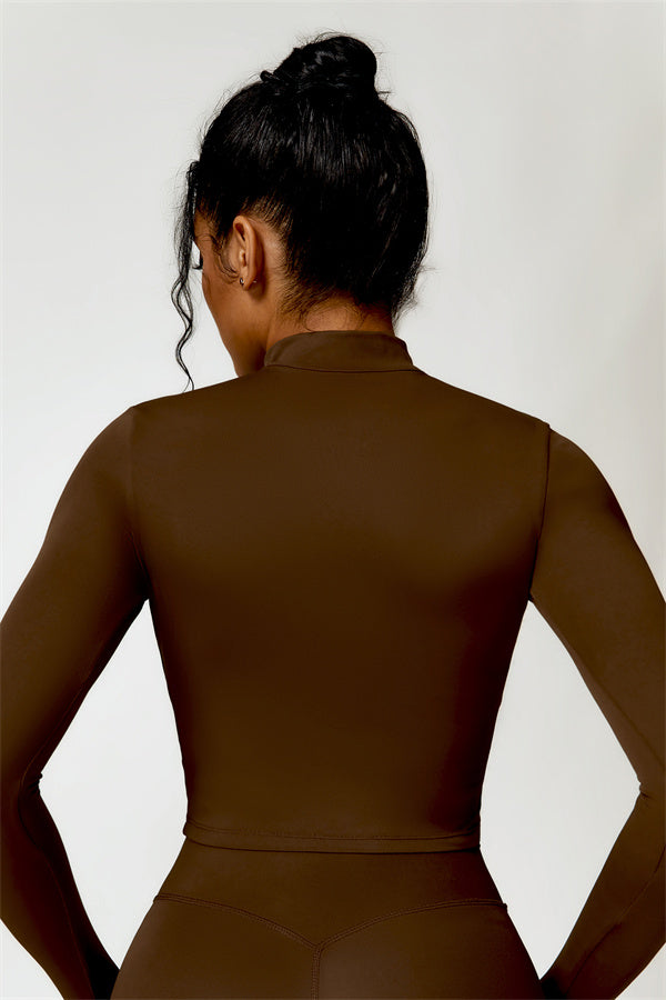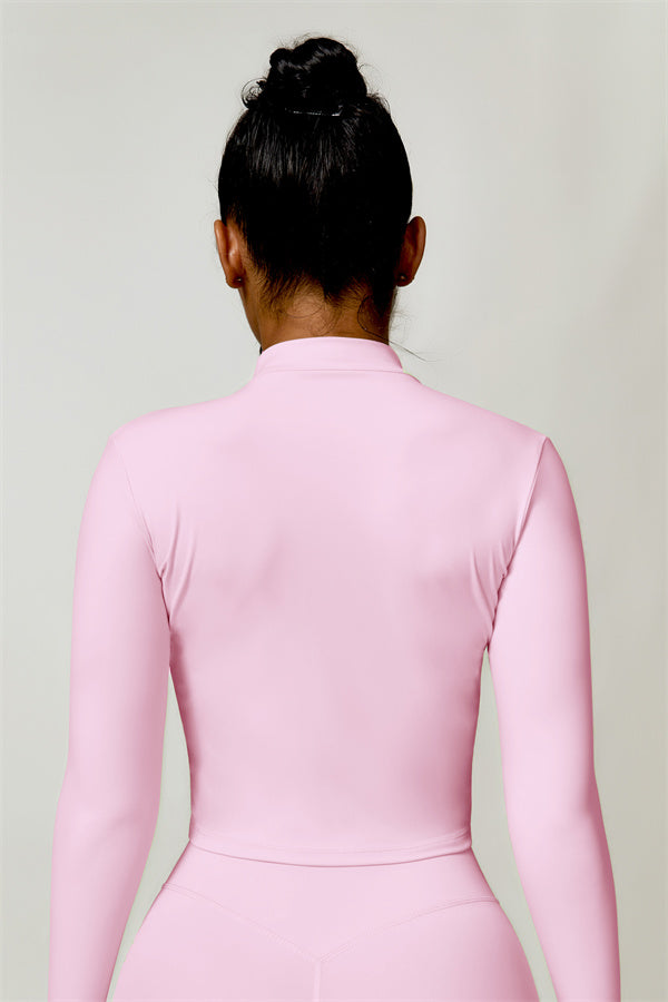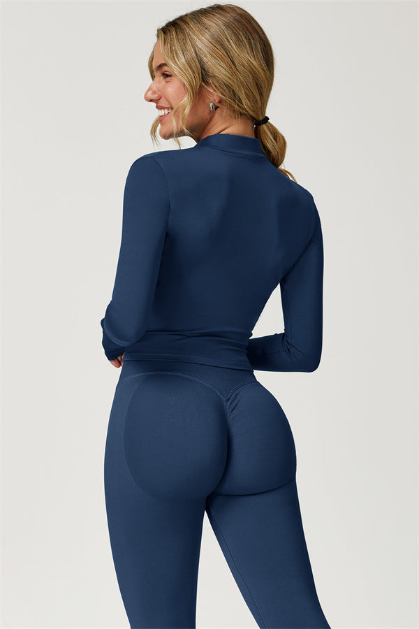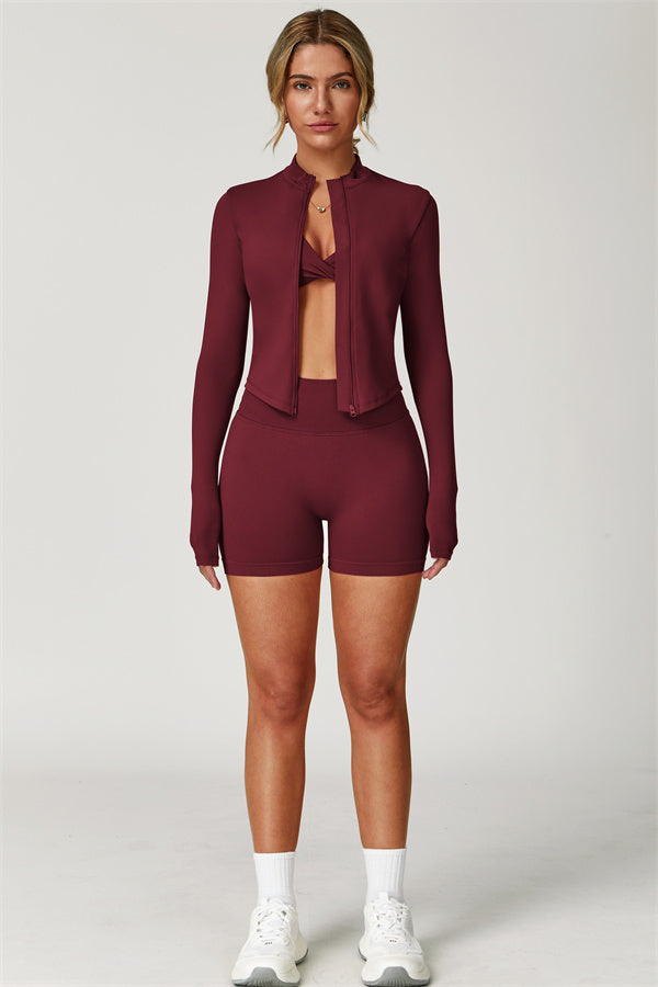 Elevate your activewear collection with this stylish zip jacket, featuring a stand-up collar and a full-length zipper for customizable coverage and a touch of sporty sophistication. The V-shaped hemline enhances your silhouette, creating a flattering, cinched waist effect that pairs perfectly with leggings or joggers.
