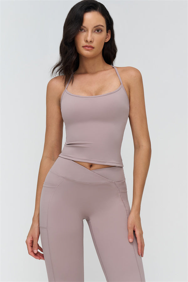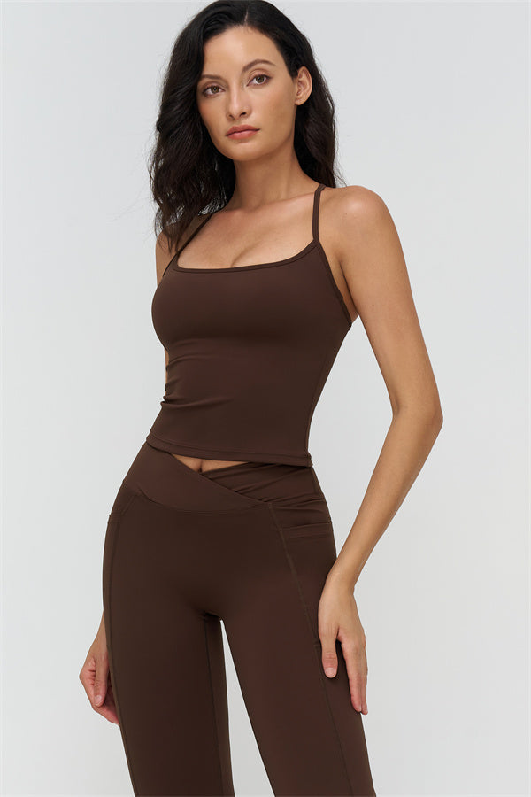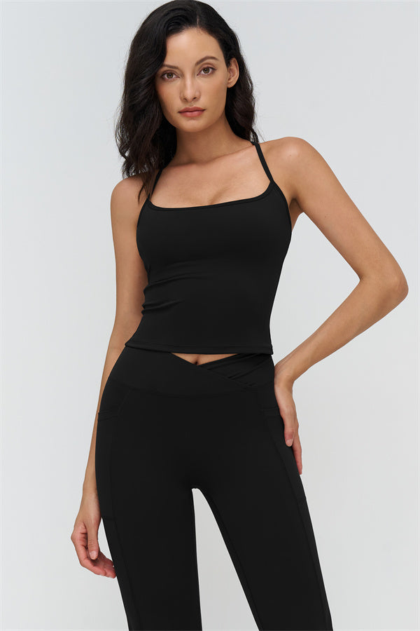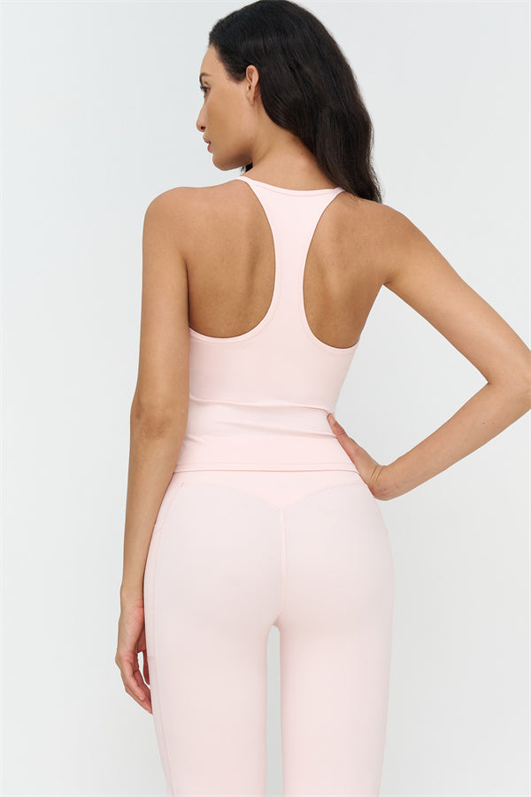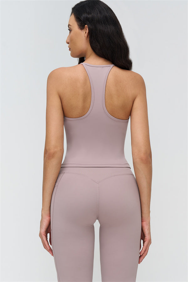 • Racerback silhouette highlights shoulder blades and butterfly-back lines