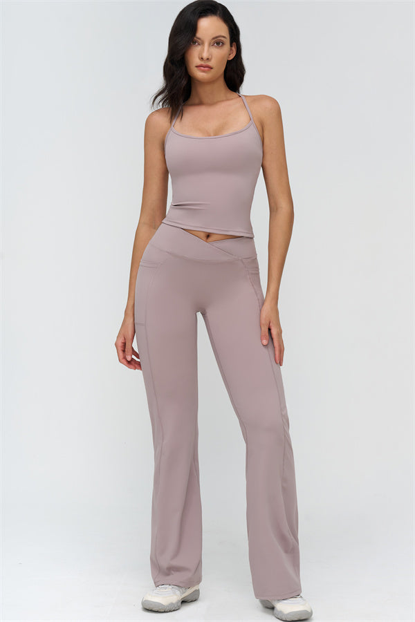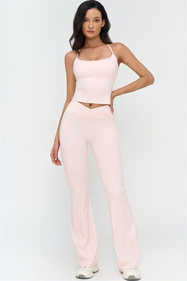 Elevate your activewear game with The BoldFit Crop Top Flared Leggings Set, designed to combine flattering style with functional performance. The crop top features a racerback design that showcases your shoulder blades and butterfly-back lines, while the extended hem sculpts your waist for a smooth, confident fit. The flared leggings offer a cross-waist waistband to prevent rolling, sculpting seams that lift and define your glutes, and flared cuffs to elongate your legs.