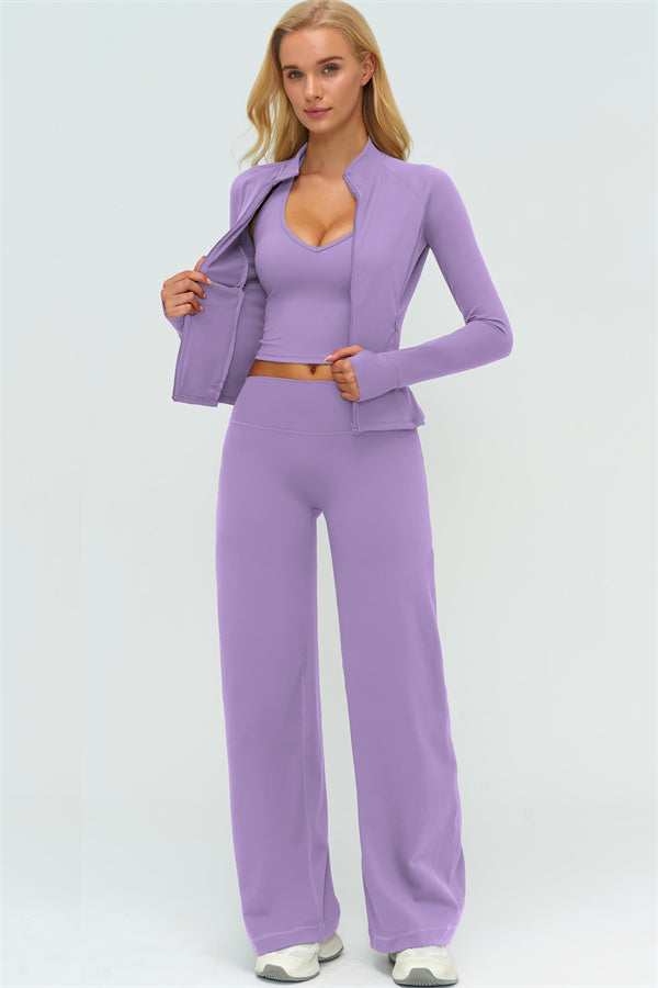 The Twirl Zip Jacket, Halter Tank Top & New Straight Leg Pants 3-Piece Set – a versatile and stylish set designed for workouts, outdoor activities, and casual everyday wear.