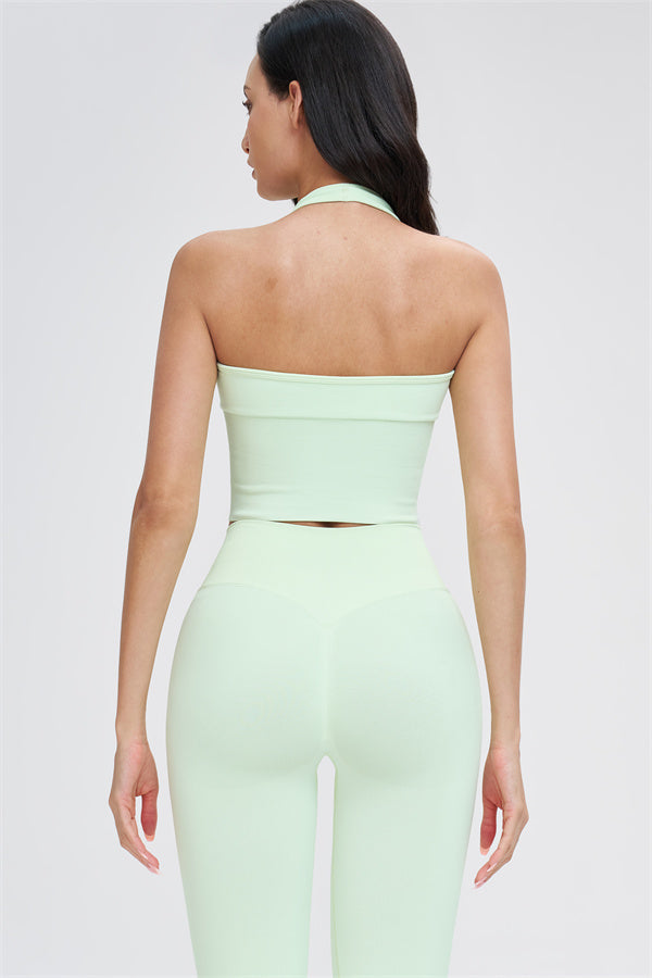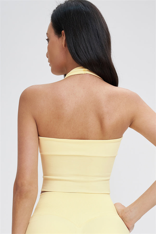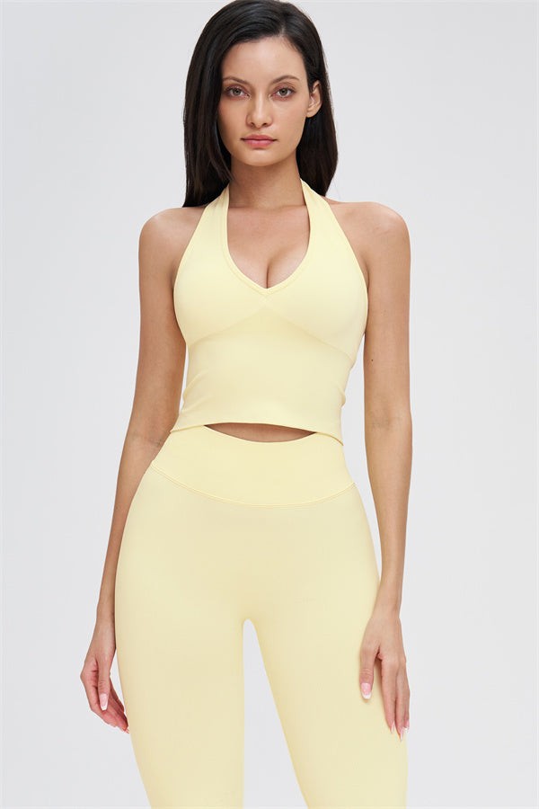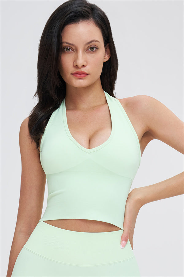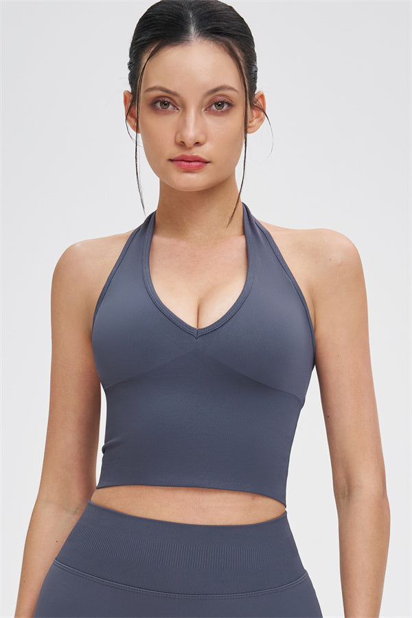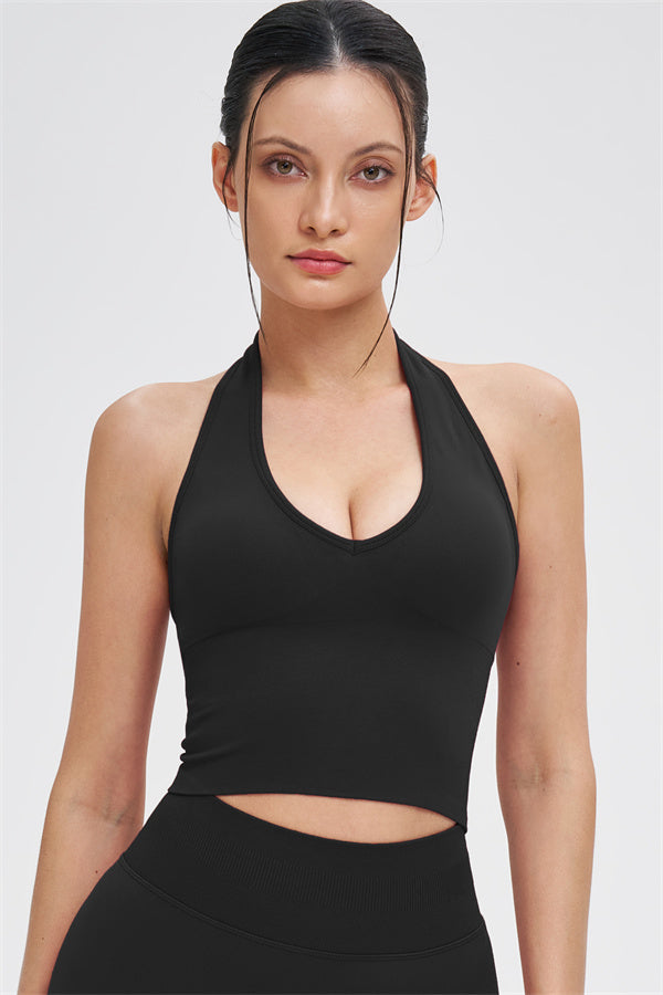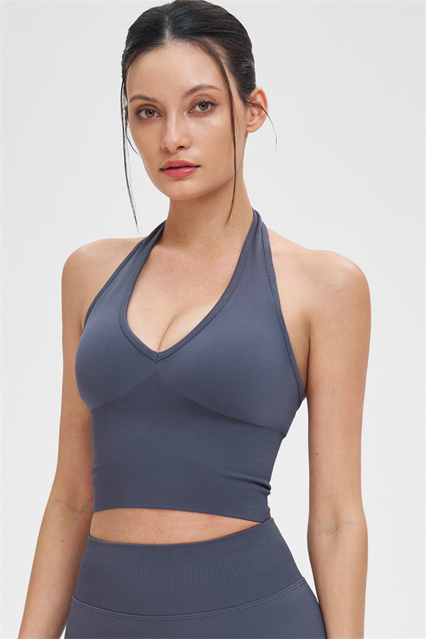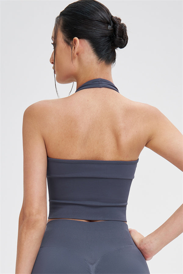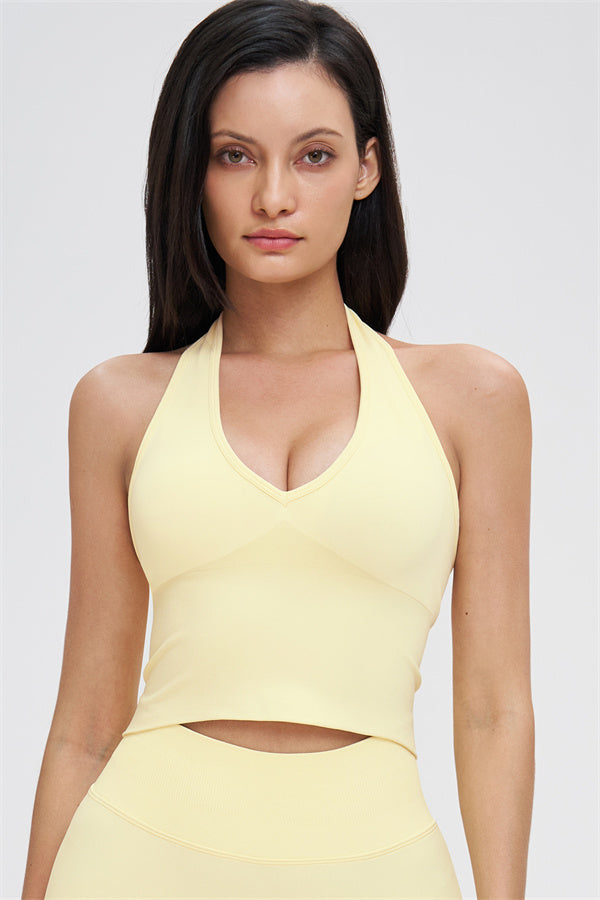 • Straps: Halter-style shoulder straps for a clean, breathable feel and a beautifully defined back