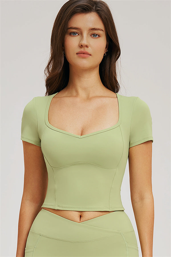 • Diamond-shaped neckline highlights the collarbone for a sleek, feminine look