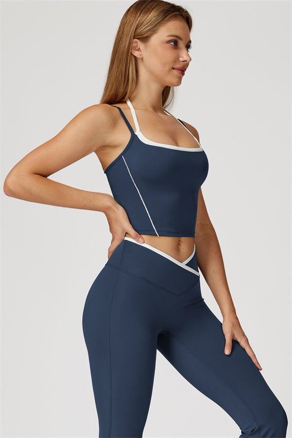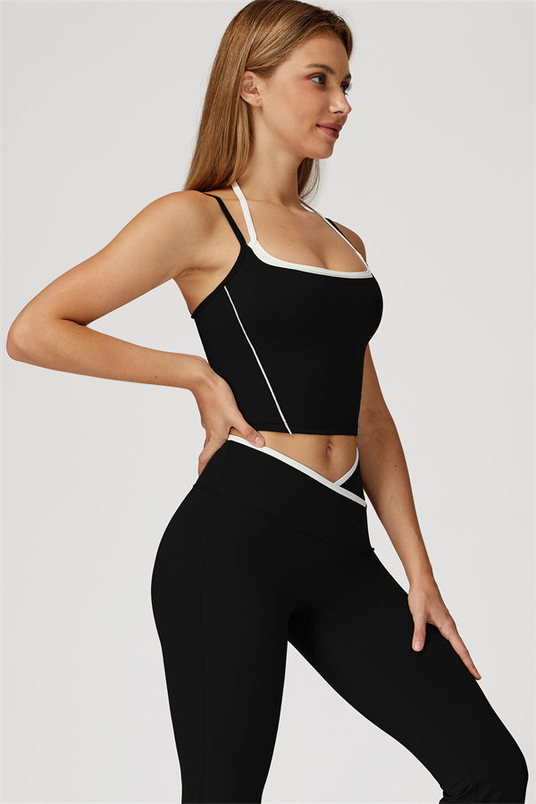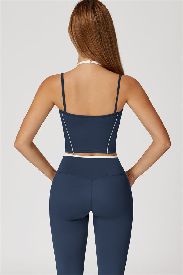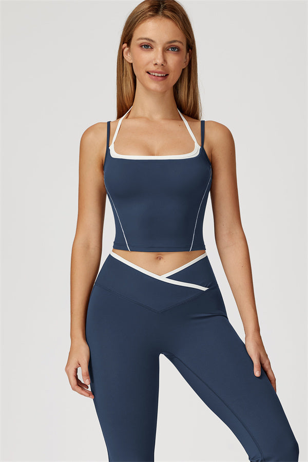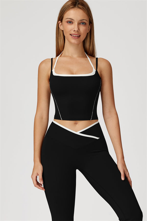 Two-tone layered look with adjustable white halter strap for a custom fit