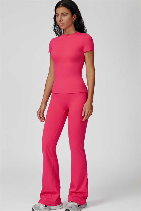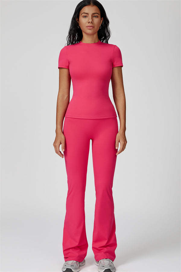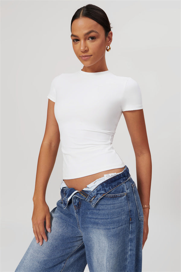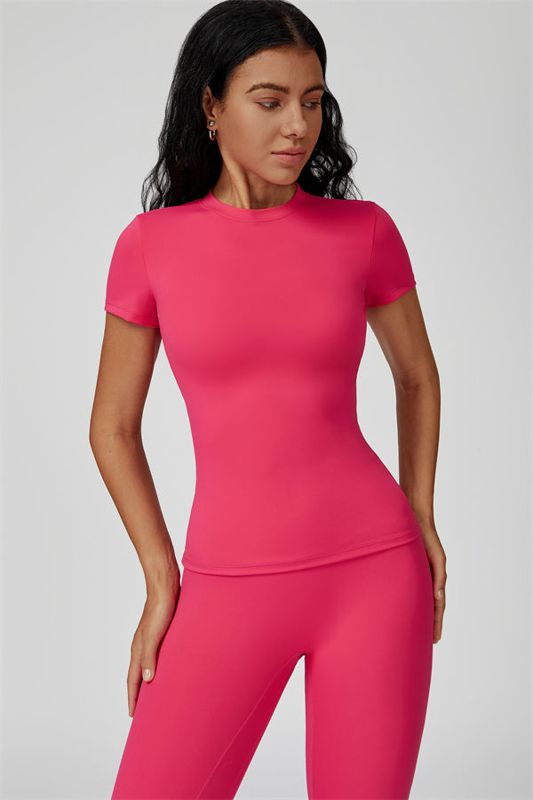 Achieve effortless style and comfort with this classic T-shirt, perfect for workouts or casual wear. The timeless round neckline highlights your natural shape, creating a flattering and sculpted look. Designed with a slim-fit silhouette and extended hem, it hugs your body for a secure and supportive feel.