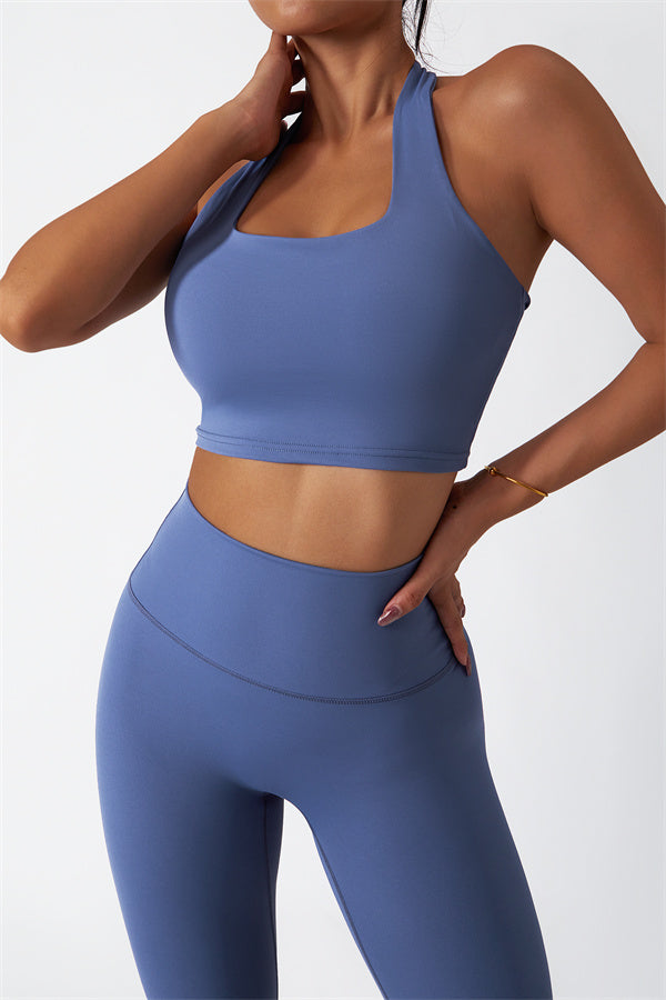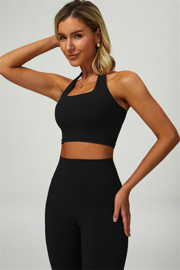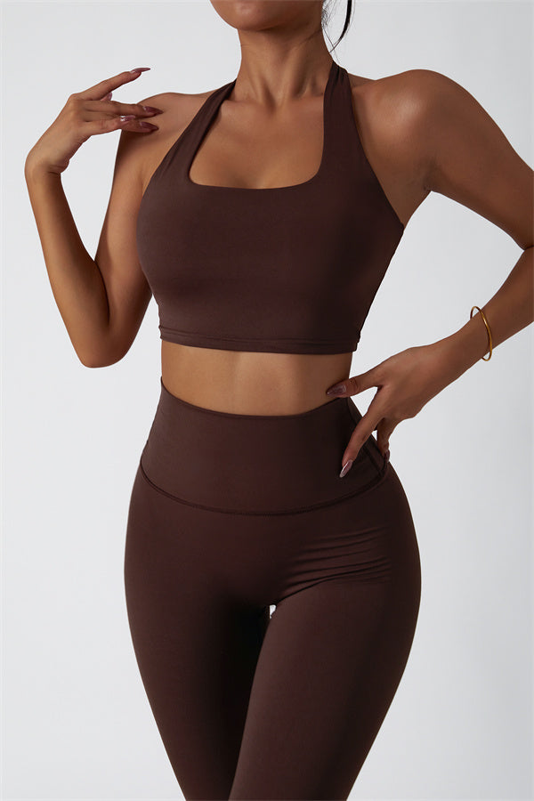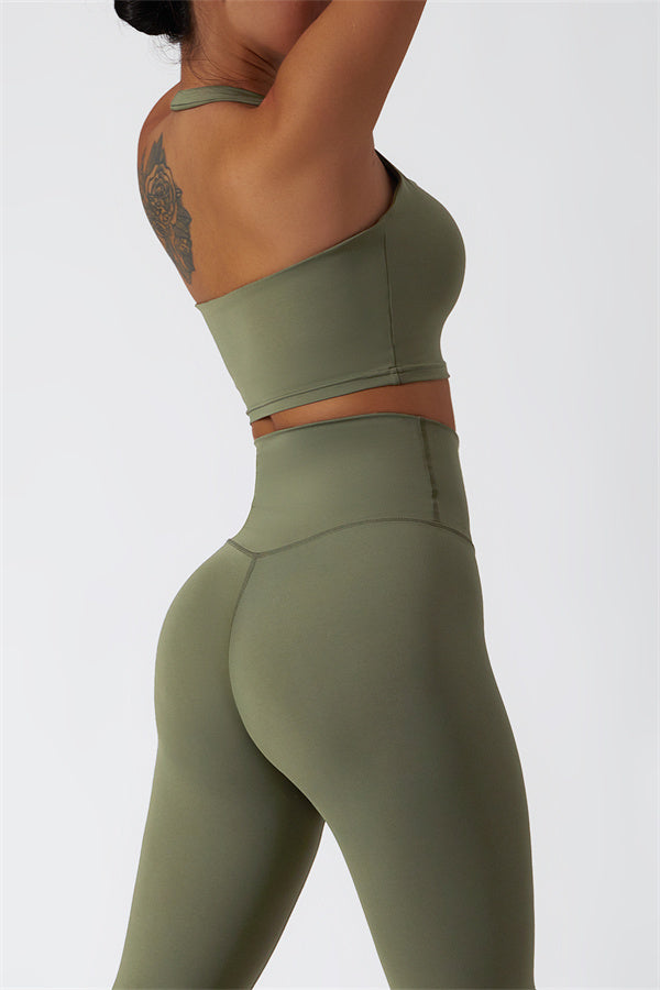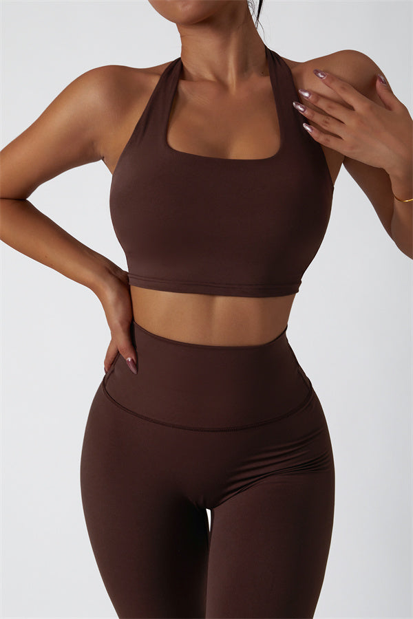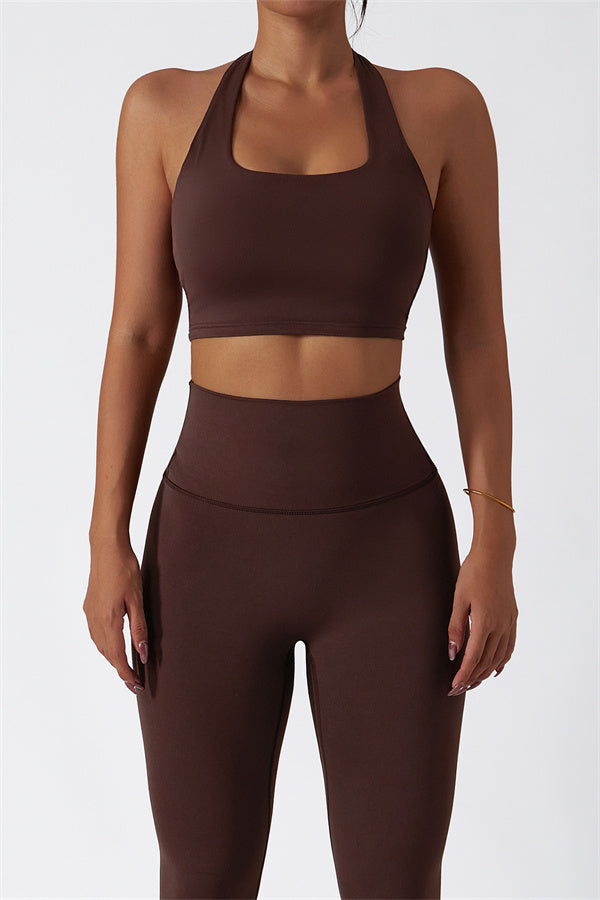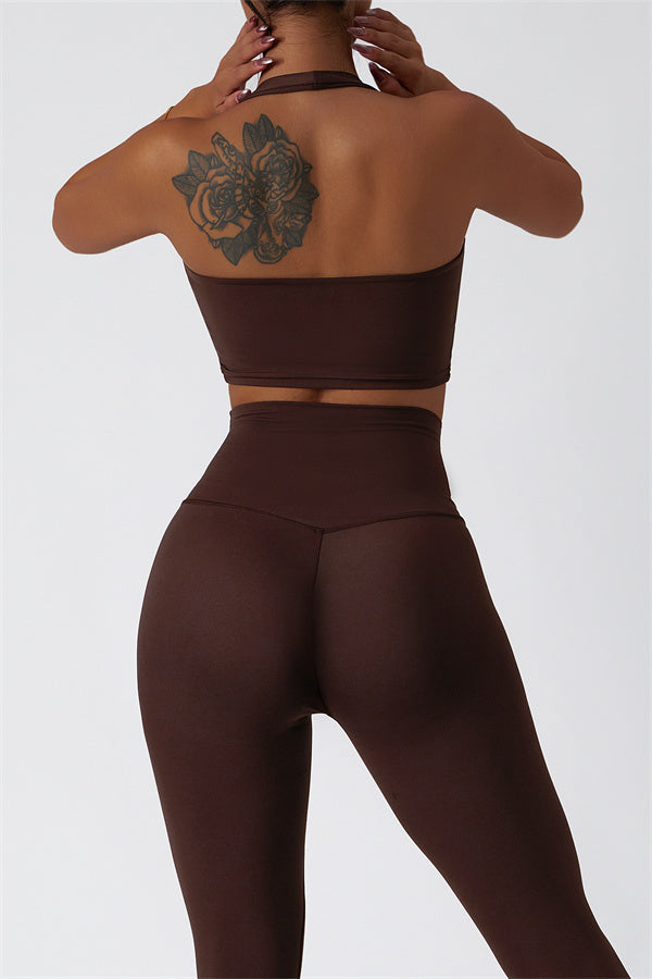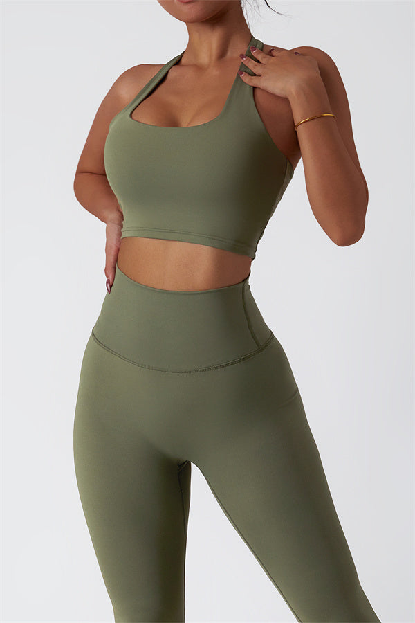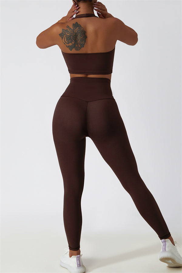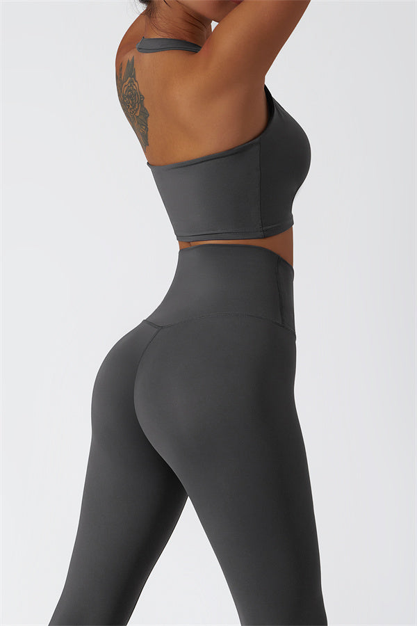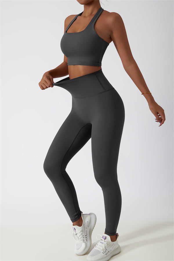 This matching set, featuring a sports bra and leggings, combines sleek design with performance-driven features. The sports bra showcases a chic hollow-back design, drawing attention to your back and adding a stylish twist. The high-waisted leggings are crafted to enhance your natural curves, accentuating your peach-shaped bottom for a flattering silhouette.