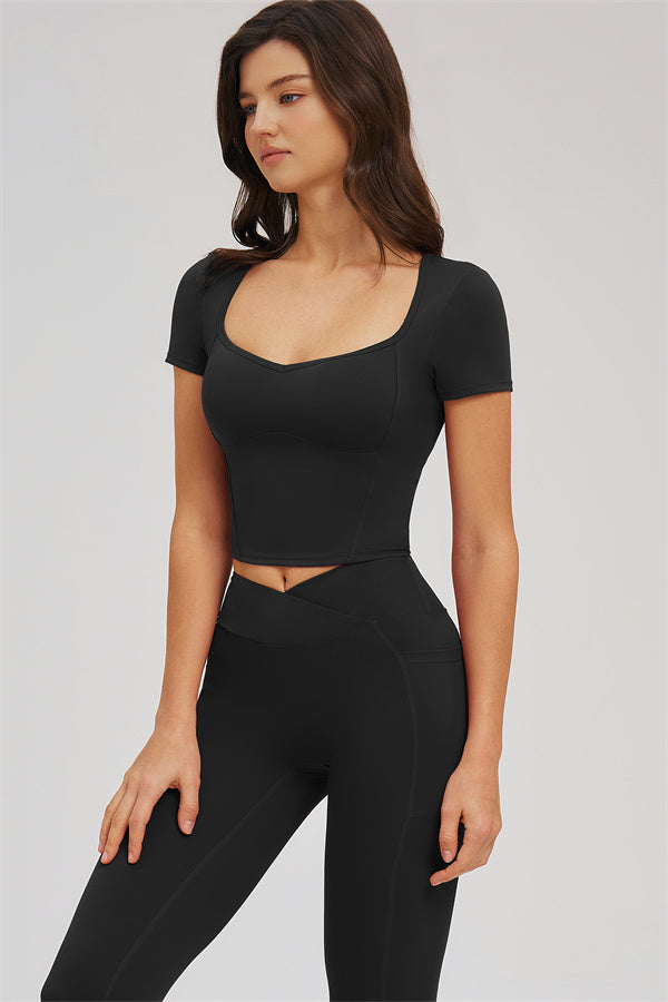 Diamond-shaped neckline highlights collarbone lines for a chic silhouette