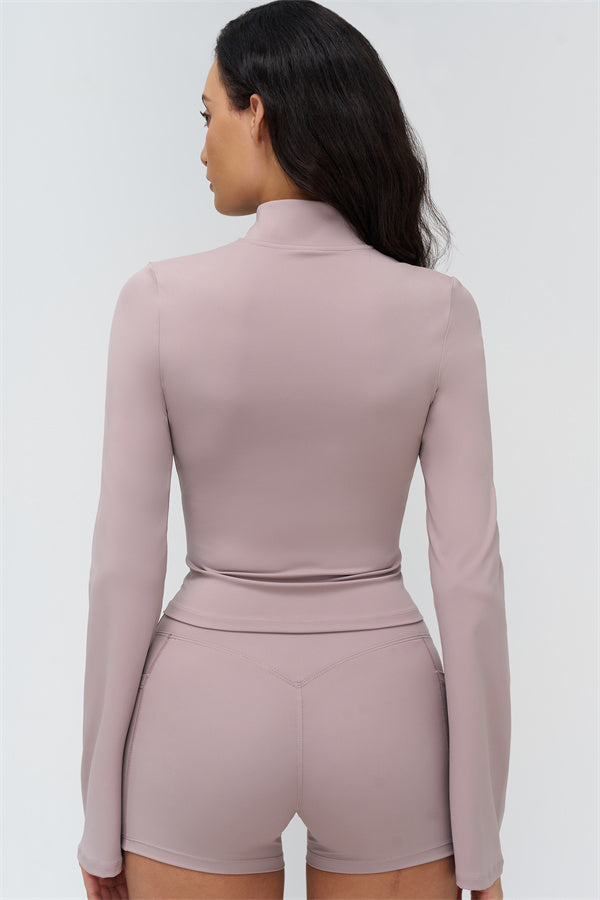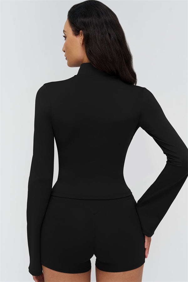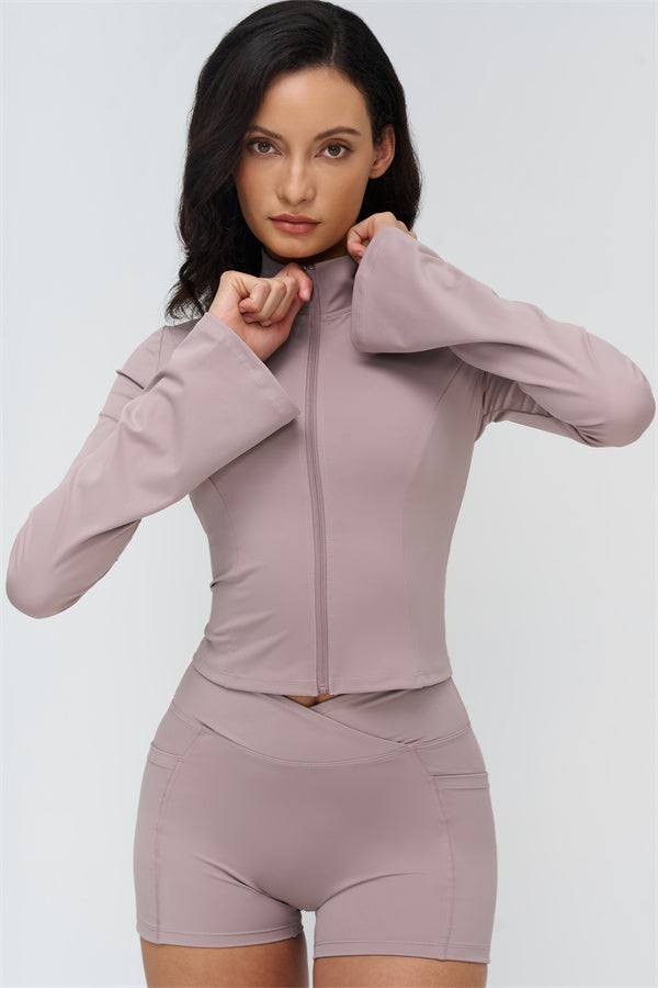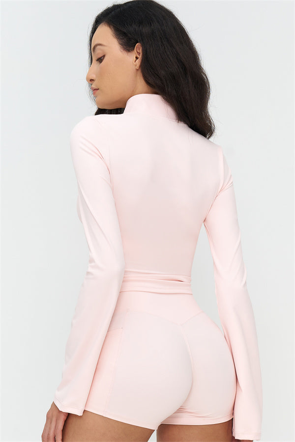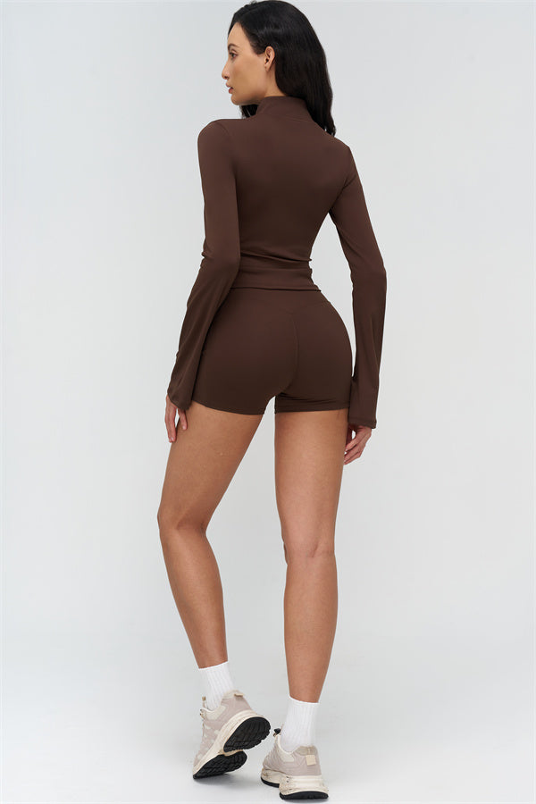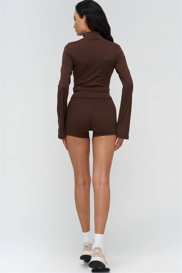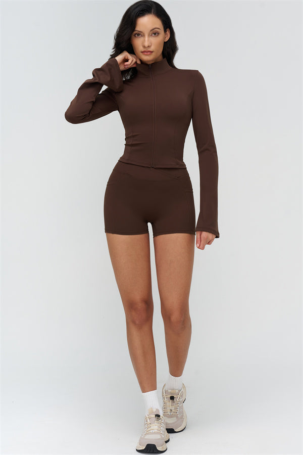 Step up your athleisure style with The BoldFit Jacket Shorts Set, combining sleek design with functional performance. The fitted jacket features a full-zip high collar, long flared cuffs for a flowing silhouette, and a waist-sculpting fit that stays snug during movement. Paired with the shorts, this set offers a cross-waist waistband, side pockets for easy storage, and sculpting seams that enhance and lift your glutes.