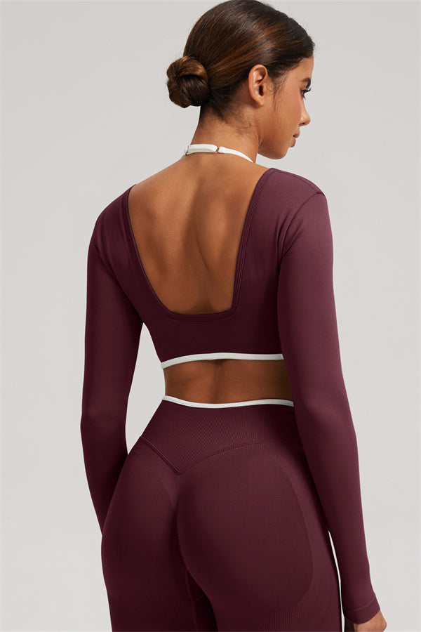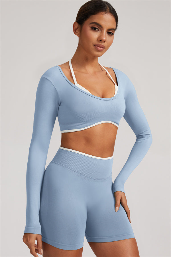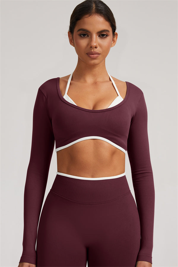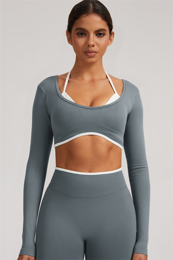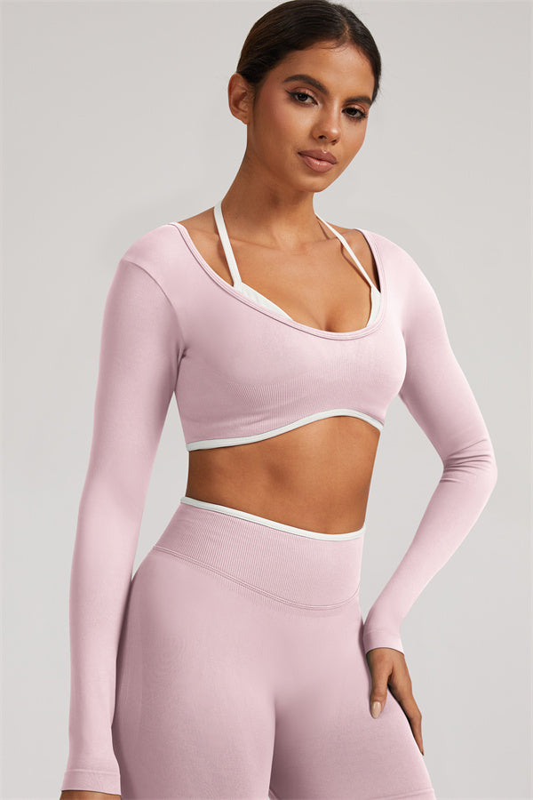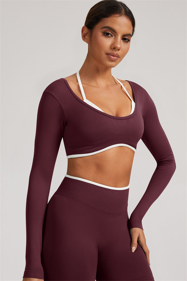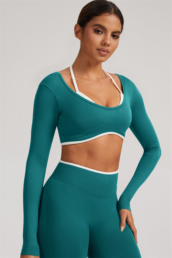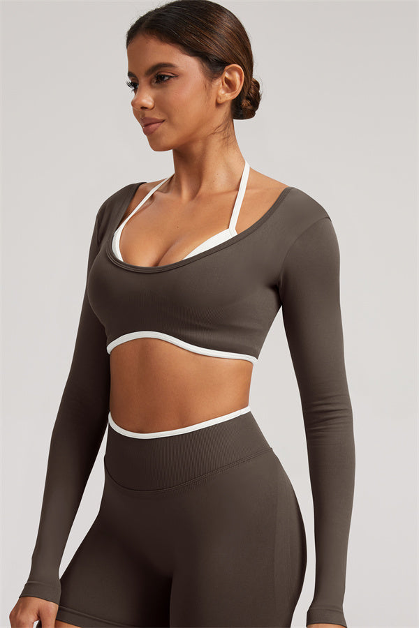 Stylish and functional, this long sleeve crop top features a layered look with contrast binding and shoulder straps, while the U-shaped back enhances your posture and highlights your back lines.