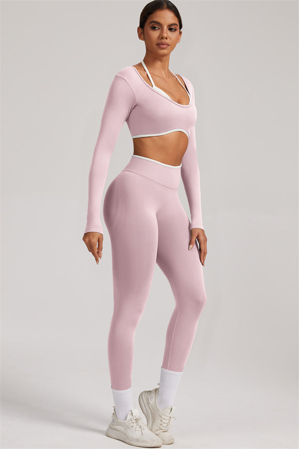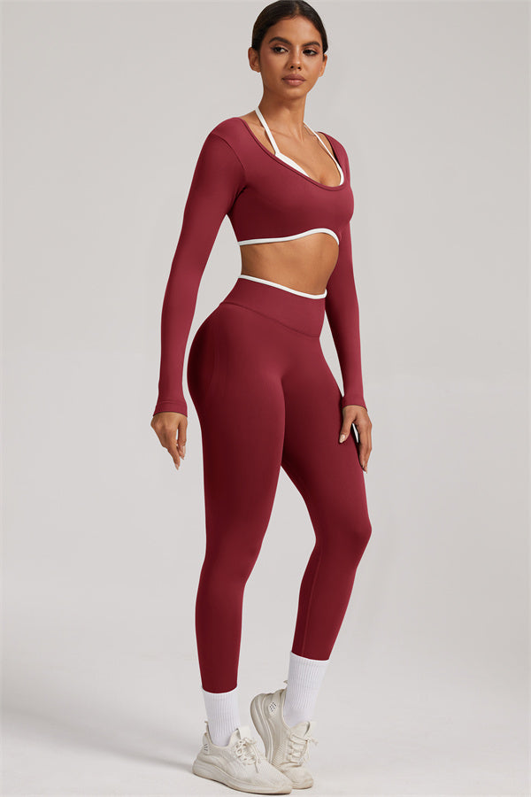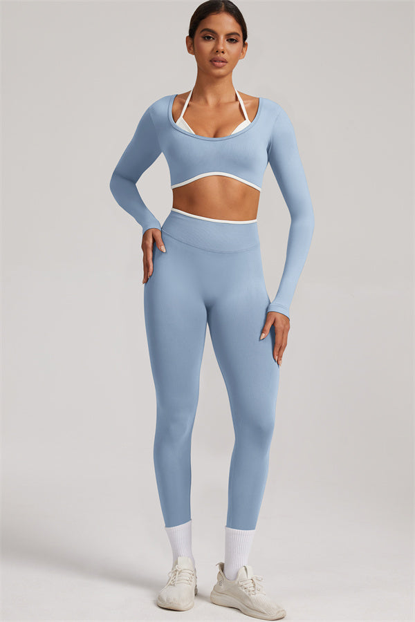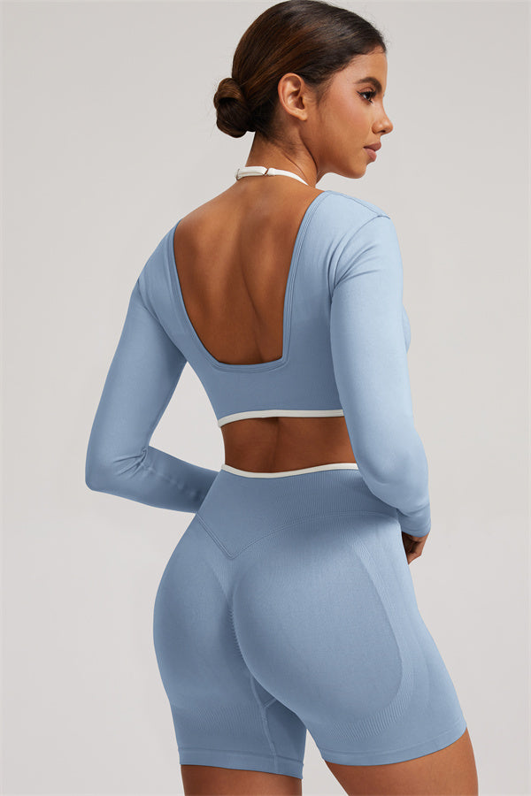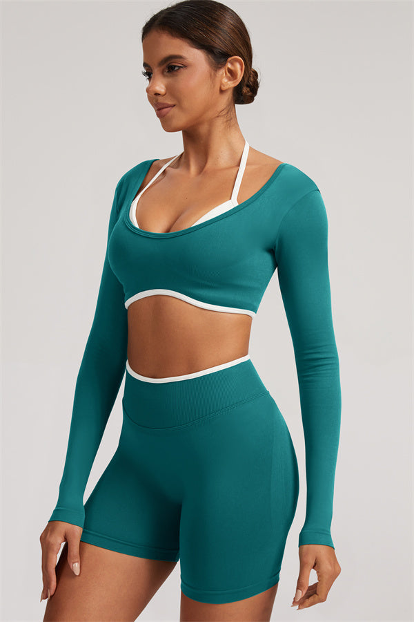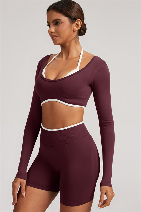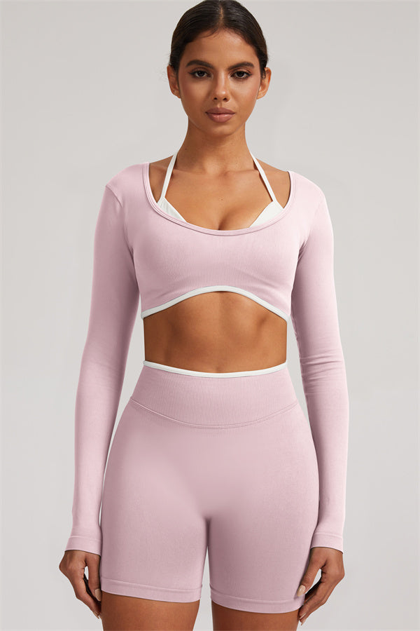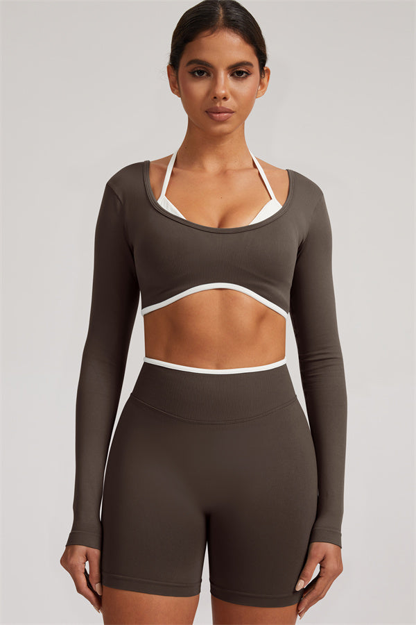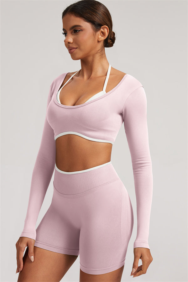 Stylish and functional, this long sleeve crop top features a layered look with contrast binding and shoulder straps, while the U-shaped back enhances your posture and highlights your back lines.