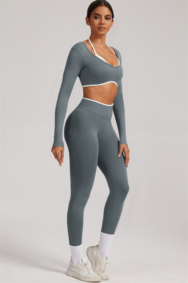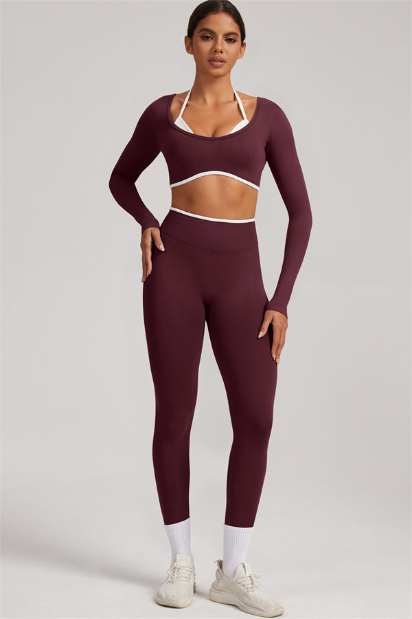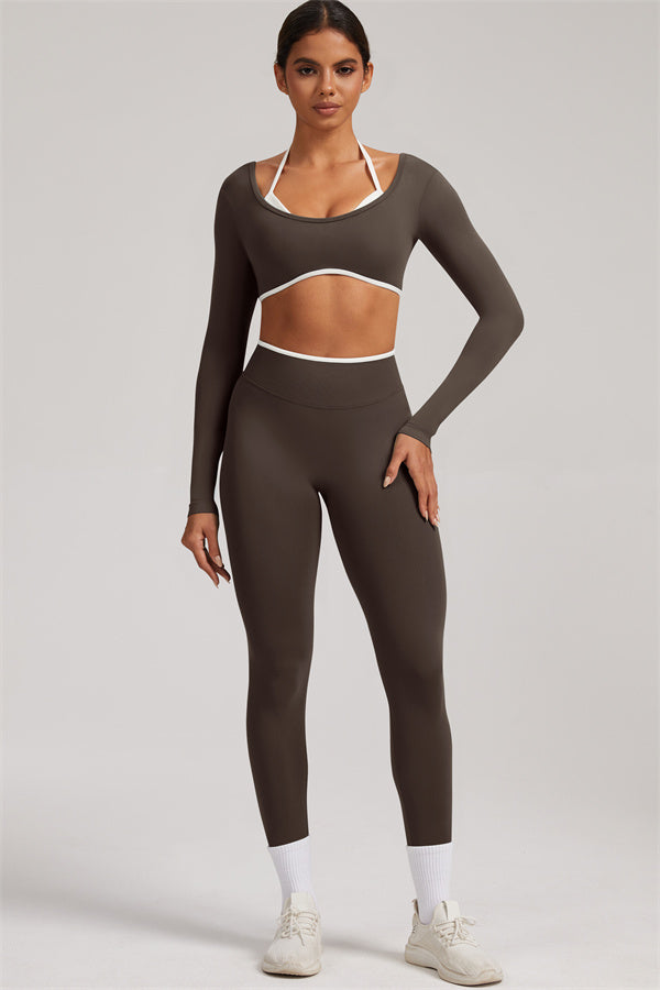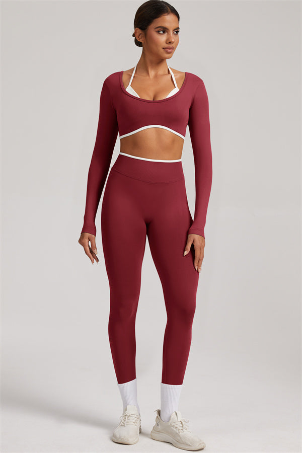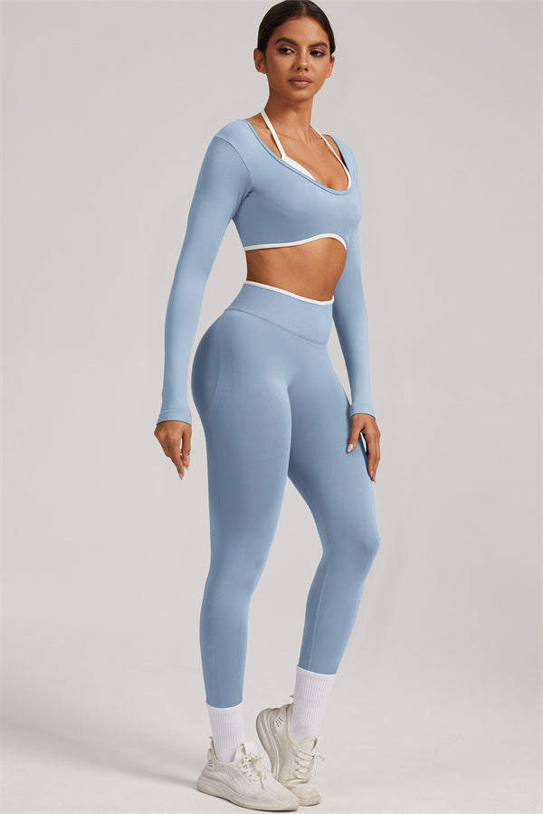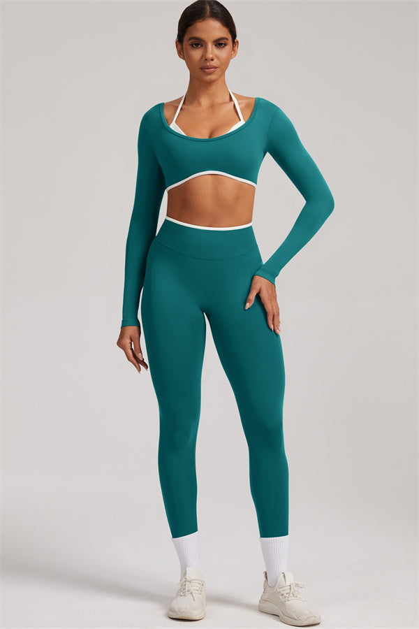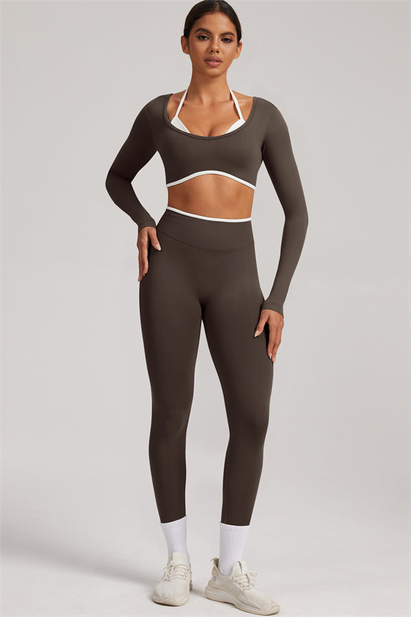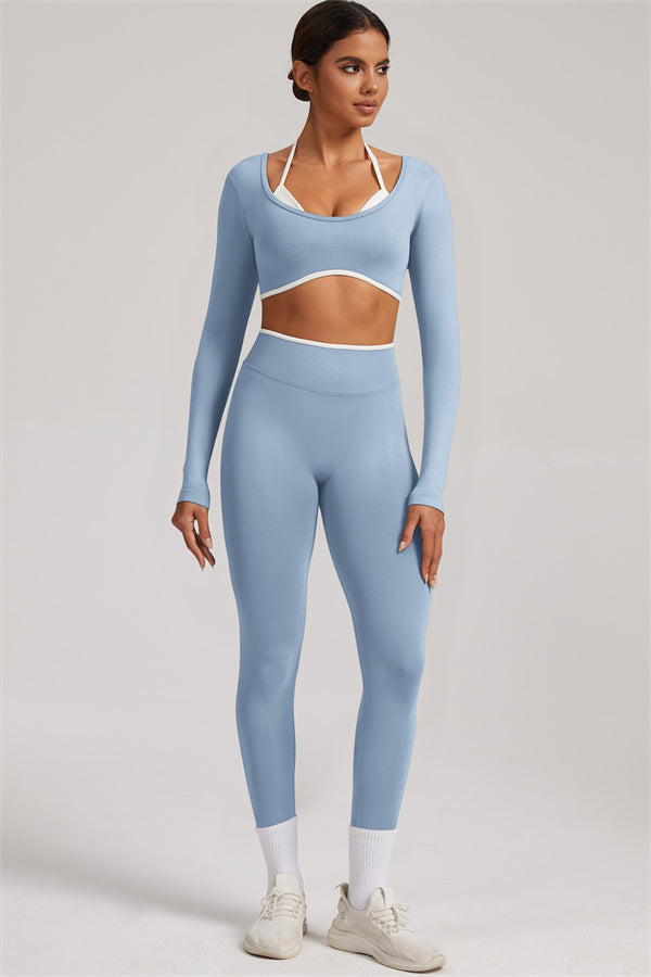 Stylish and functional, this long sleeve crop top features a layered look with contrast binding and shoulder straps, while the U-shaped back enhances your posture and highlights your back lines.
