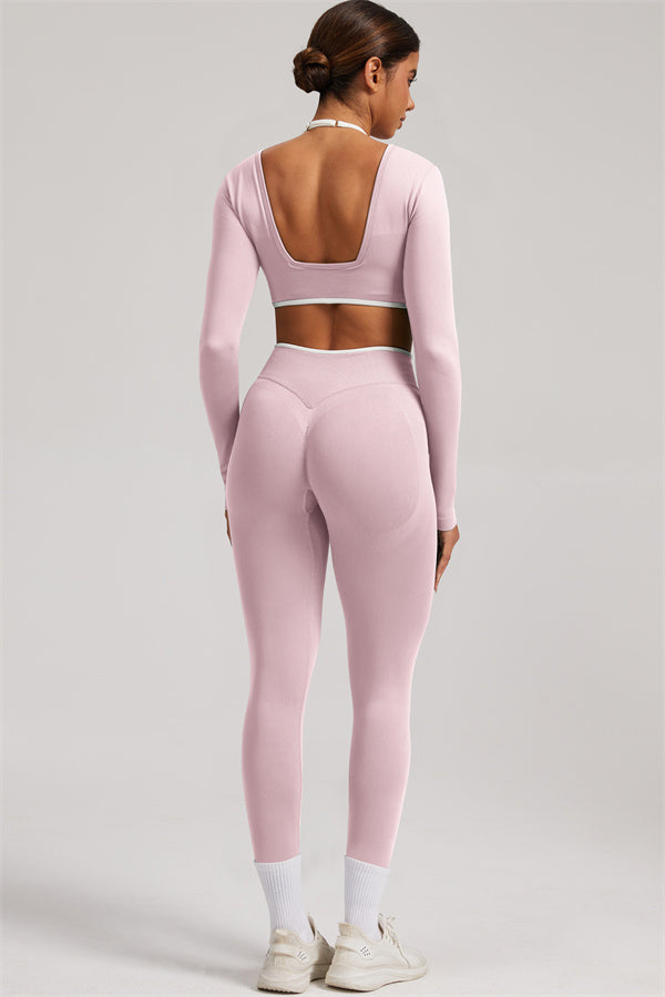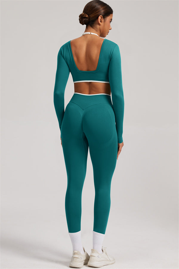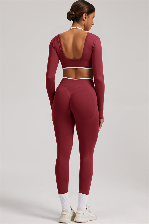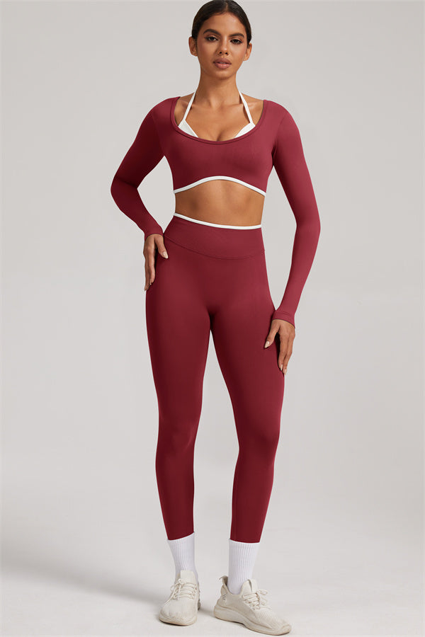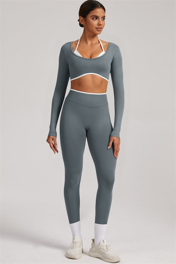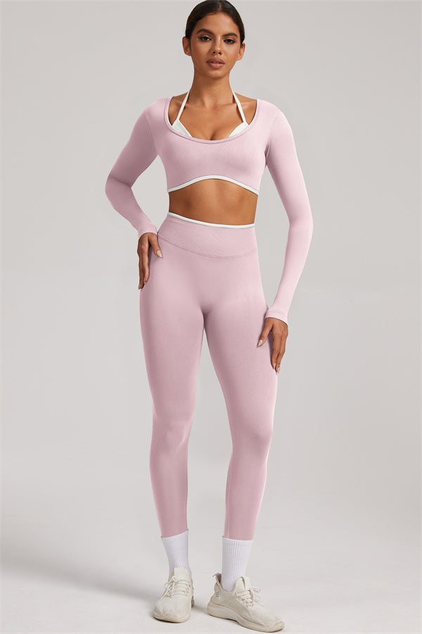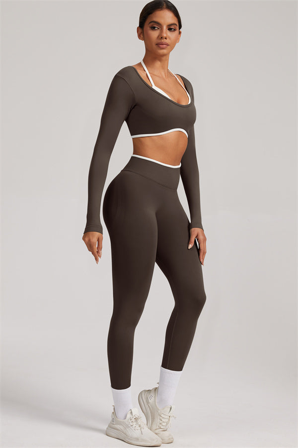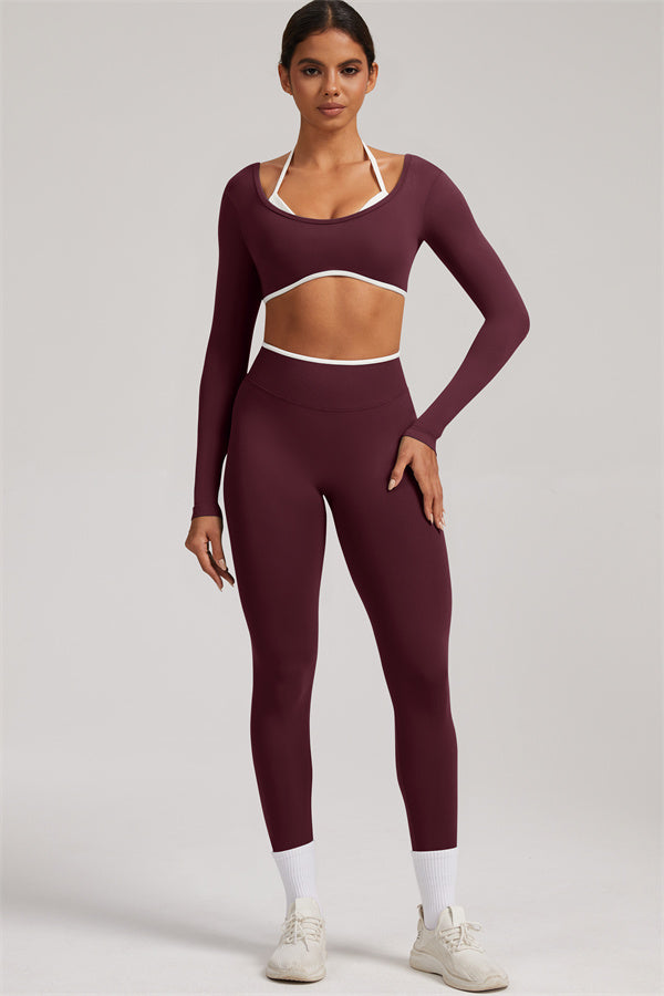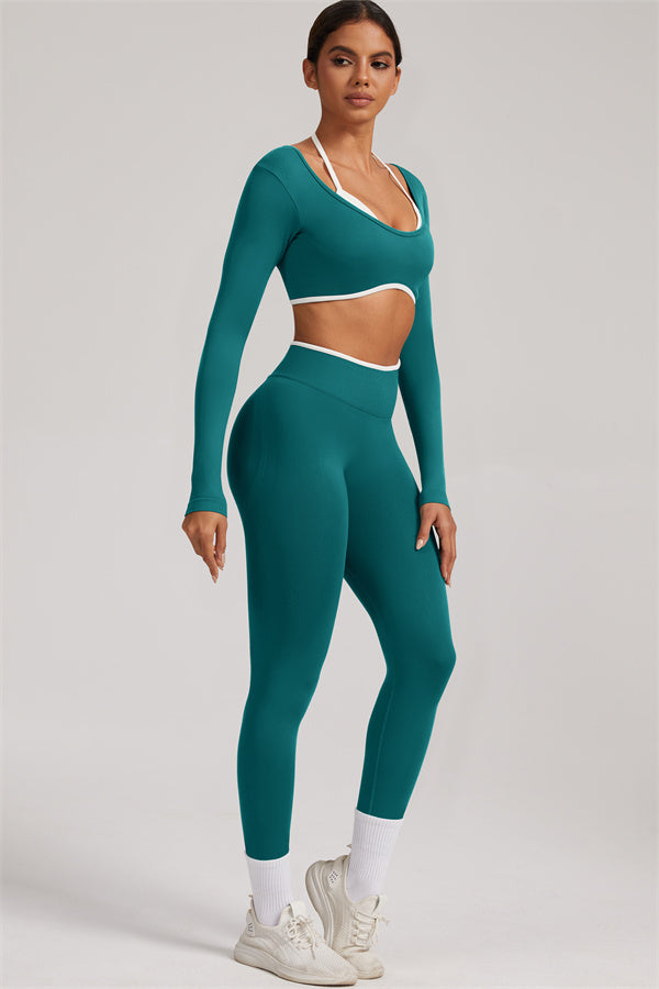 Stylish and functional, this long sleeve crop top features a layered look with contrast binding and shoulder straps, while the U-shaped back enhances your posture and highlights your back lines.
