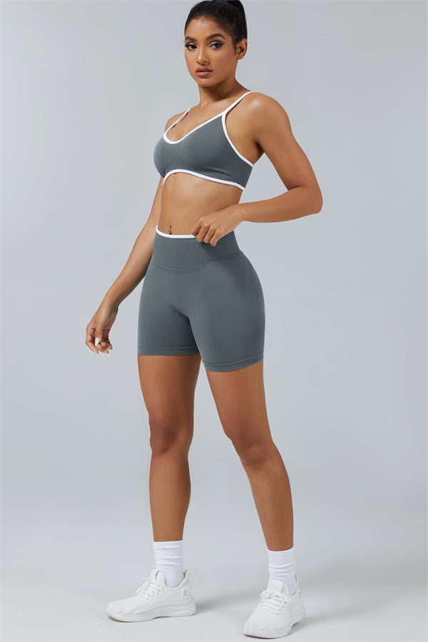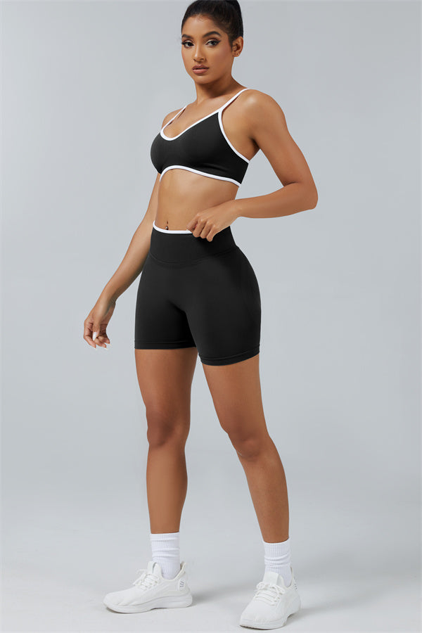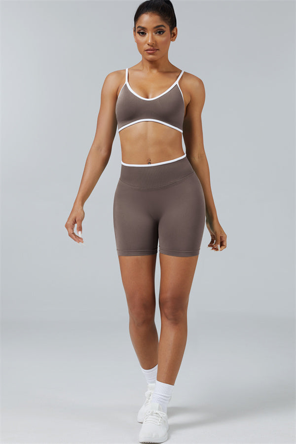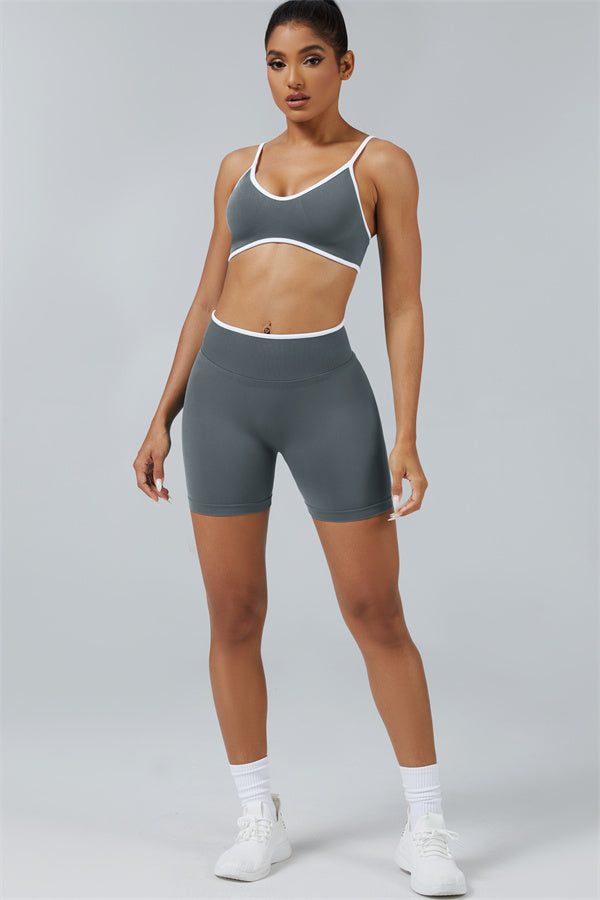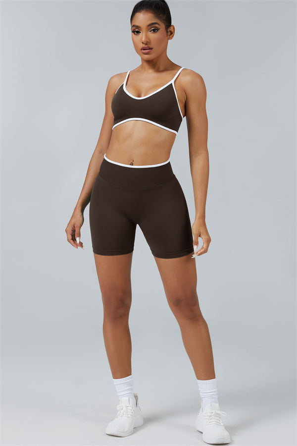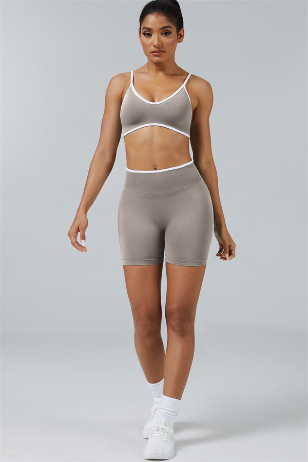 Elevate your workout style with this chic matching set, designed for both performance and fashion. The set includes a breathable sports bra and flattering shorts with sculpting details.