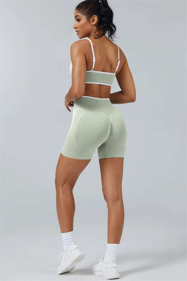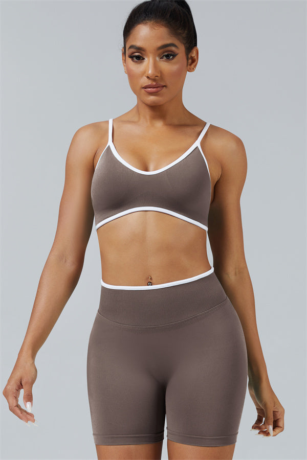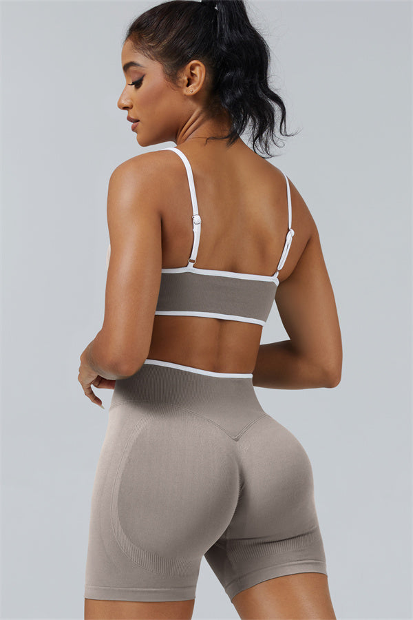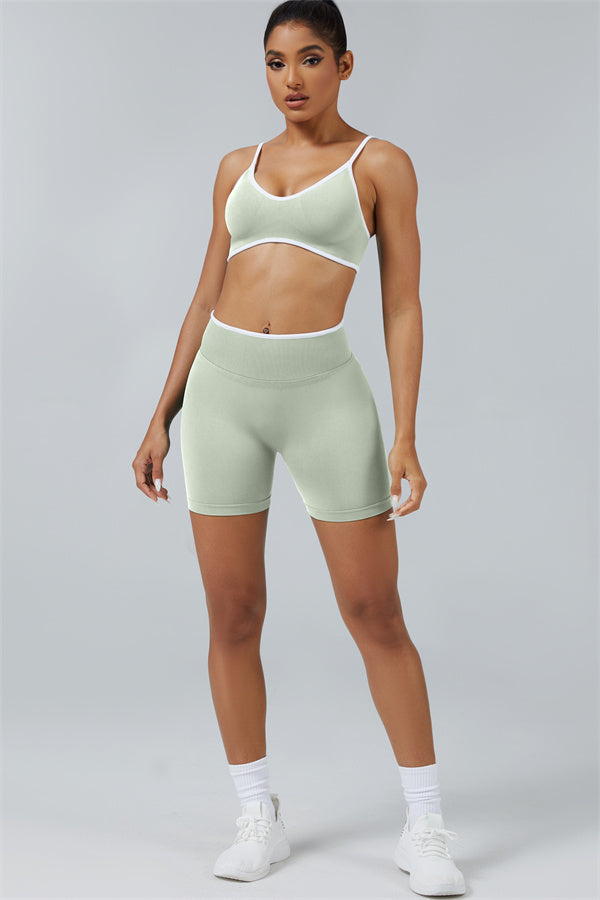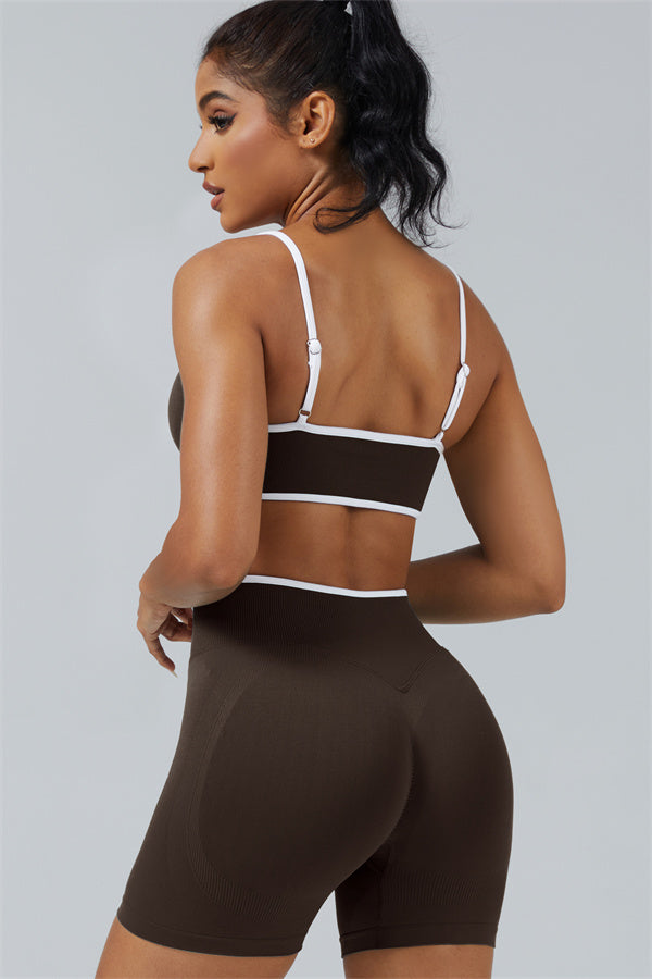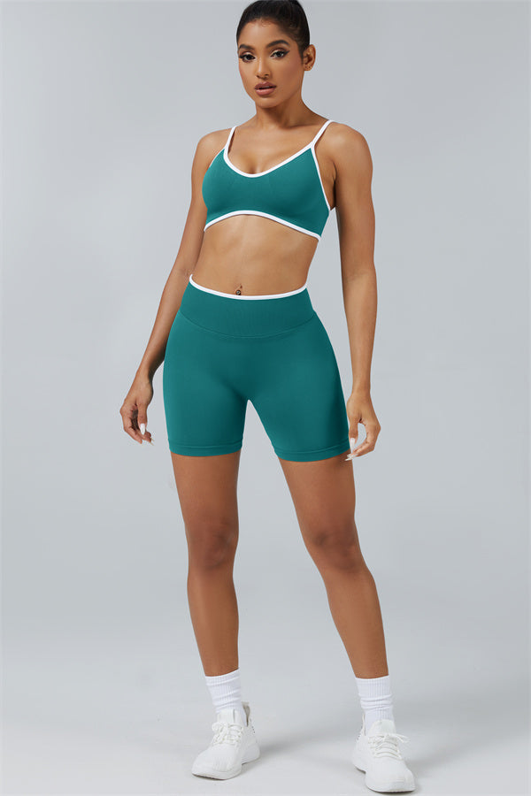 Elevate your workout style with this chic matching set, designed for both performance and fashion. The set includes a breathable sports bra and flattering shorts with sculpting details.