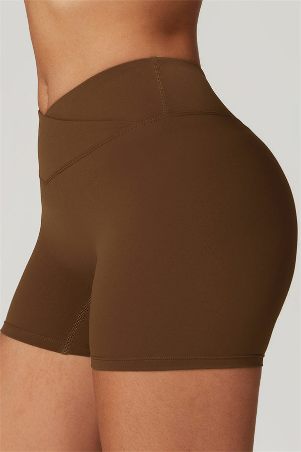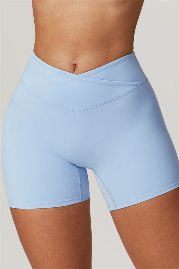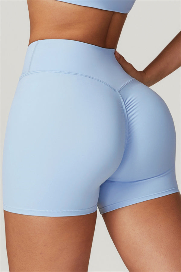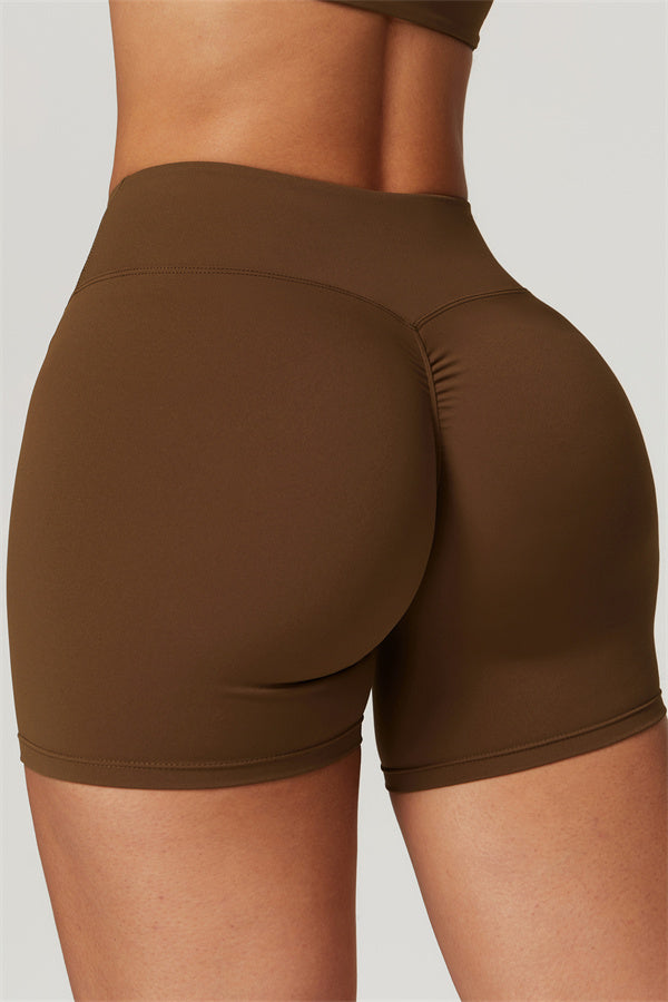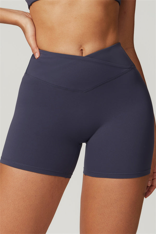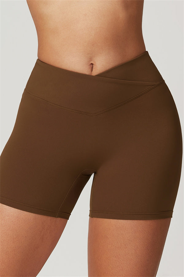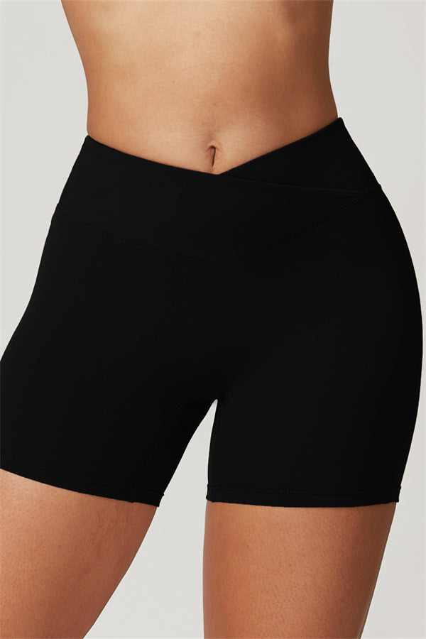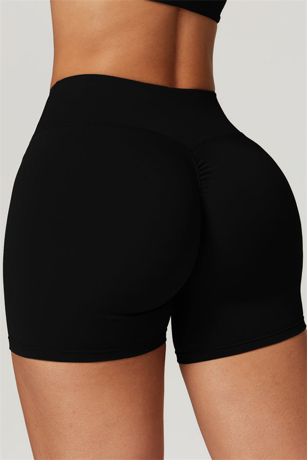 Elevate your workout wardrobe with these high-waisted shorts designed for both style and performance. The V-shaped cross-fold waistband provides a secure fit, ensuring the shorts stay in place no matter how intense your activity. The sculpting design enhances your natural curves, giving your glutes a lifted and rounded appearance.