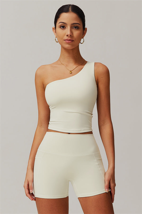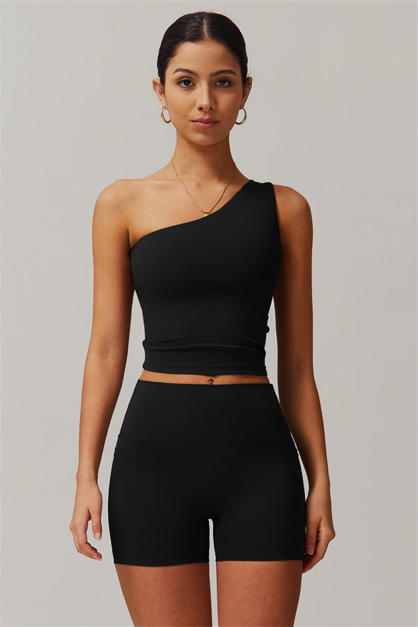 Elevate your activewear game with this stylish and functional matching set, featuring a one-shoulder crop top and high-performance shorts. The asymmetrical one-shoulder design enhances your neckline, creating an elegant and elongated look, while removable padding ensures customizable support for both workouts and casual wear.