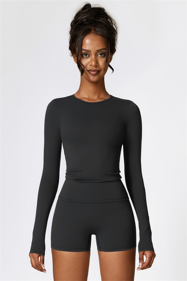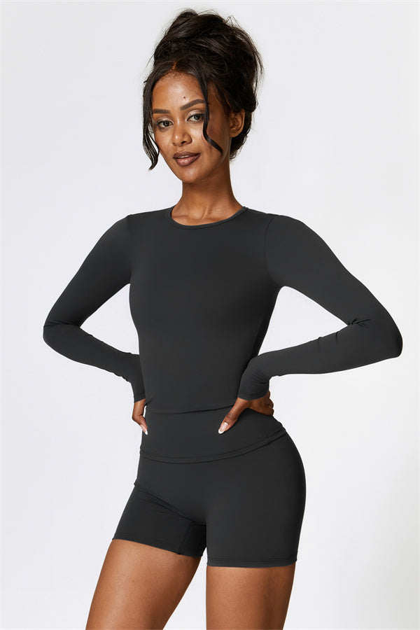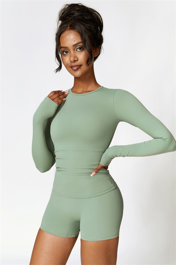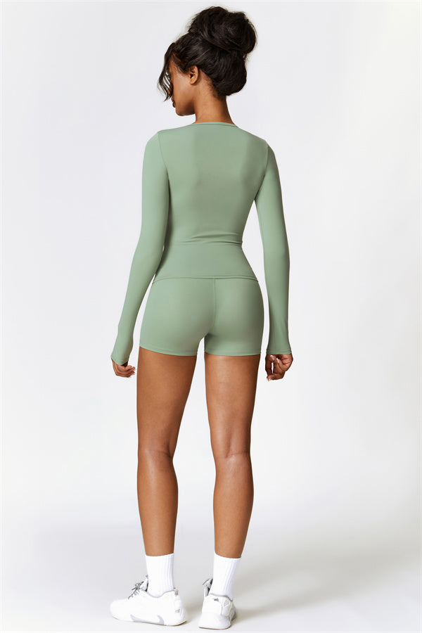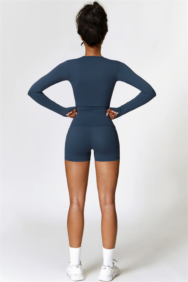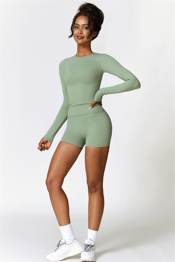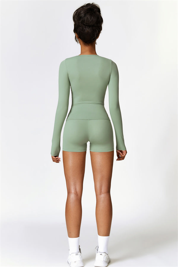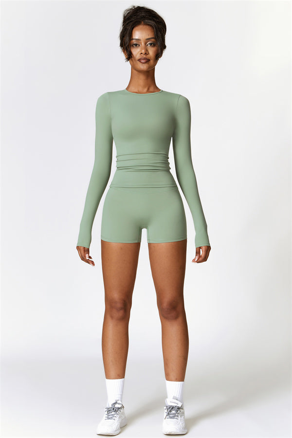 This matching set, featuring a long sleeve top and shorts, combines style, comfort, and performance. The long sleeve top is designed with an extended hem that provides a gentle tummy control effect, helping to smooth and conceal the midsection. The strategically crafted shorts enhance your natural shape, effortlessly highlighting a flattering, peachy silhouette.