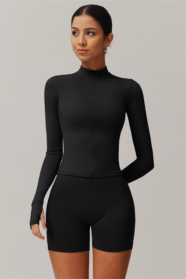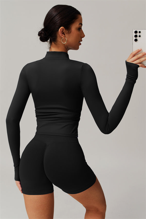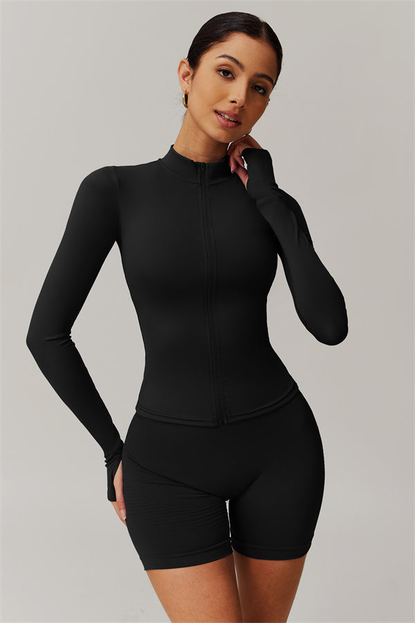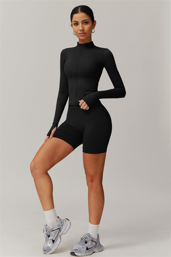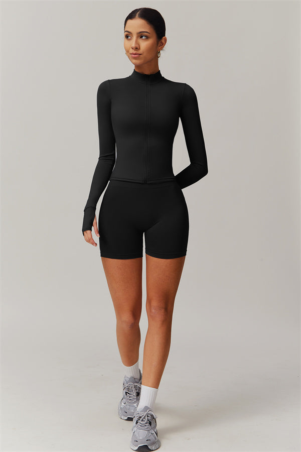 Stay stylish and functional with this sleek matching set, combining a form-fitting jacket and sculpting shorts to elevate your activewear game. The jacket features a high-neck zip design, offering adjustable coverage to protect against wind while exuding a sporty, edgy vibe. Its slim-fit silhouette highlights your waistline, while the extended sleeves with thumbholes provide added grip and full hand protection during movement.